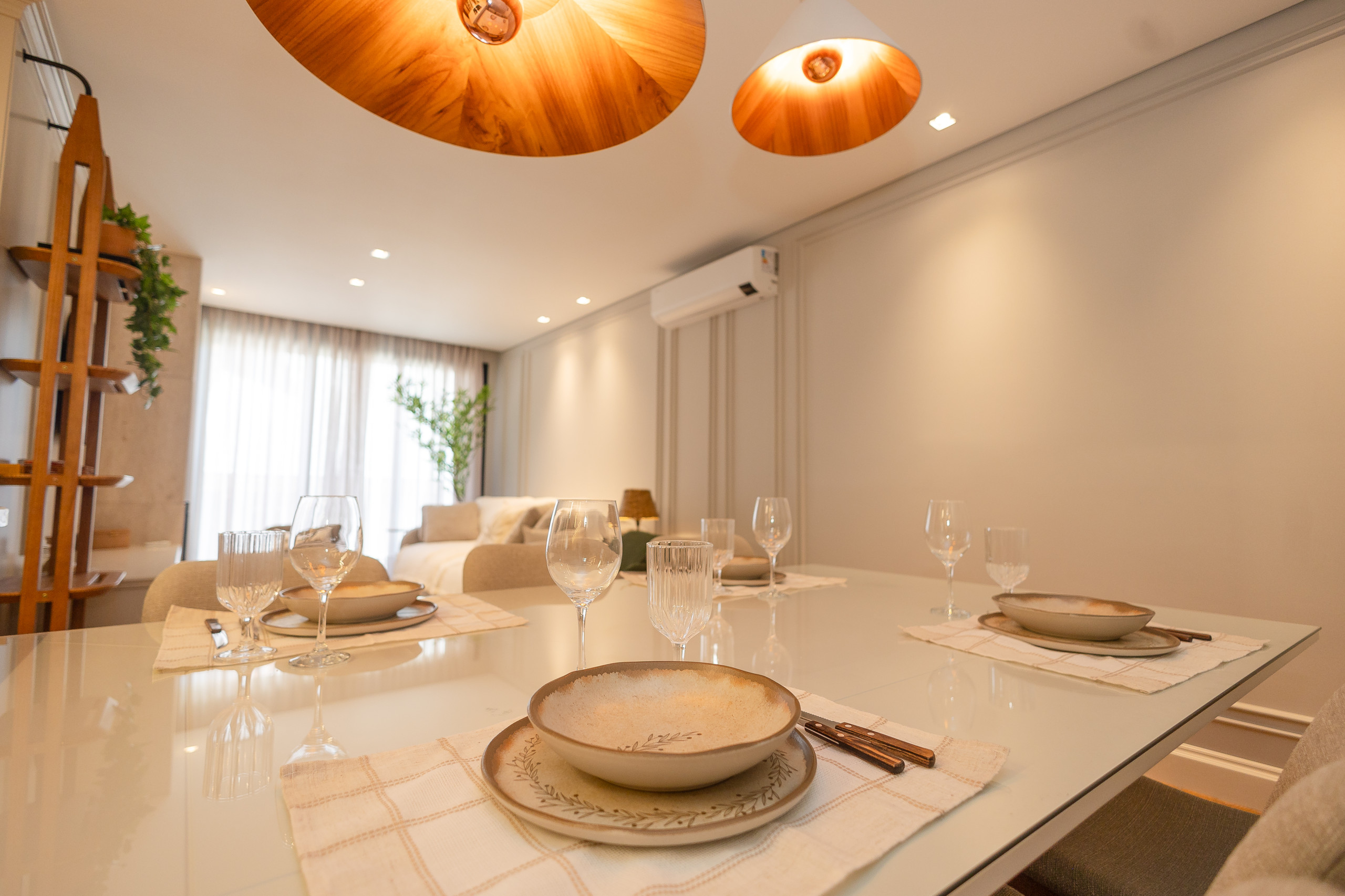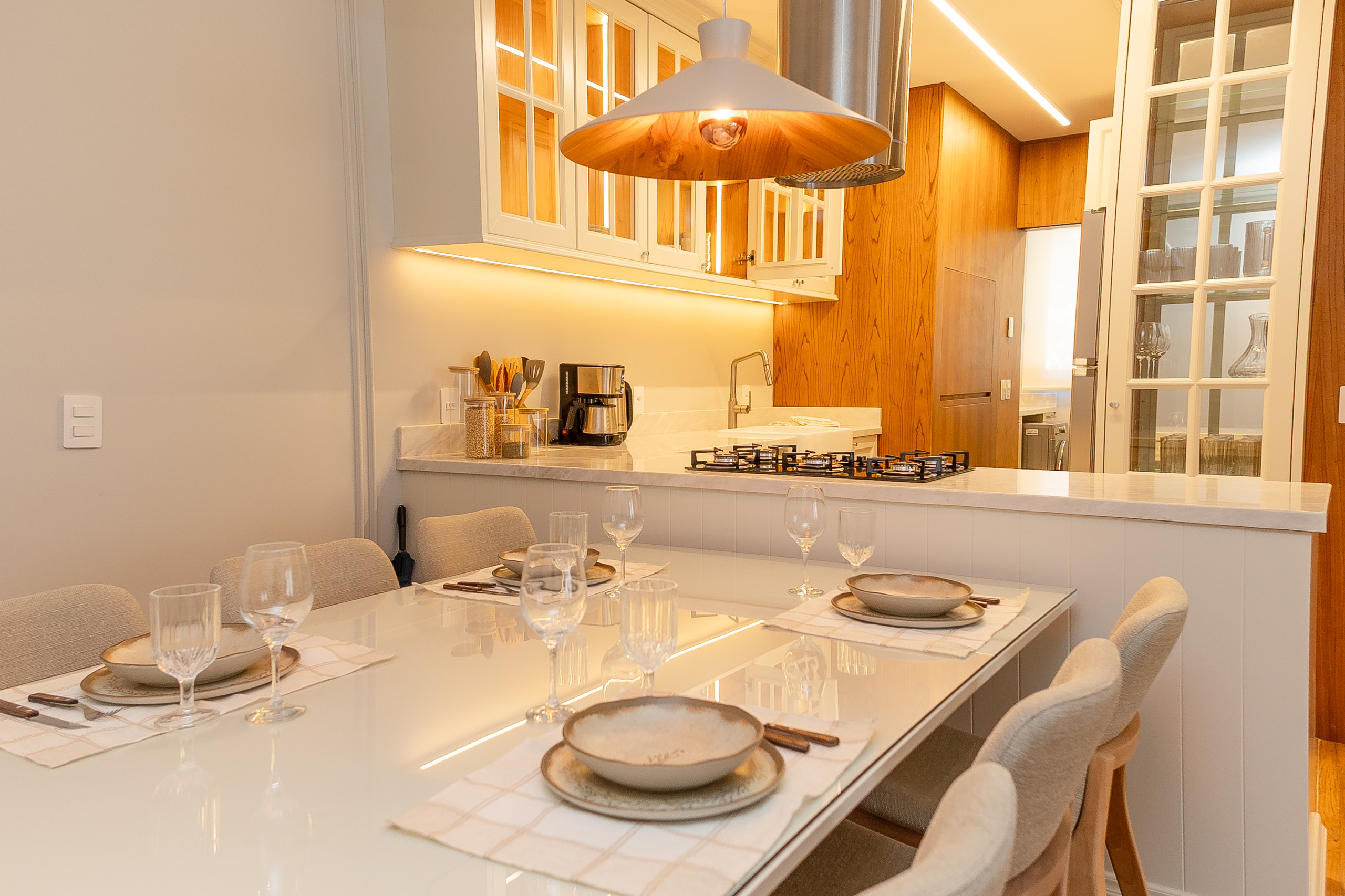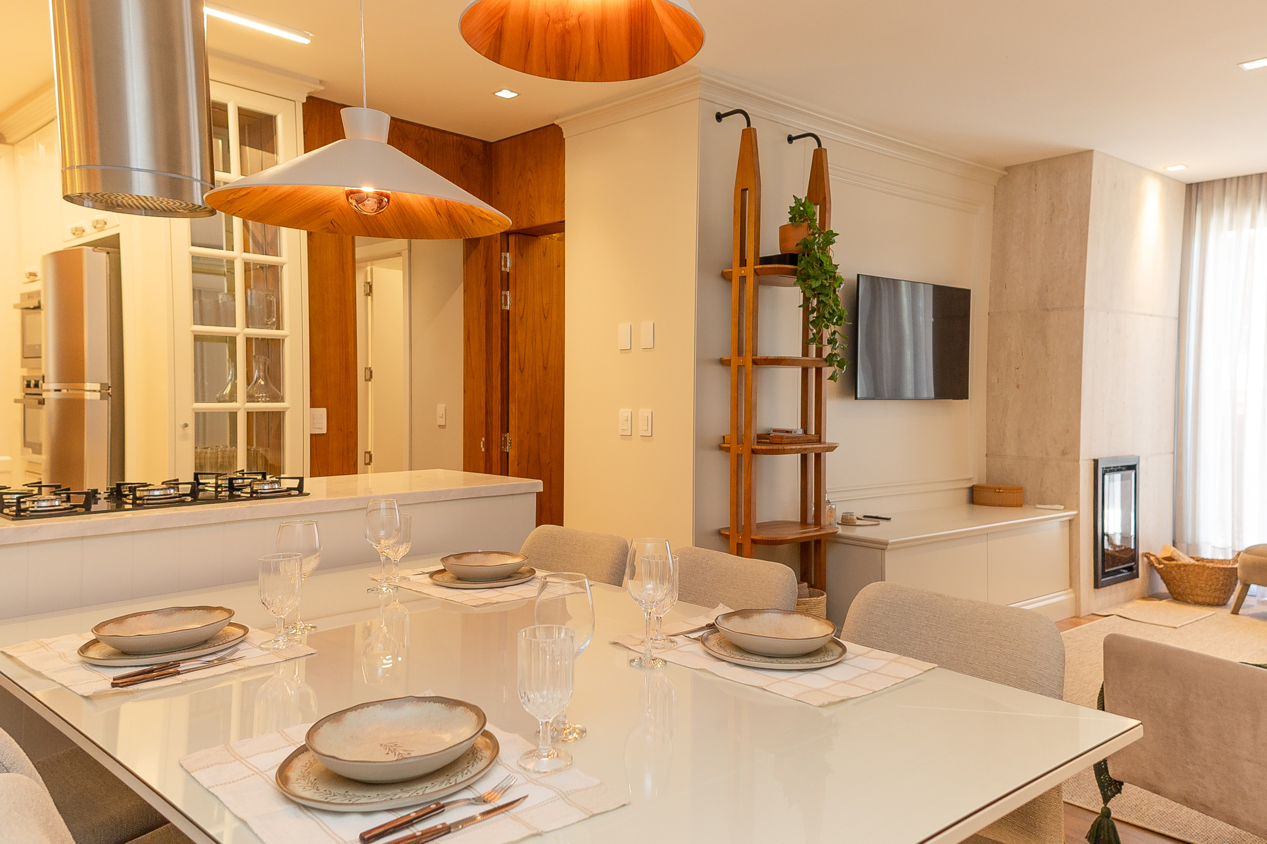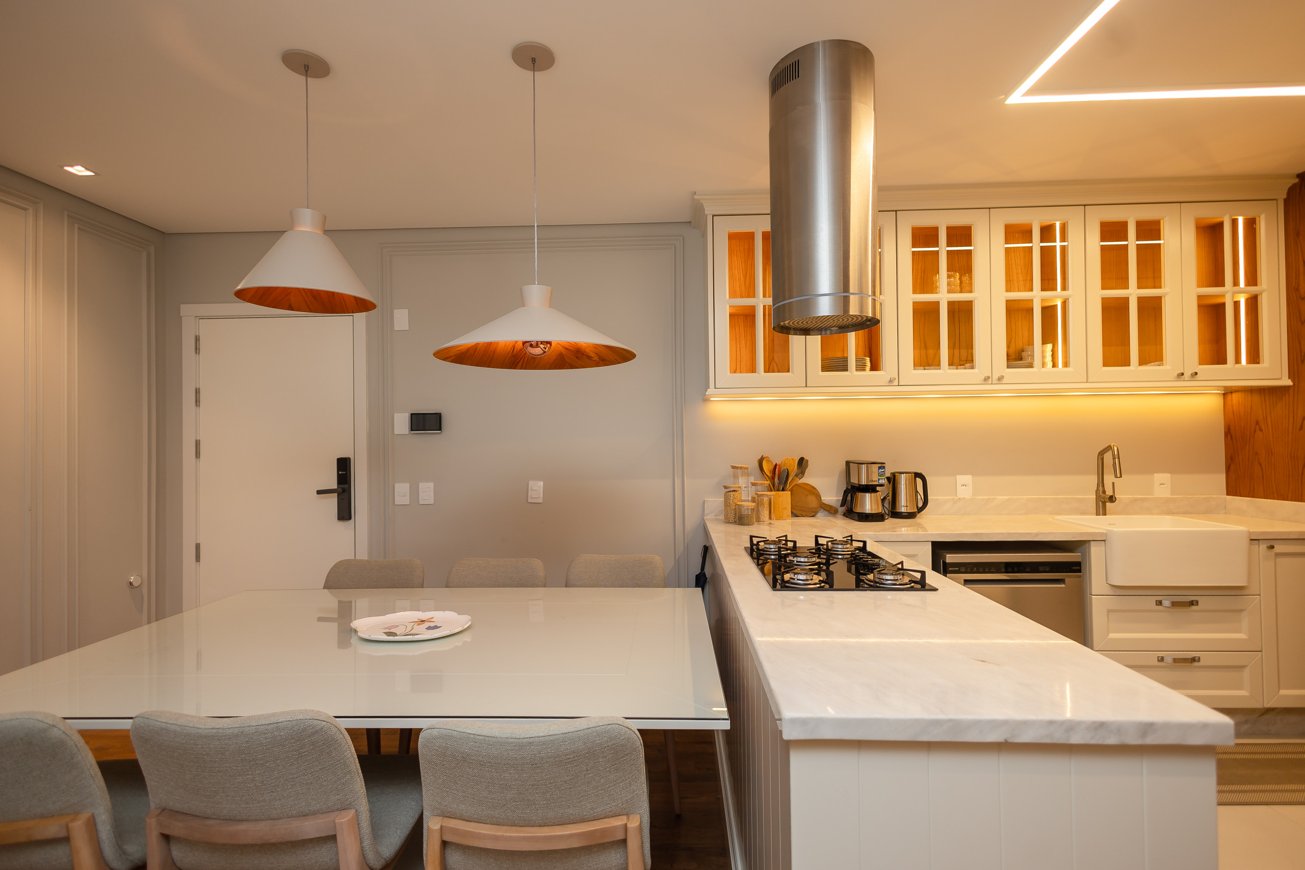 The complete kitchen has dishwasher, barbecue grill, refrigerator, coffee maker, sandwich maker, microwave, cooktop and stove. At the table, up to 06 guests can sit for meals or to simply enjoy a hot chocolate or a wine. The apartment also has a laundry room with washer and dryer.