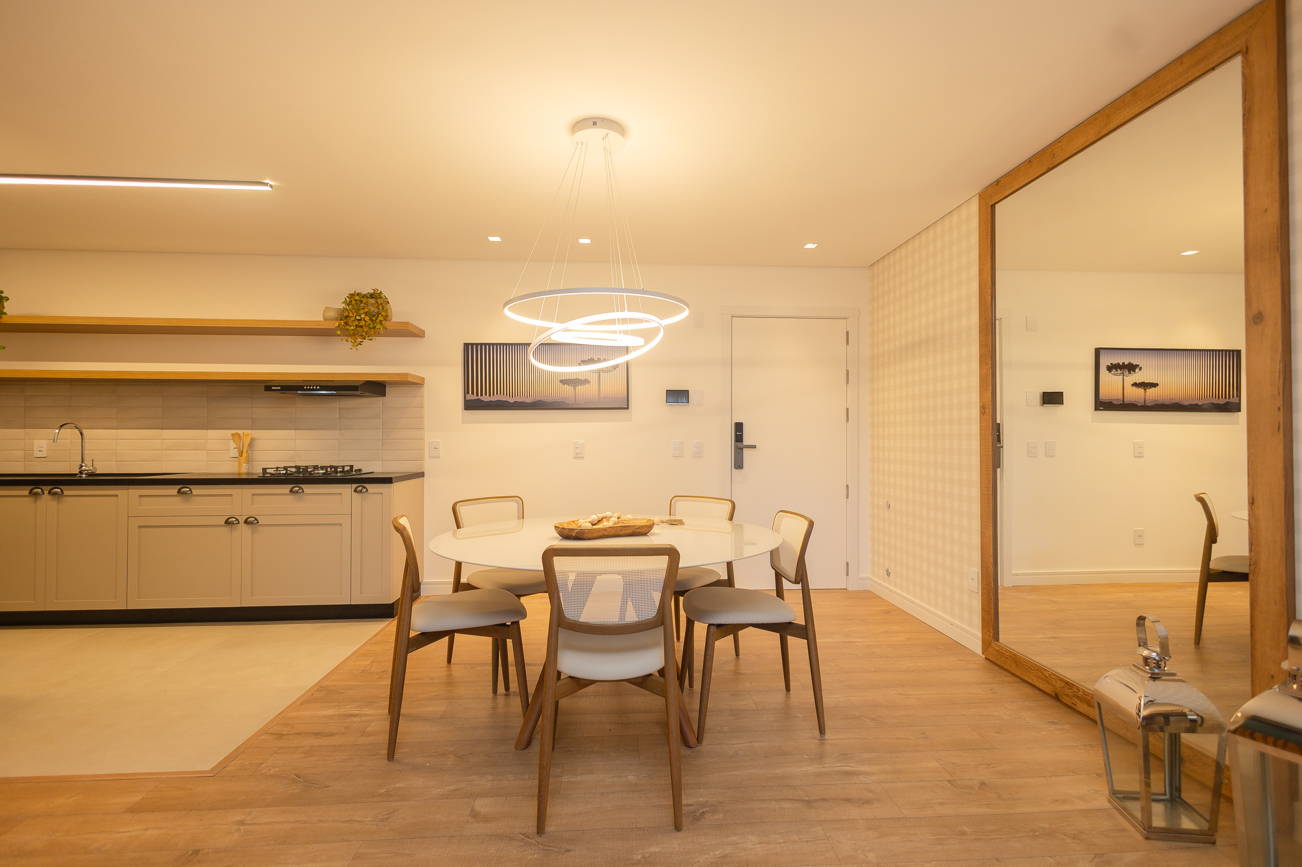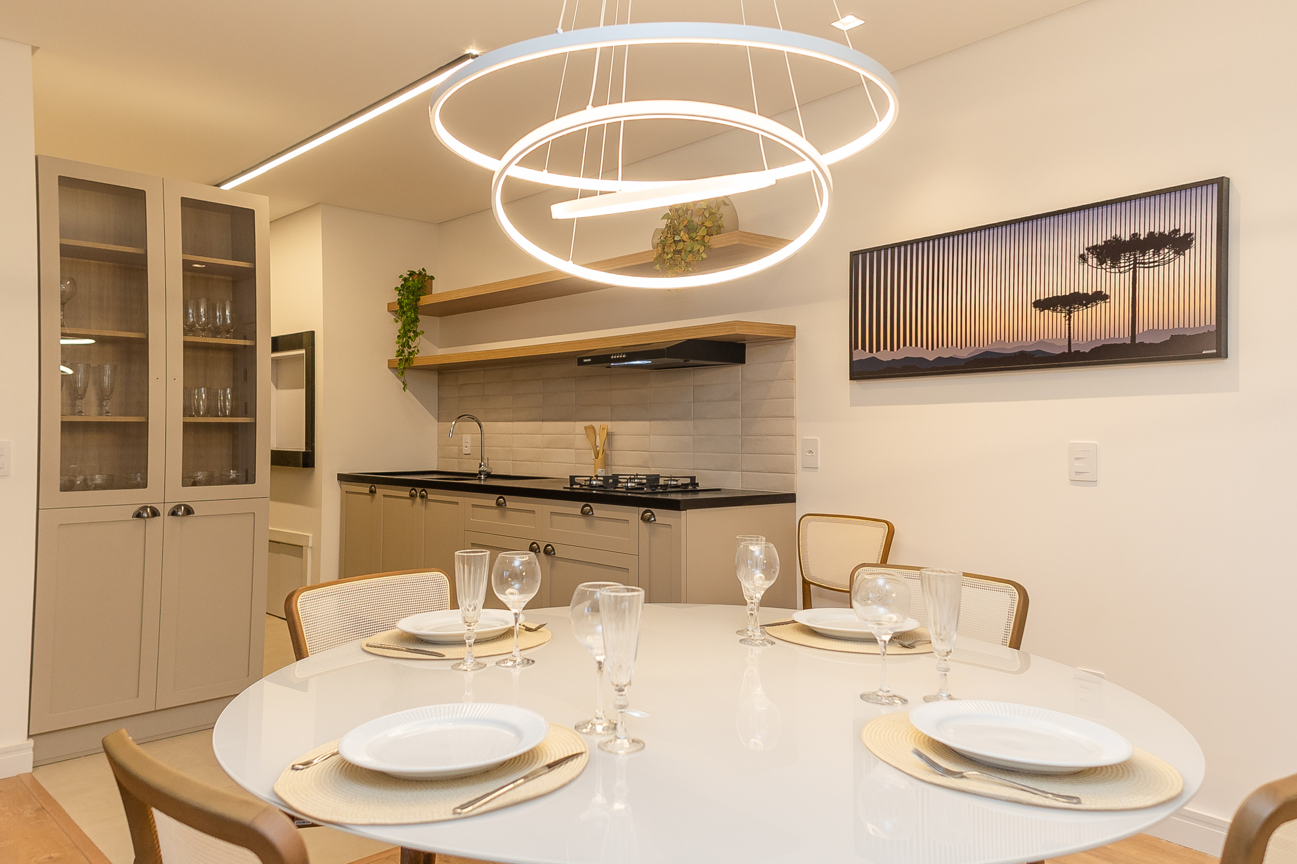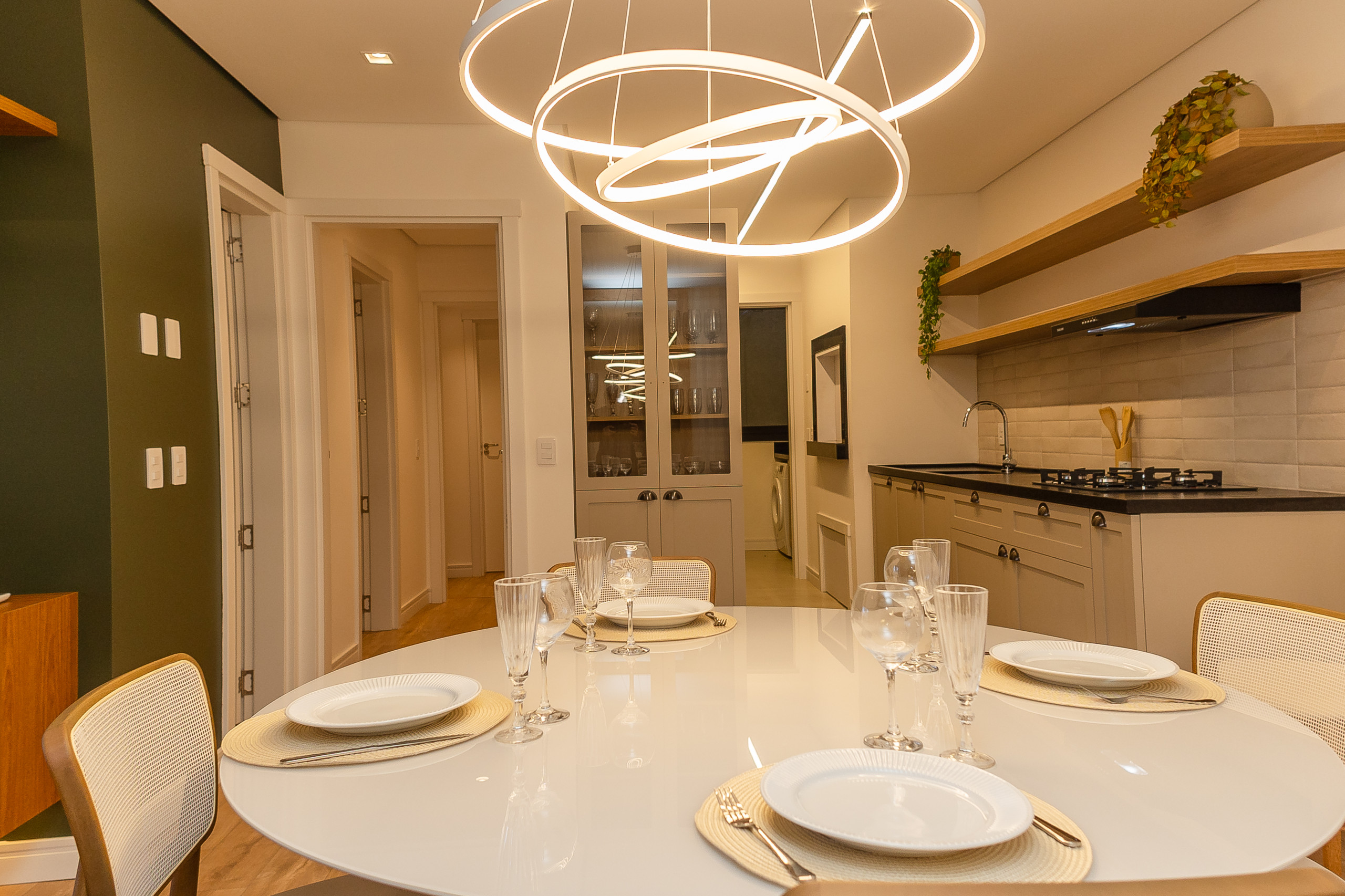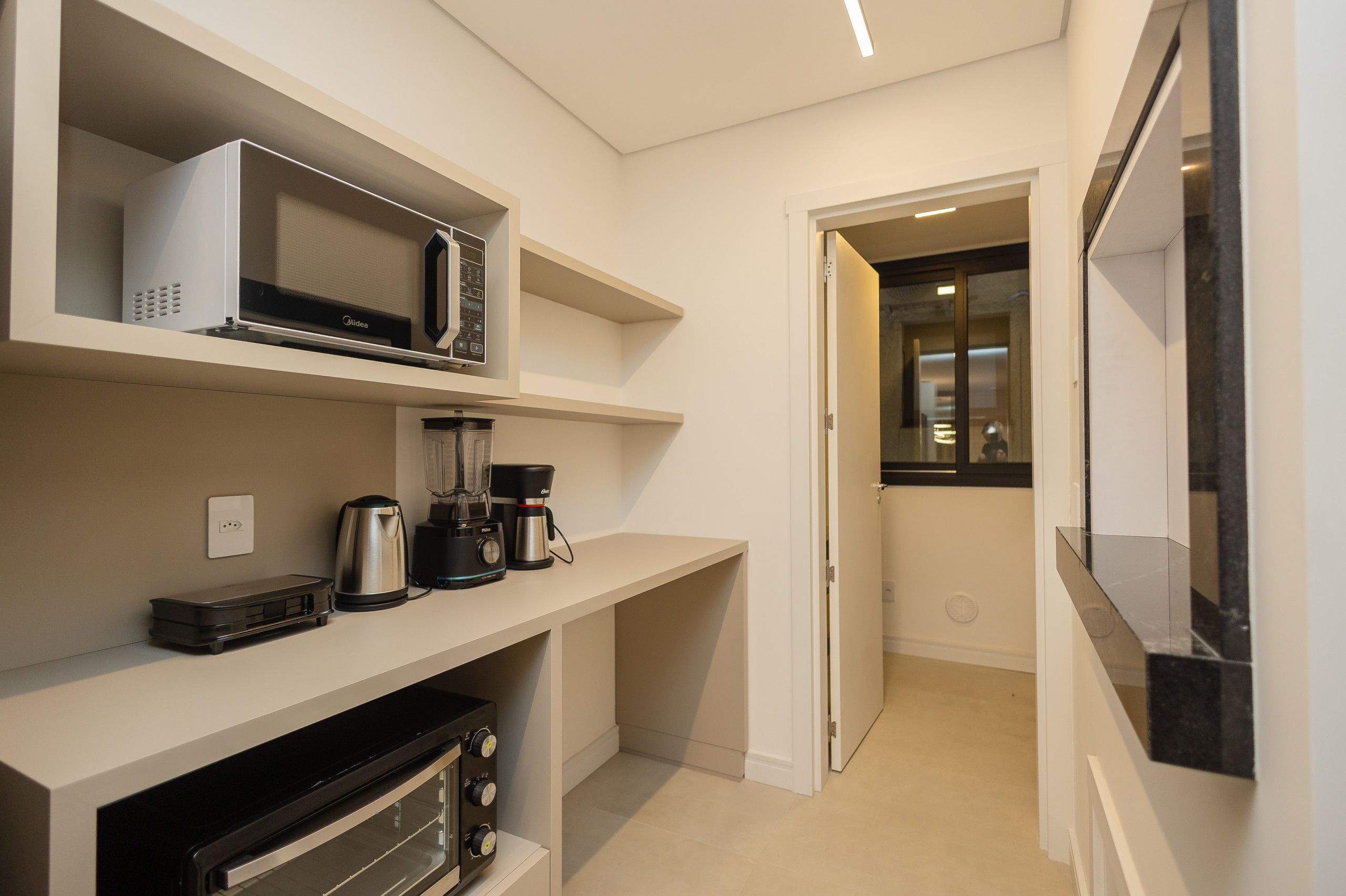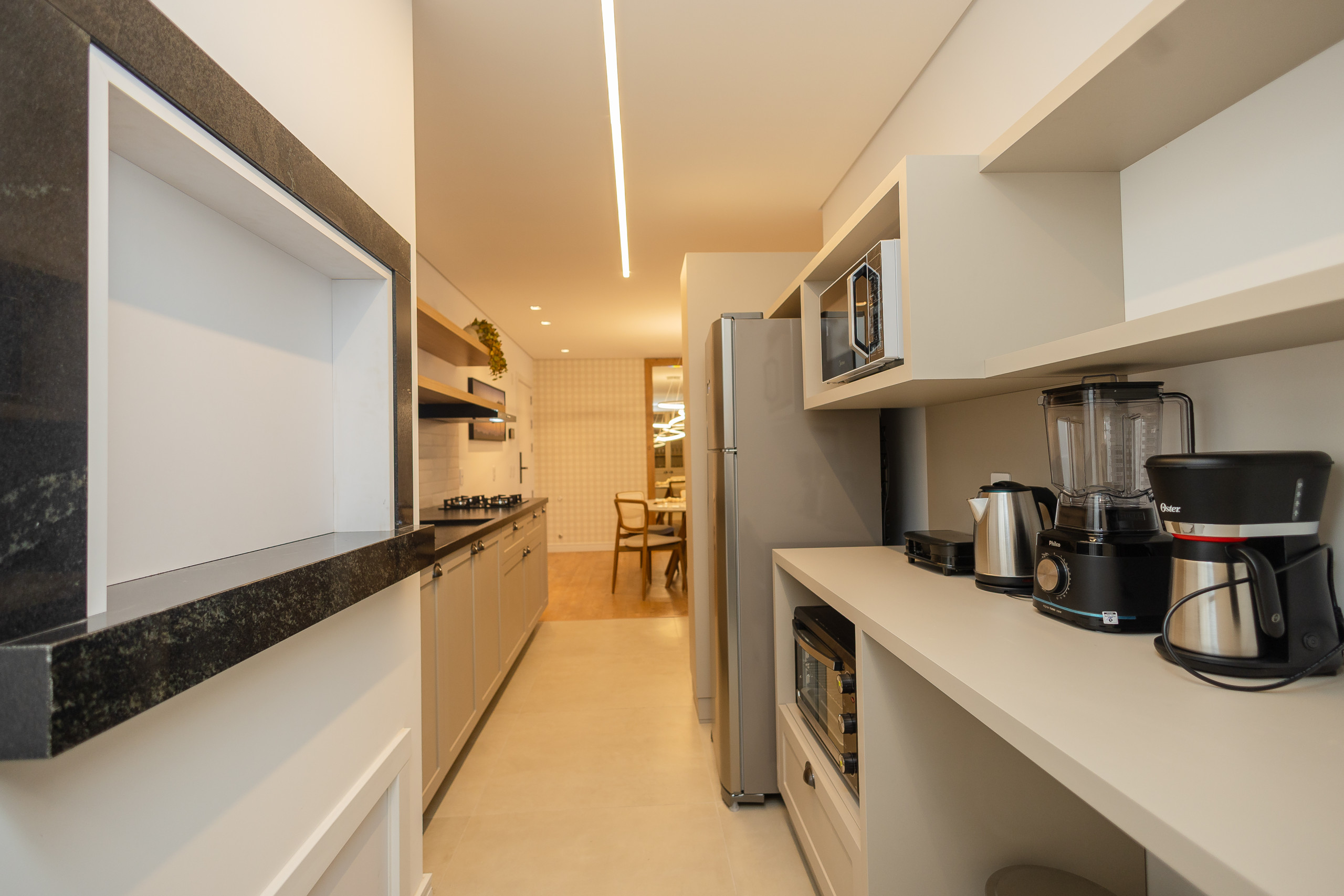 The complete kitchen has a barbecue grill, refrigerator, coffee maker, sandwich maker, microwave, cooktop and stove. At the table, up to 06 guests can sit for meals or simply enjoy a hot chocolate or a wine. The apartment also has a laundry with washer and dryer.