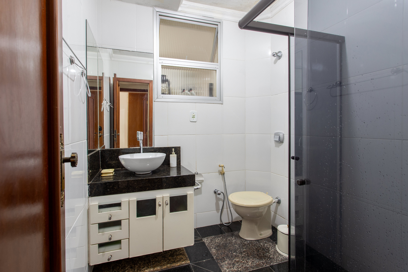 - Bathroom with electric shower, glass box, wardrobe, mirror and basic hygiene items