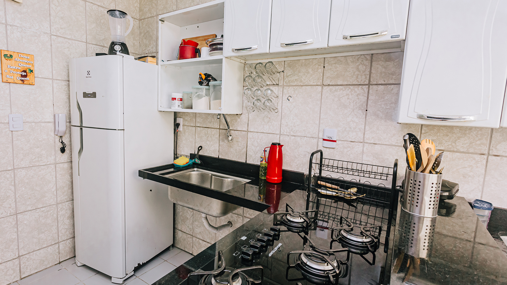- Kitchen equipped with stone stove, refrigerator, sandwich maker, fryer and blender, as well as plates, glasses, cutlery and various utensils (except oil and salt)