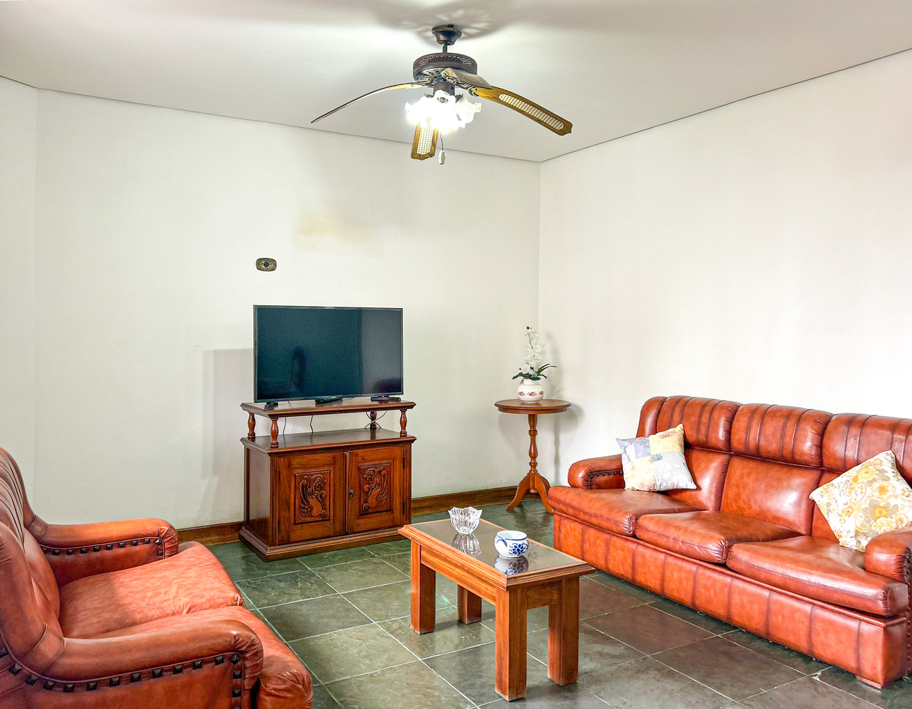 - The living room is equipped with a chair, coffee table, sofa and ceiling fan
