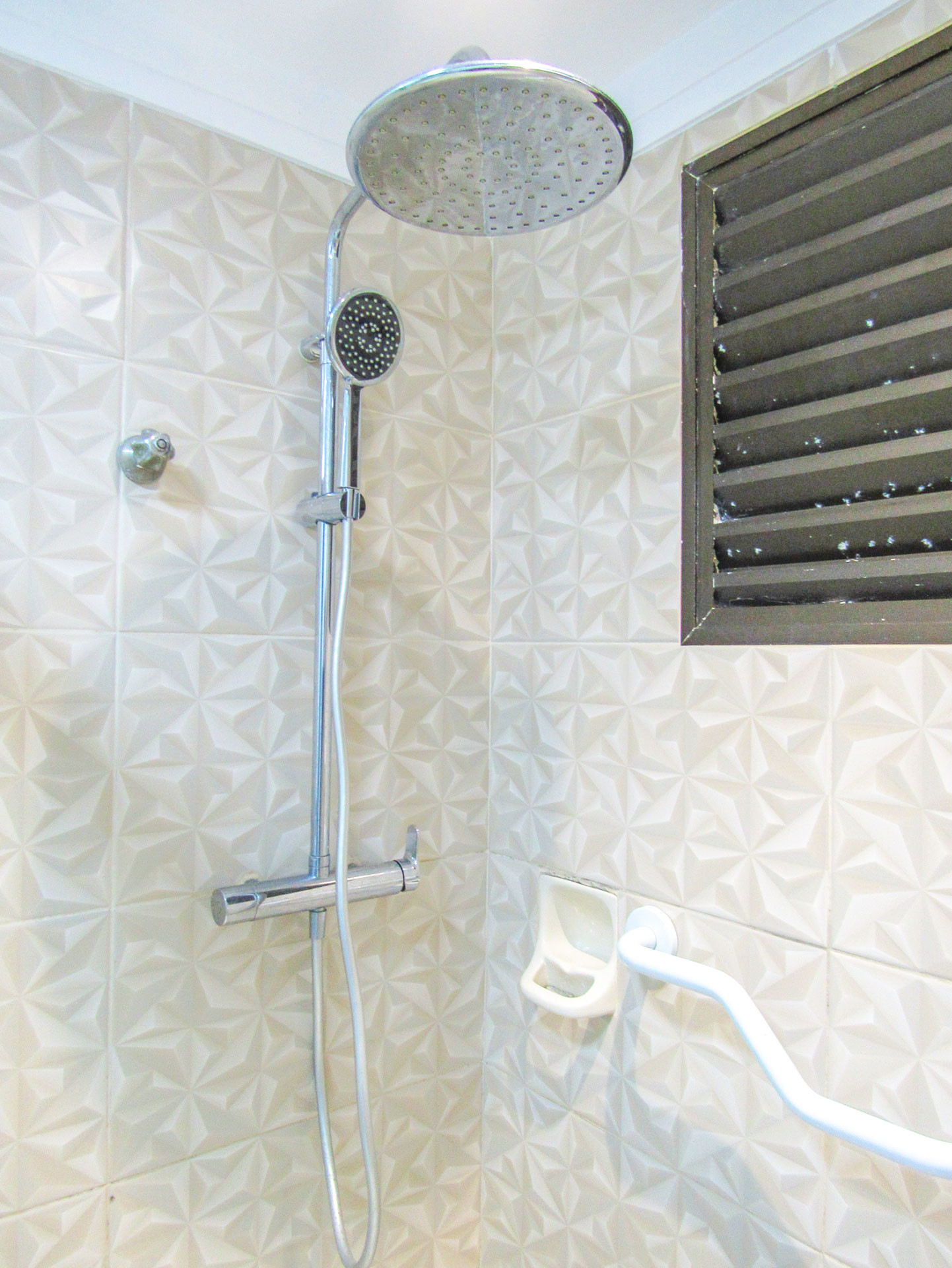 - The bathroom has a heated shower, glass shower, cabinet and mirror