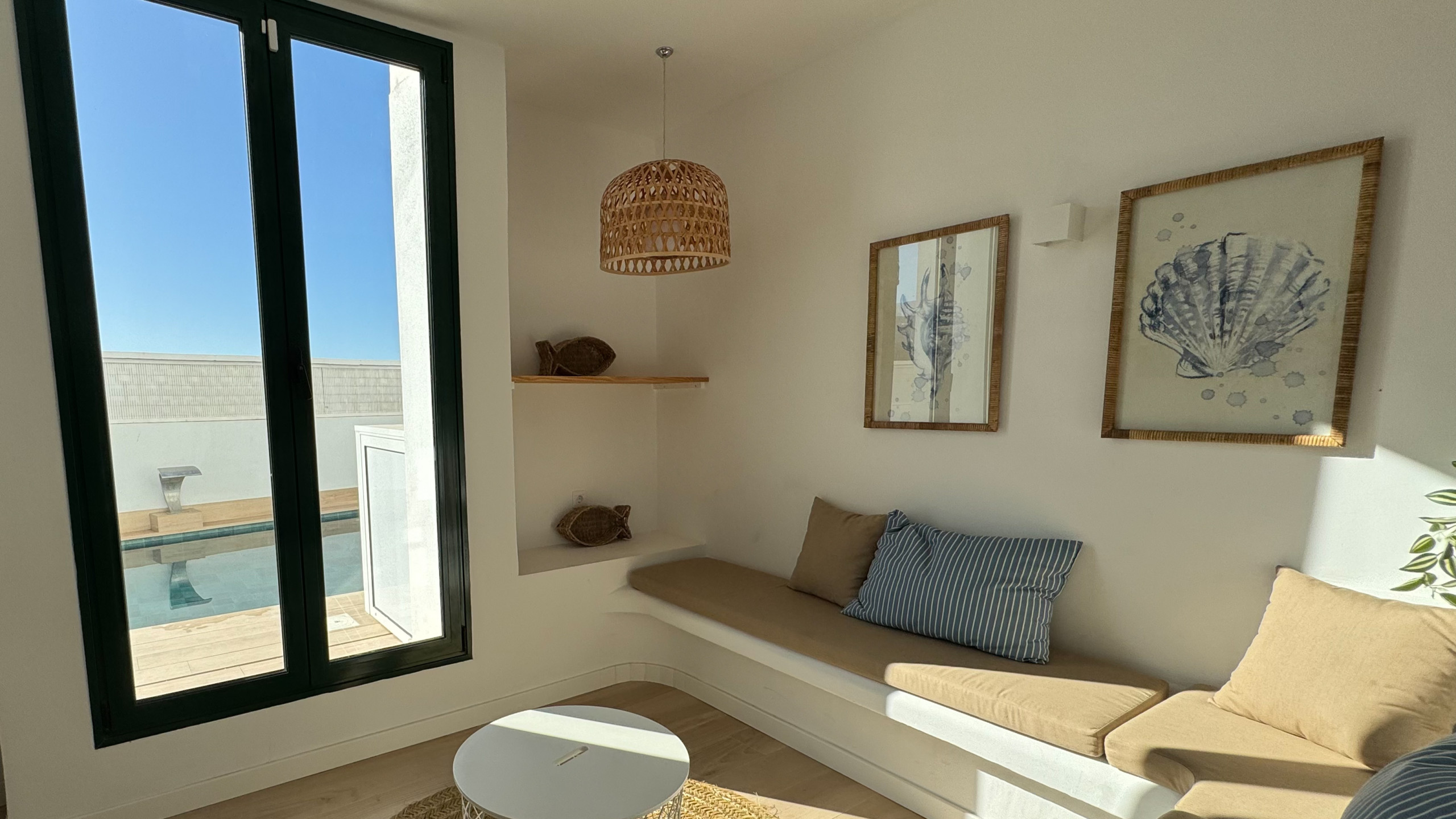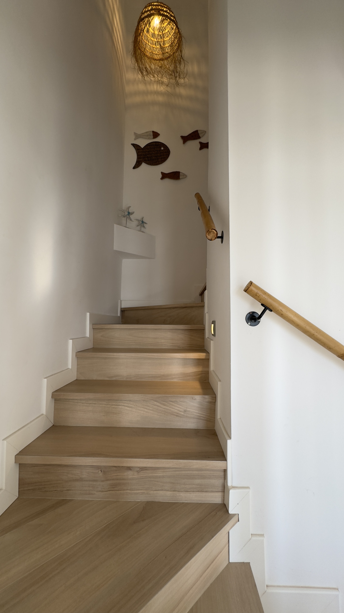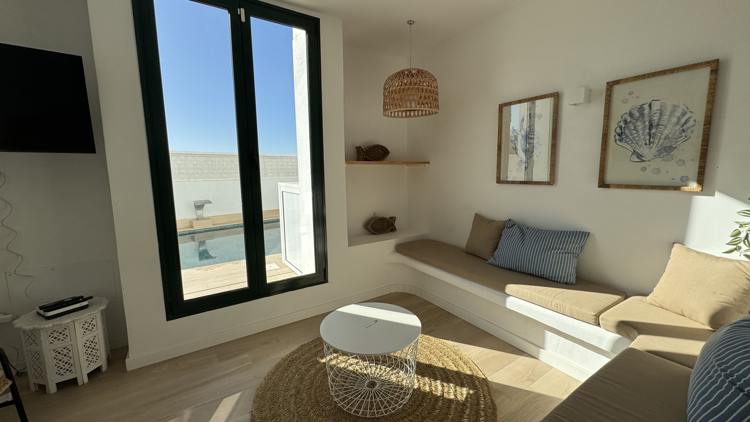 On the first floor, there are two additional bedrooms, a full bathroom with a shower, an independent toilet, and a small living room with a sofa bed and access to a balcony where one can enjoy the sun.