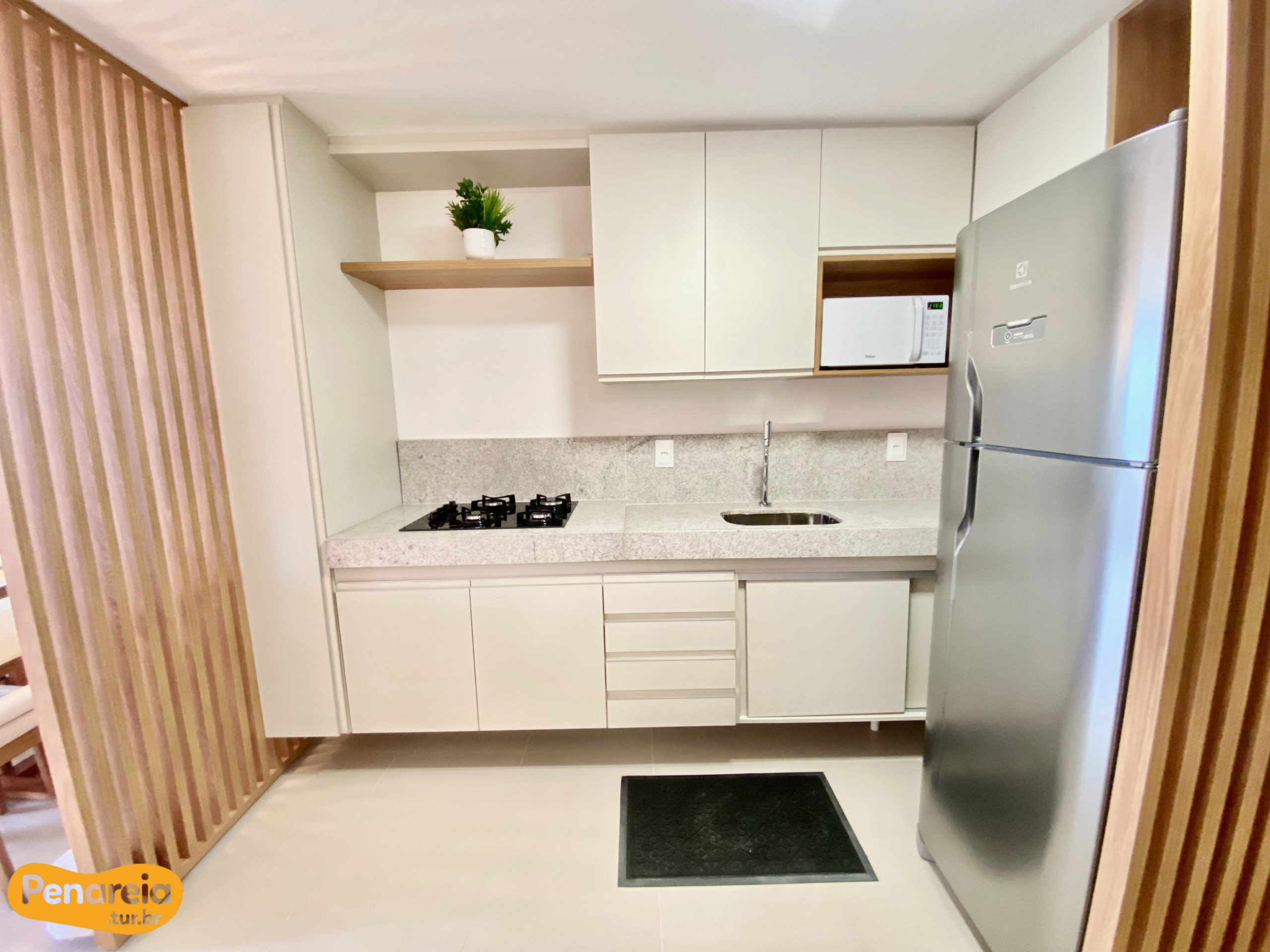 In the gas open plan kitchen, refrigerator, microwave, freezer, dishes/cutlery, kitchen utensils, coffee machine and juicer are provided.