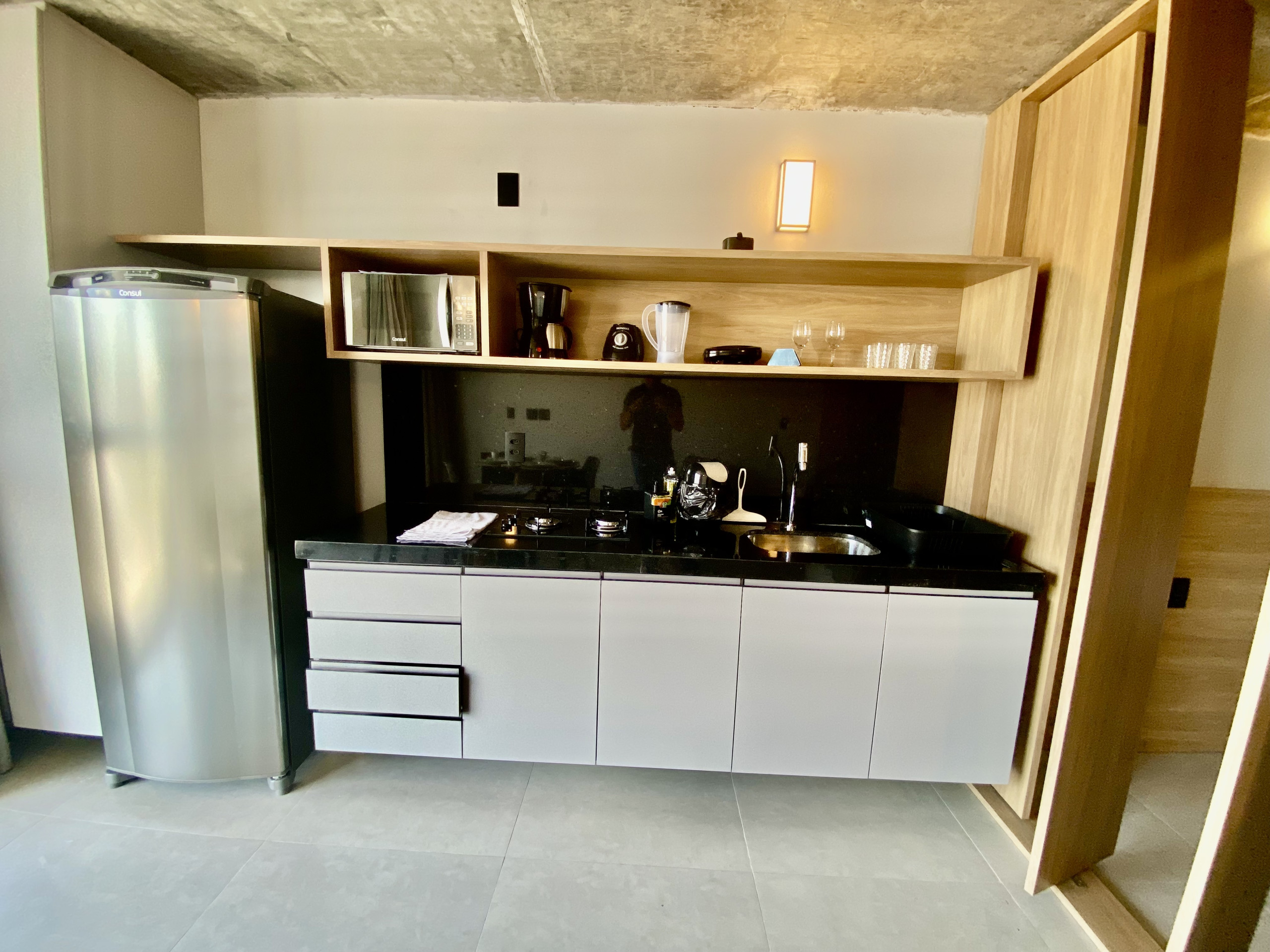 In the gas open plan kitchen, refrigerator, microwave, dishes/cutlery, kitchen utensils, coffee machine, frying pan, toaster and juicer are provided.