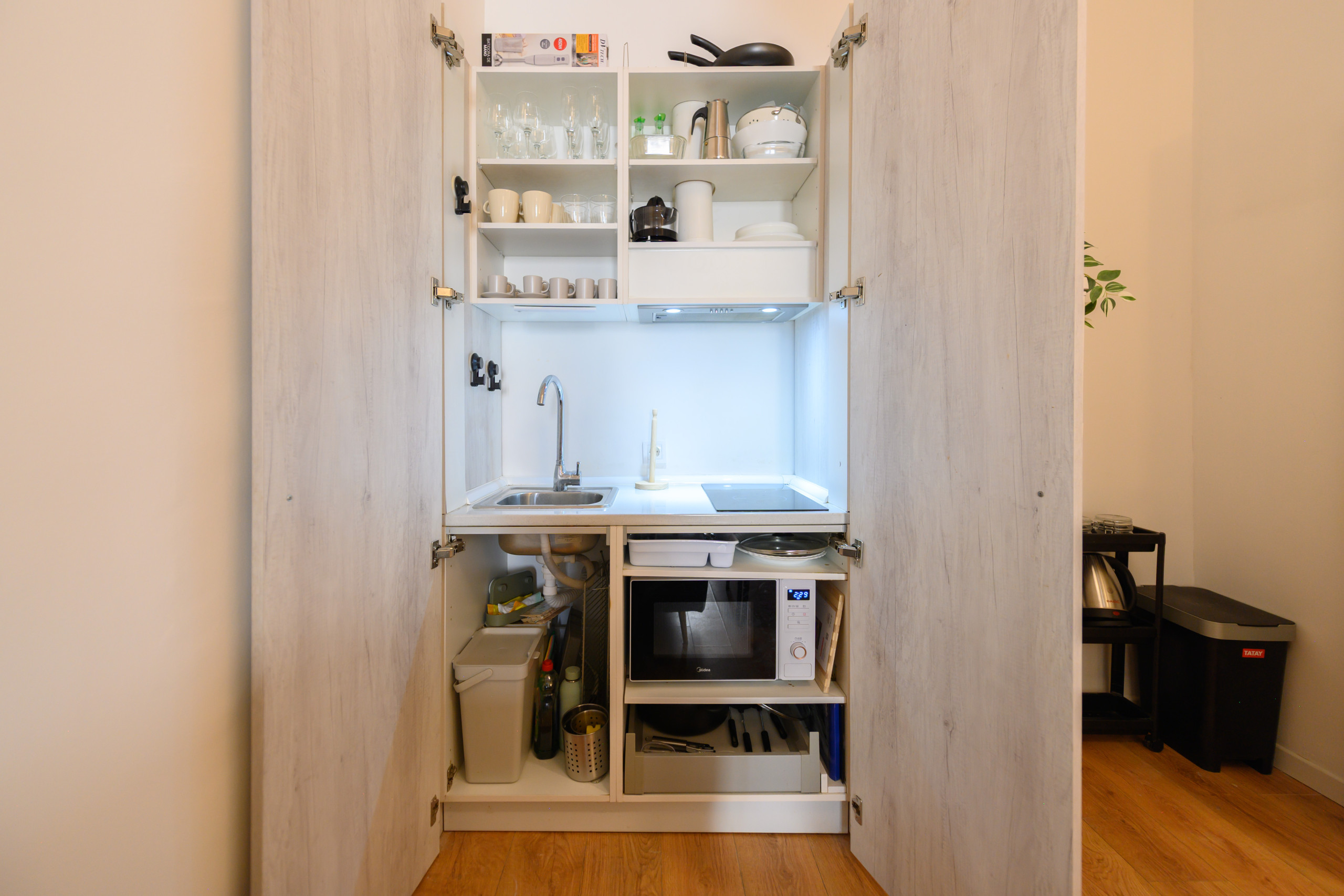 • Kitchen integrated into the living room, compact but functional, with everything necessary to prepare your meals: microwave, fridge, toaster, induction hob, utensils and complete crockery.