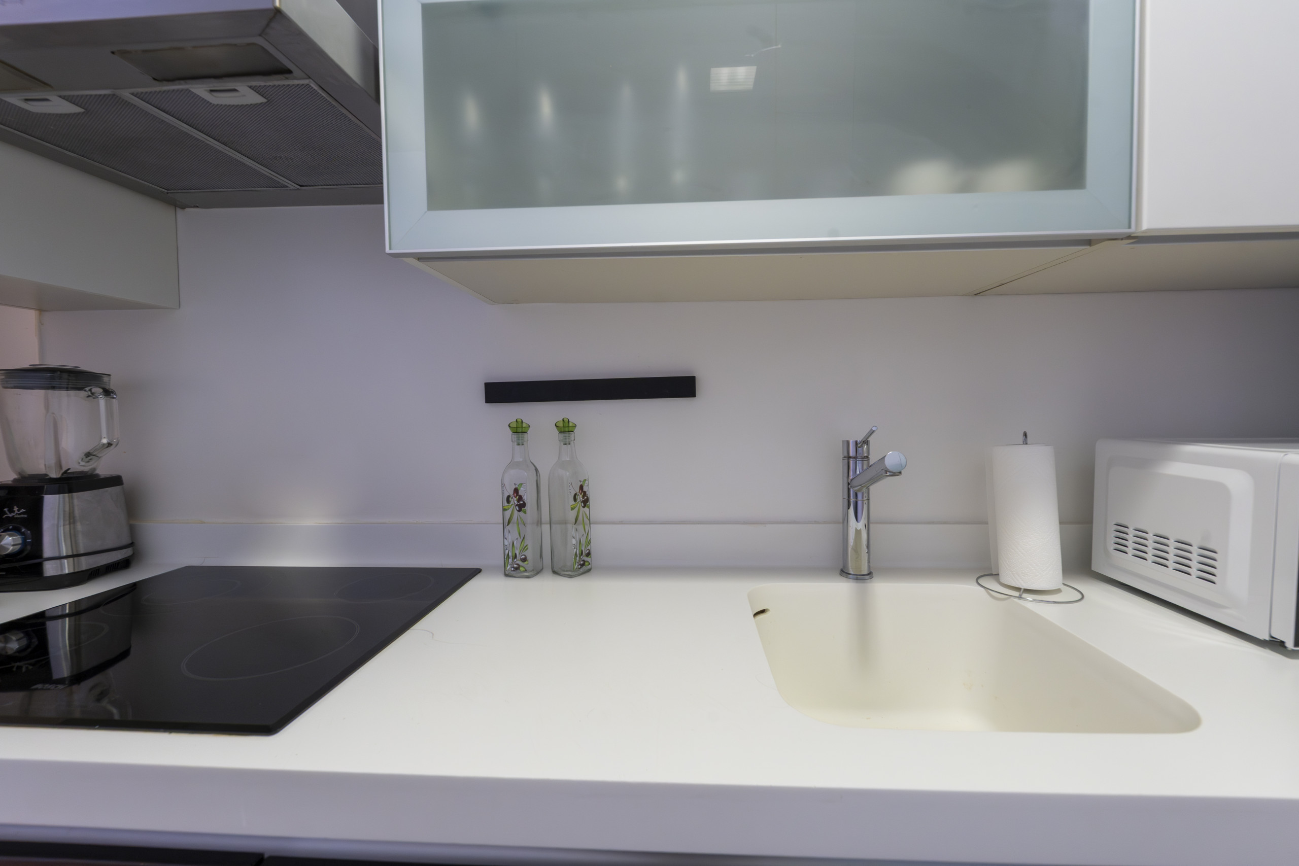 The kitchen, fully equipped, features an oven, microwave, ceramic hob and all necessary utensils to prepare everything from a quick breakfast to a special dinner.