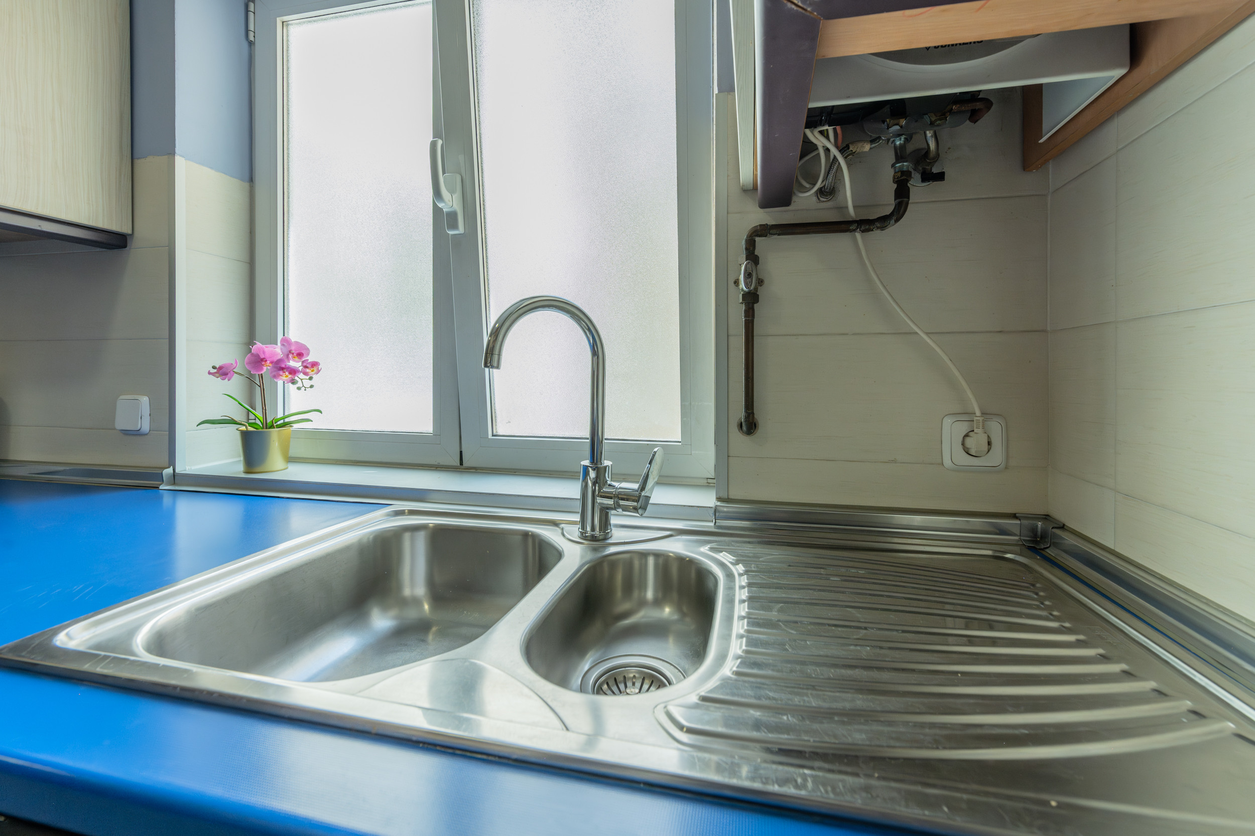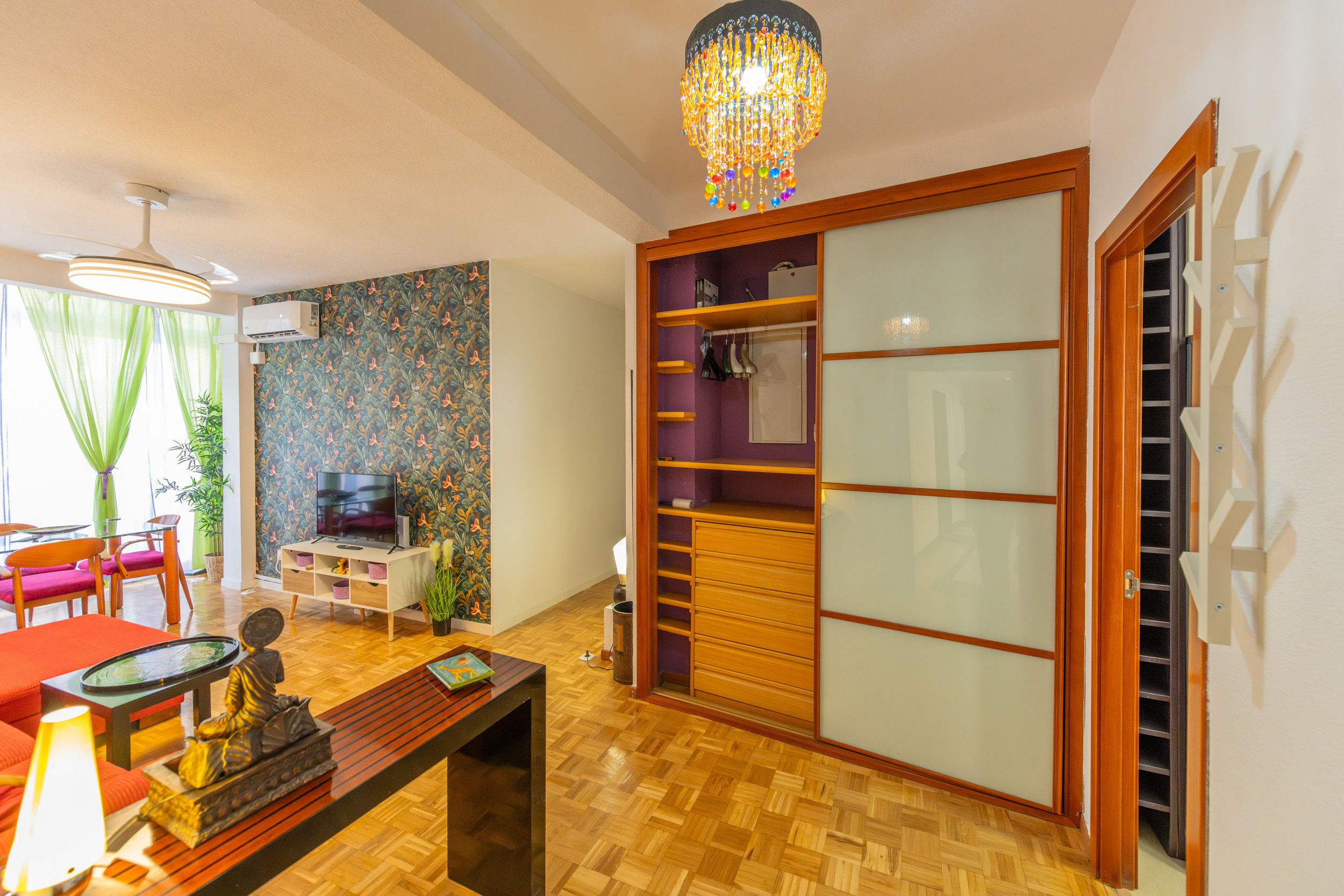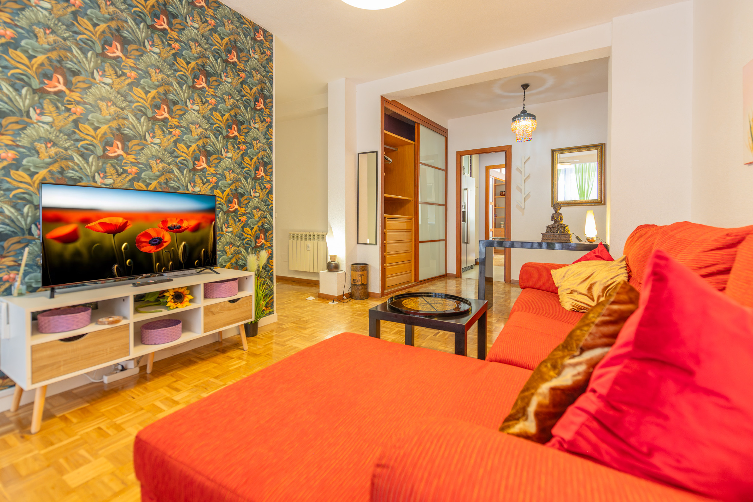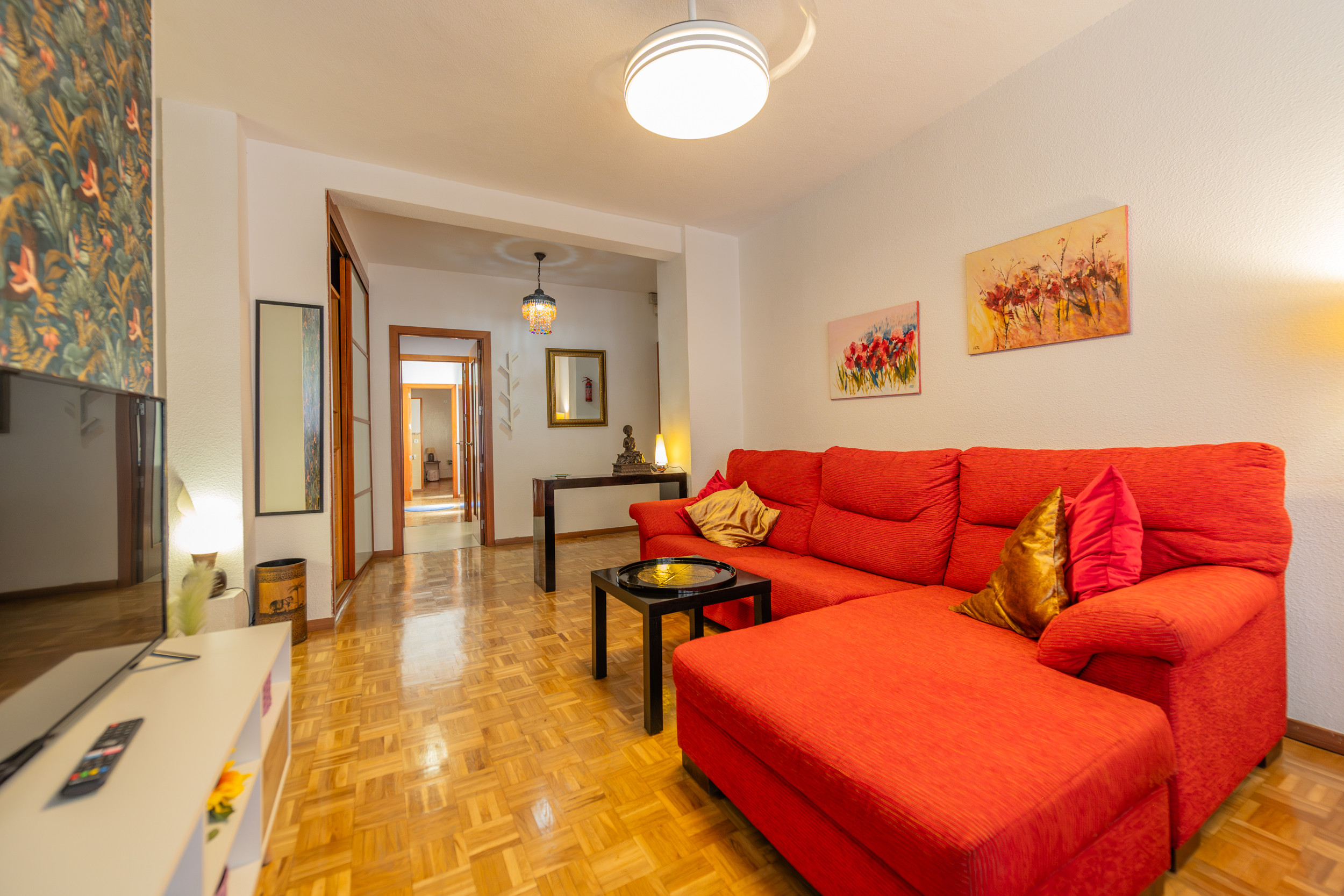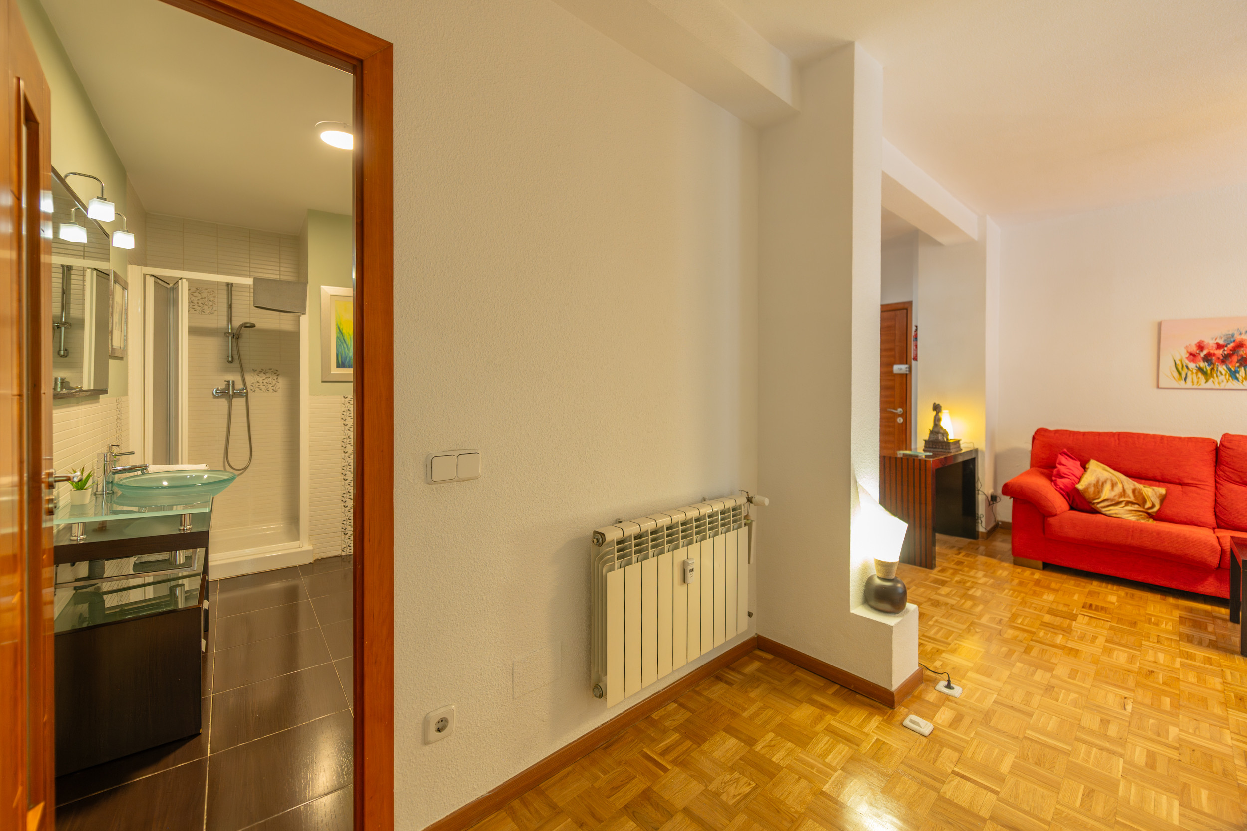 The apartment has a second modern bathroom with a shower tray, providing additional comfort for guests. The living room is a bright and cosy space, equipped with a comfortable chaise longue sofa, perfect for relaxing and enjoying your favourite programmes on the flat-screen TV. The large windows in the living room allow plenty of natural light and offer charming views of the street, creating a warm and welcoming atmosphere to relax or socialise.
