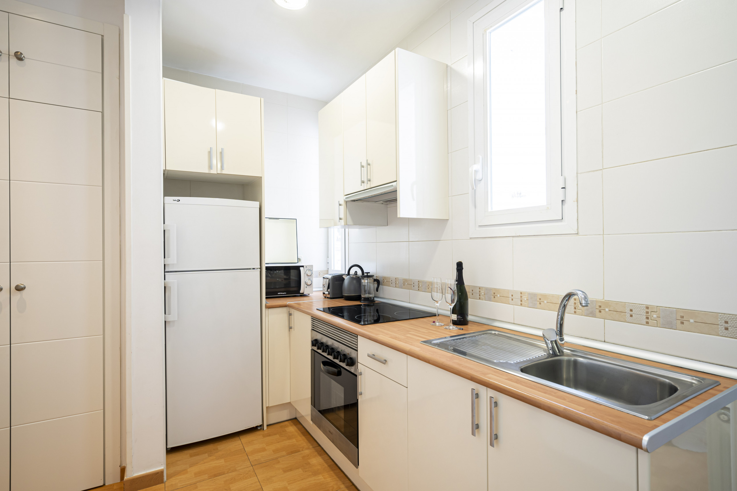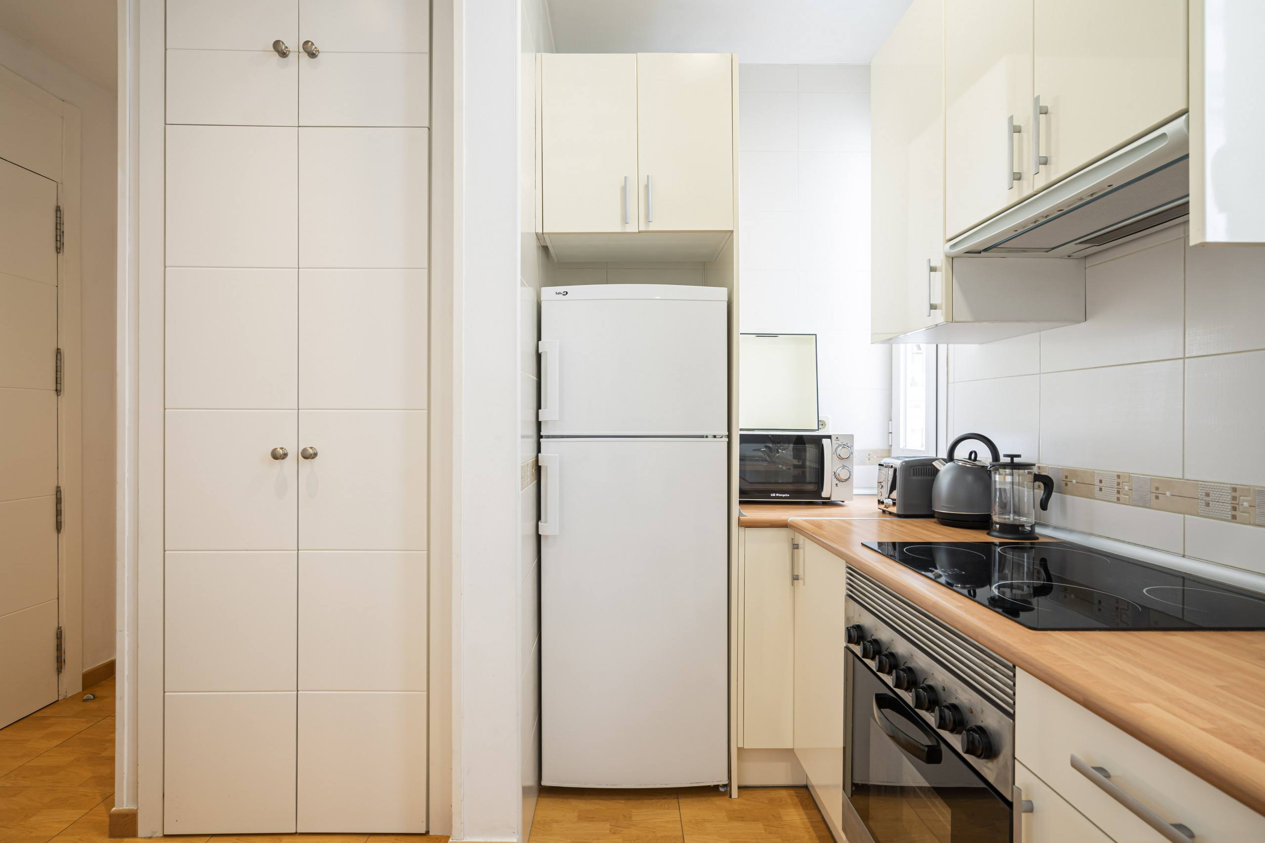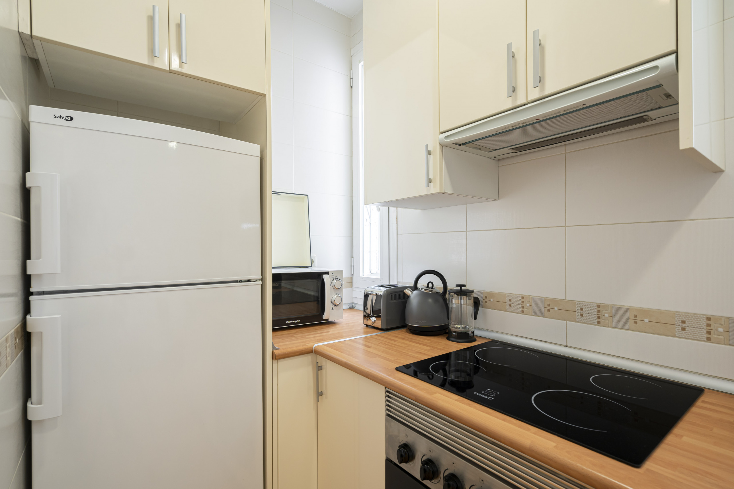 • Kitchen with ceramic hob, fridge, microwave and crockery.