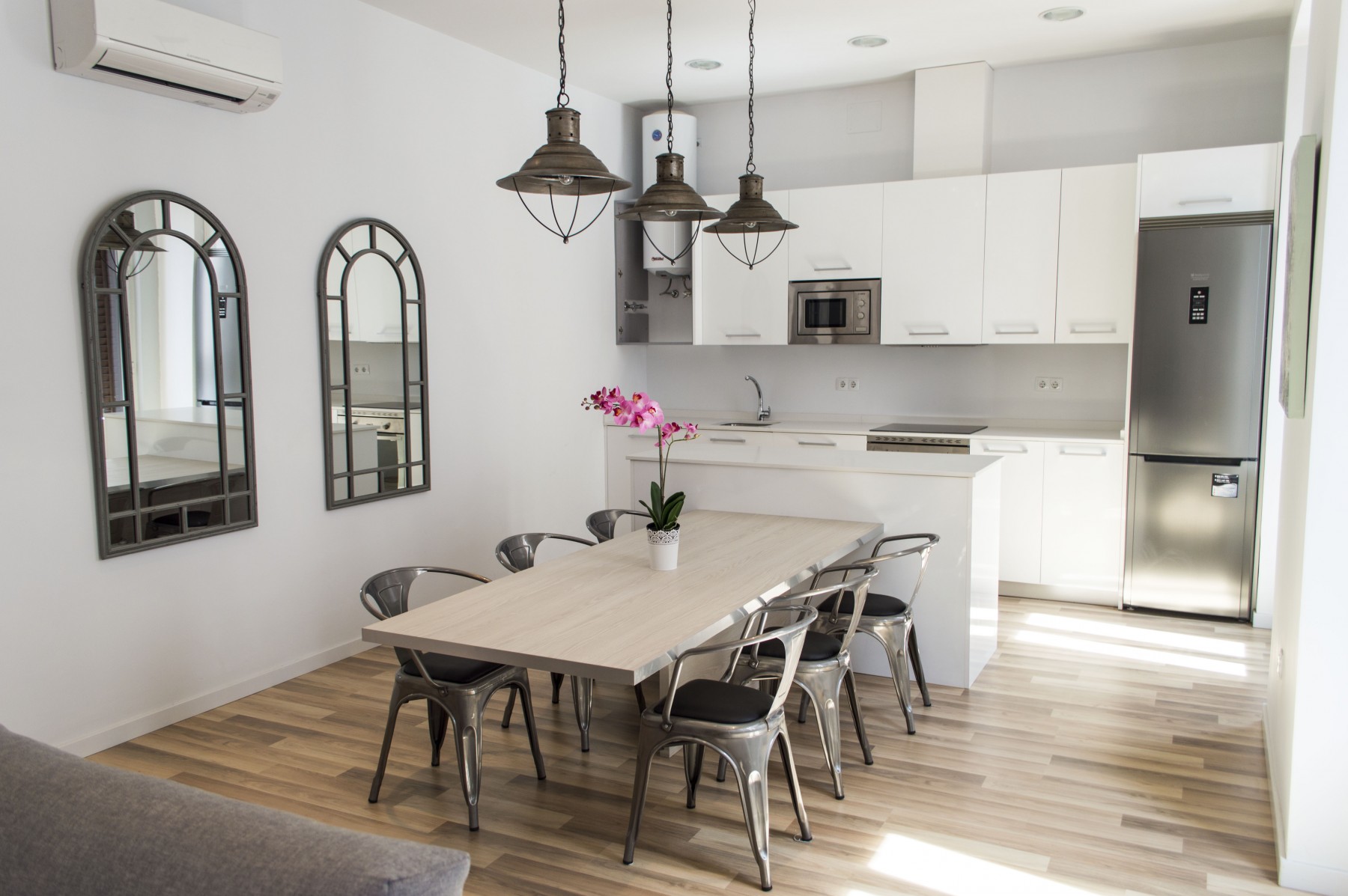 The apartment has kitchen in the living room, two bathrooms with shower, living room and two spacious bedrooms. It is newly renovated and furnished with a modern and minimalist style. The appliances are the latest generation and are perfectly integrated into the design. The rooms are light and airy, with double windows. Beds are 150cm, Queen Size
