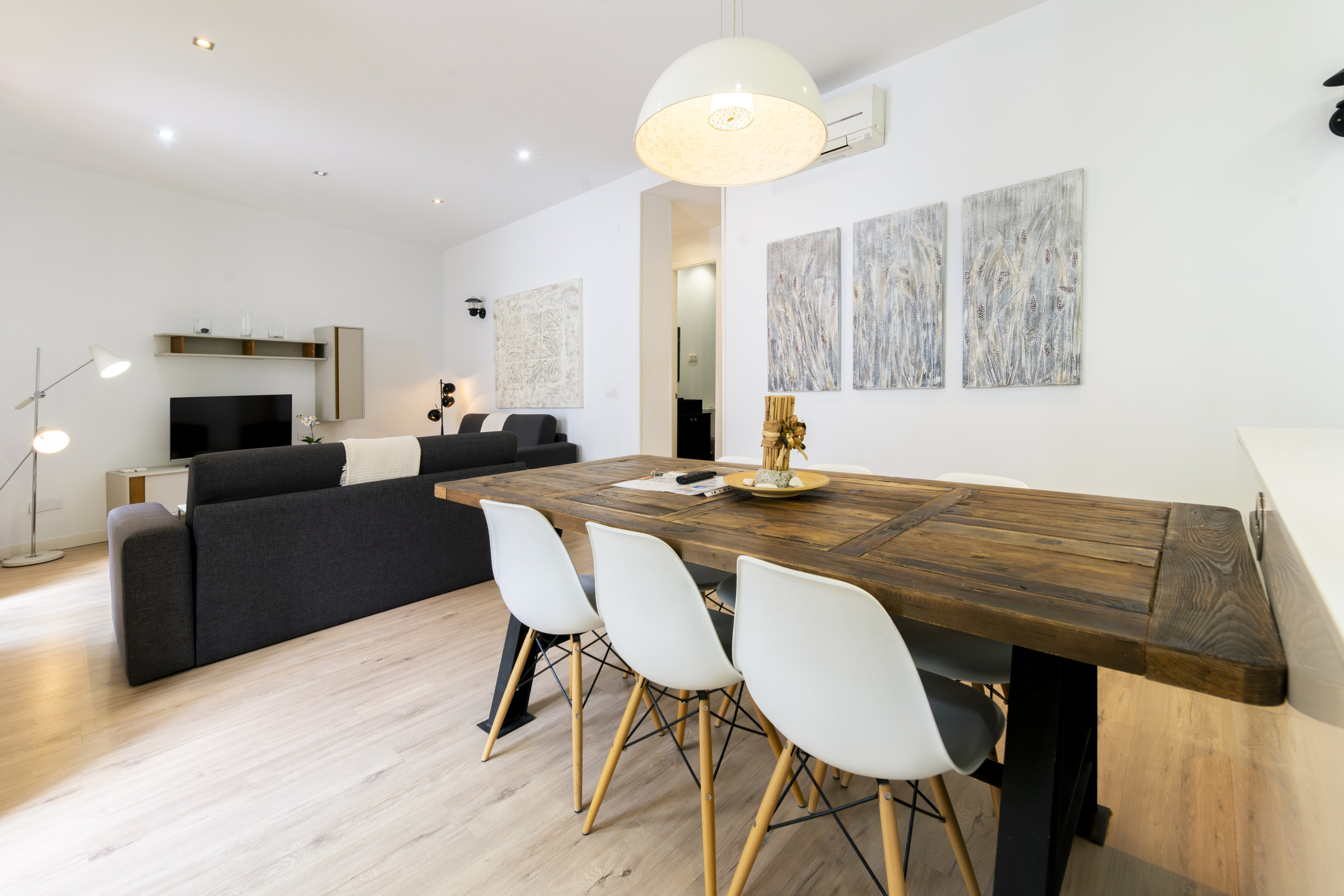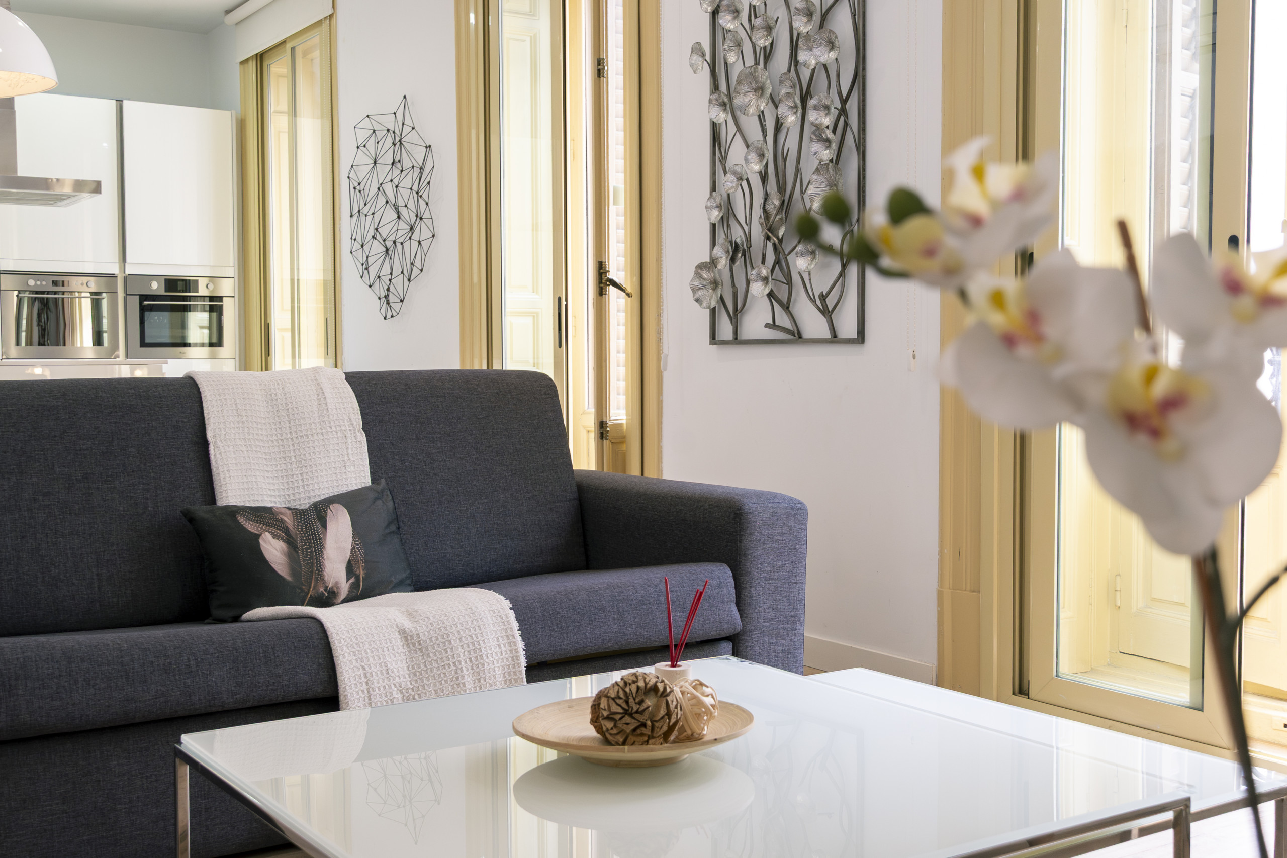 The apartment consists of open plan kitchen, living room, 2 bathrooms with shower and two spacious bedrooms. It is newly renovated and furnished with modern, minimalist style. The appliances are modern and are perfectly integrated into the design. The bedrooms are spacious and bright with double glazing. Beds are 150cm, Queen Size
