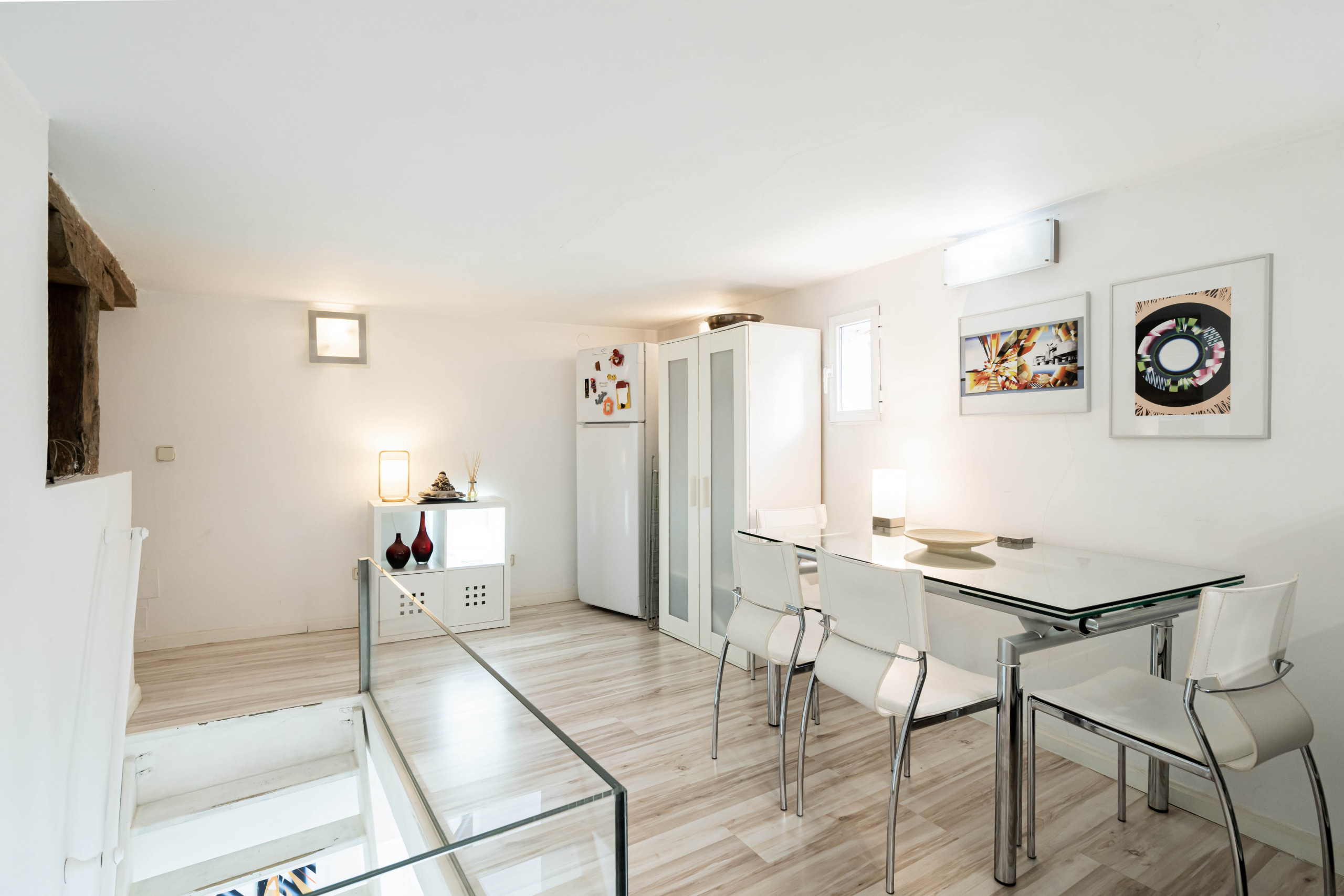 Apartment distributed over two floors, on the first floor a lovely reception area followed by a work zone with a desk and a comfortable chair. At the end of the corridor is the living room which has a comfortable sofa, convertible into a bed that can comfortably accommodate one person, flat screen television, perfect for spending an afternoon watching movies.