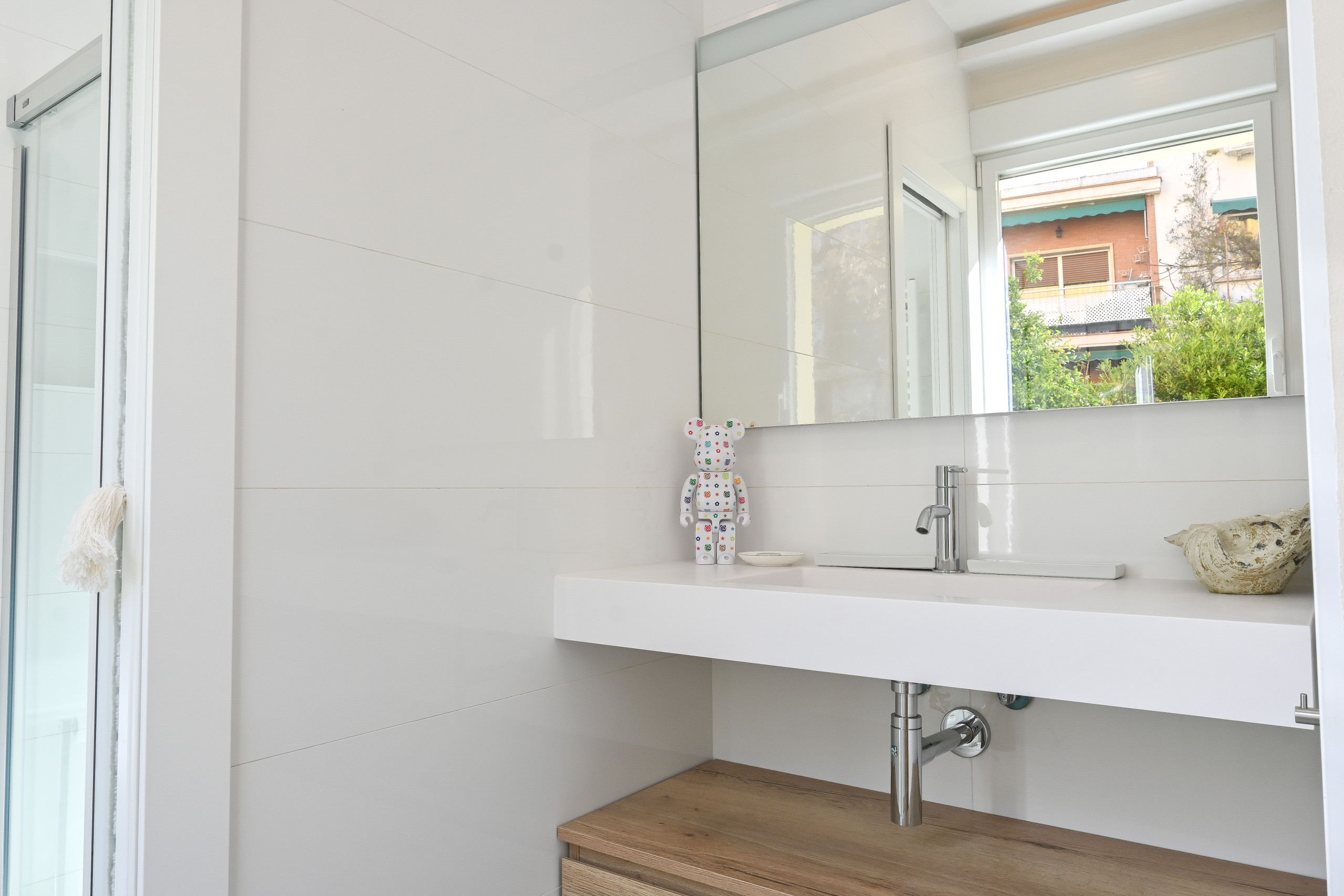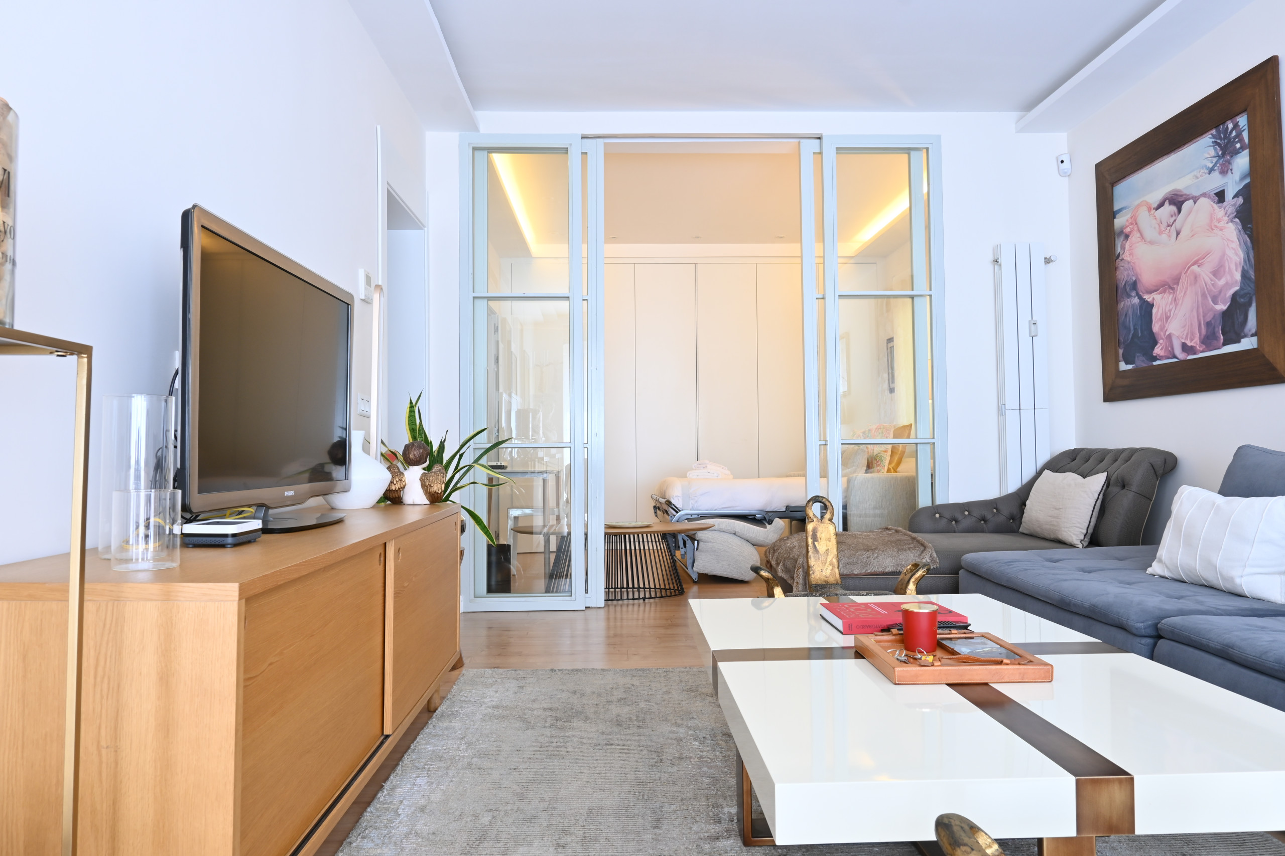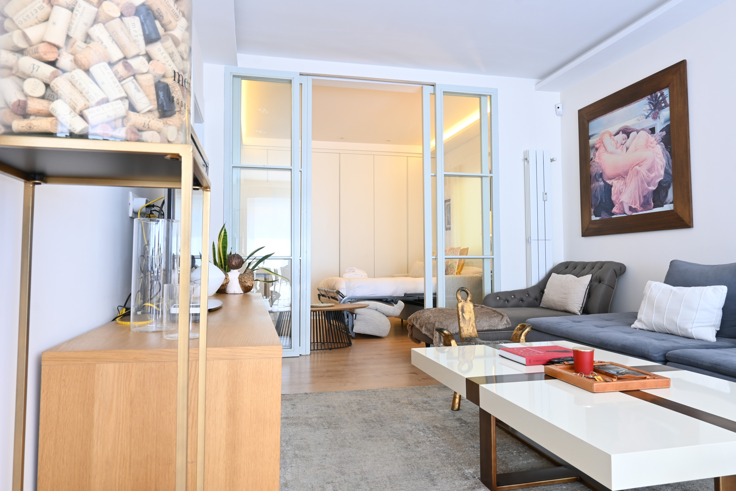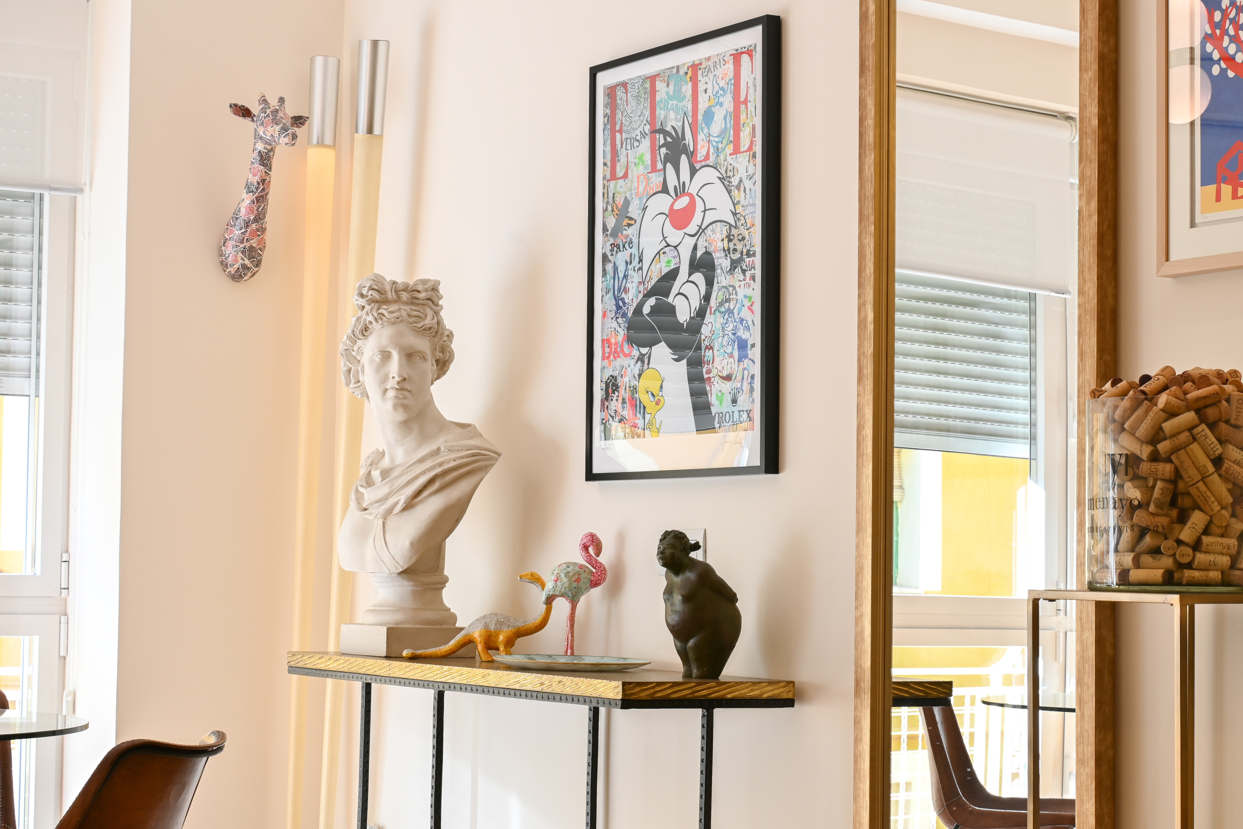 The spacious and bright living room is perfect for relaxing after a day exploring the city, surrounded by unique decorative details that create a warm and sophisticated atmosphere. Attached to the living room, you will find an elegant workspace, perfect for maximising your productivity.