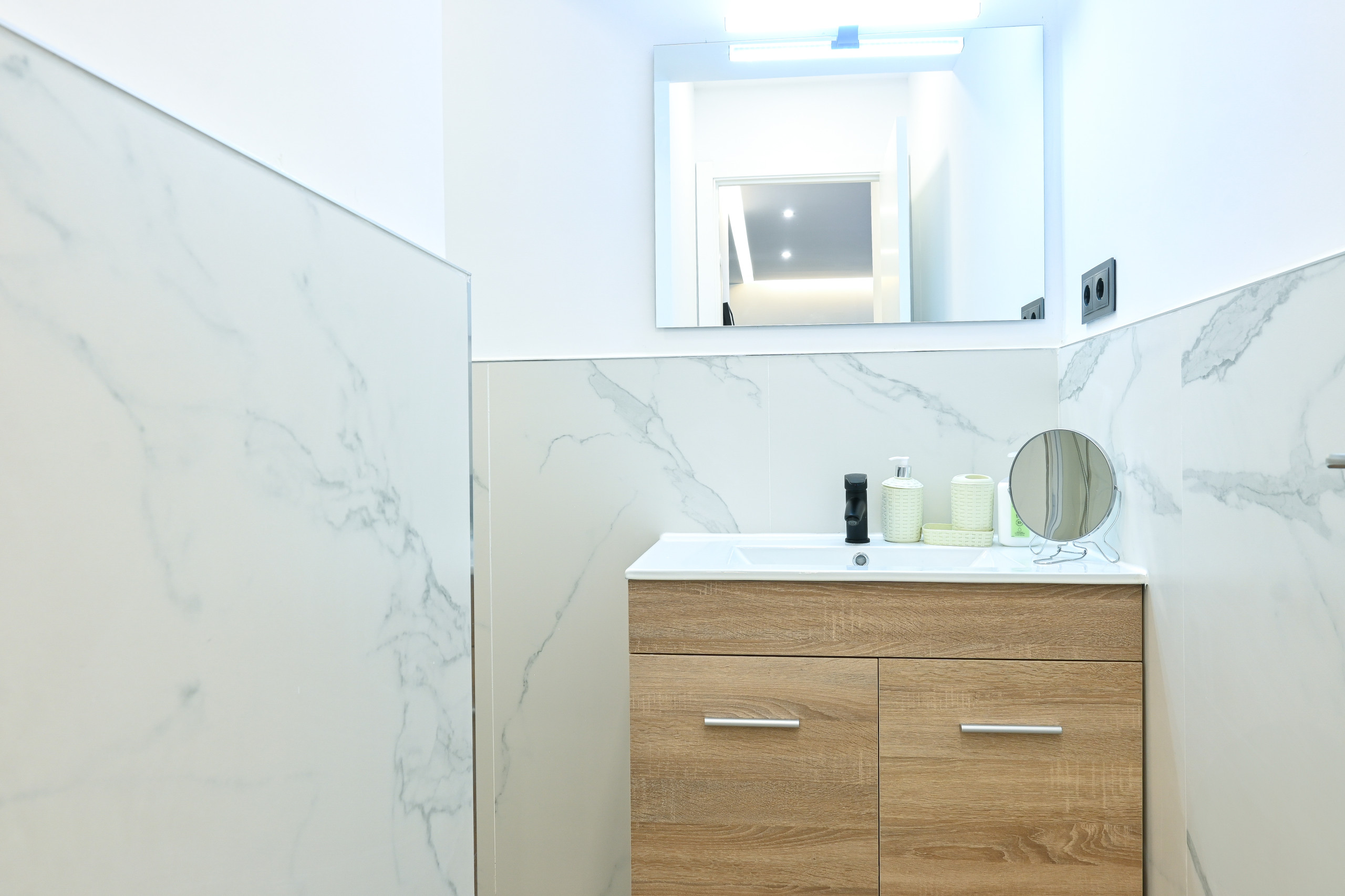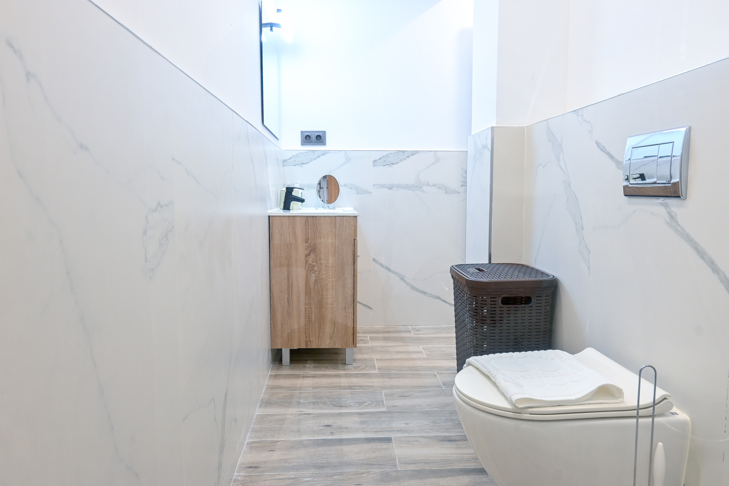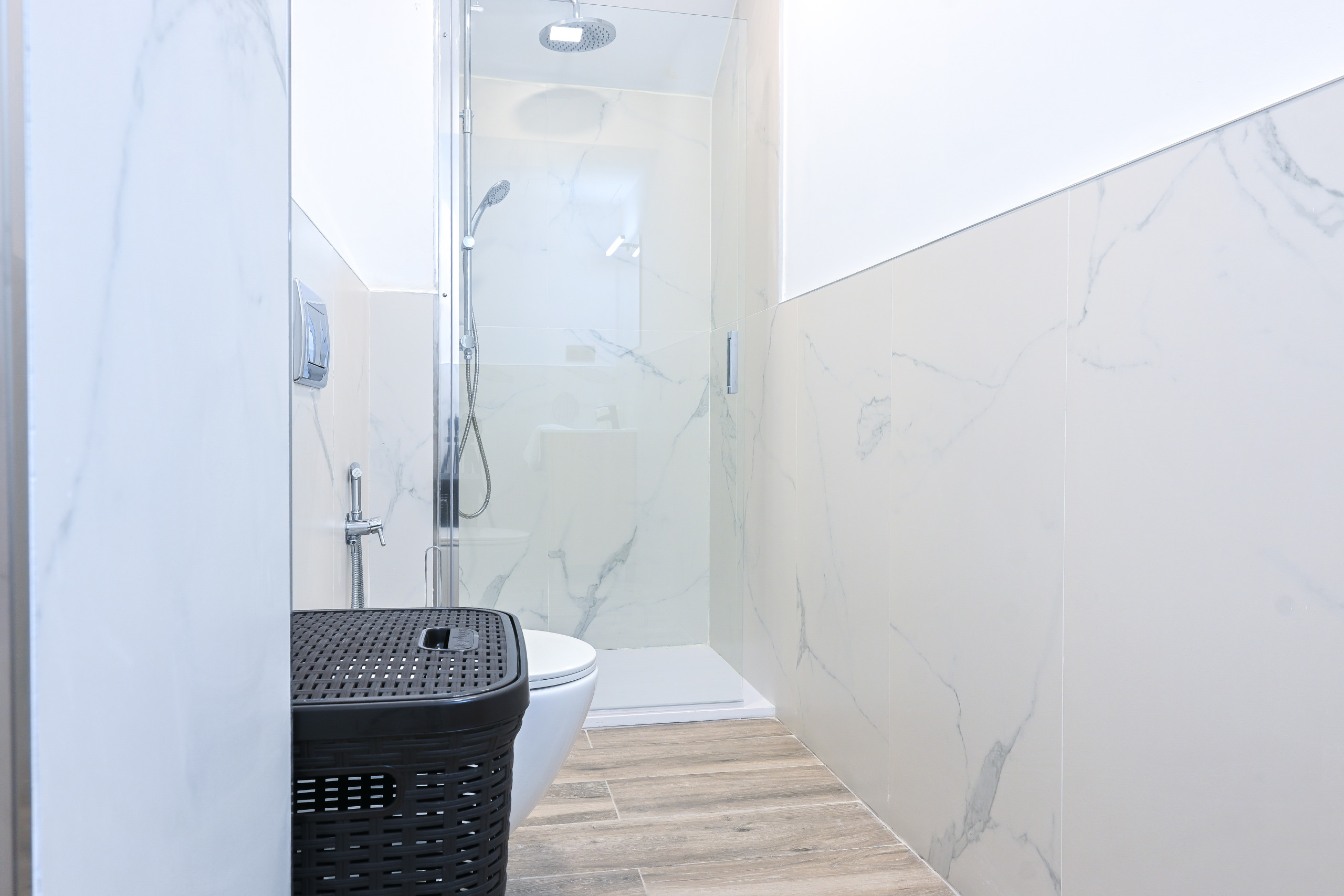 The bathroom, modern and functional, has a shower tray. The layout of the bathroom ensures easy access from any part of the apartment, making your stay even more comfortable and relaxing.