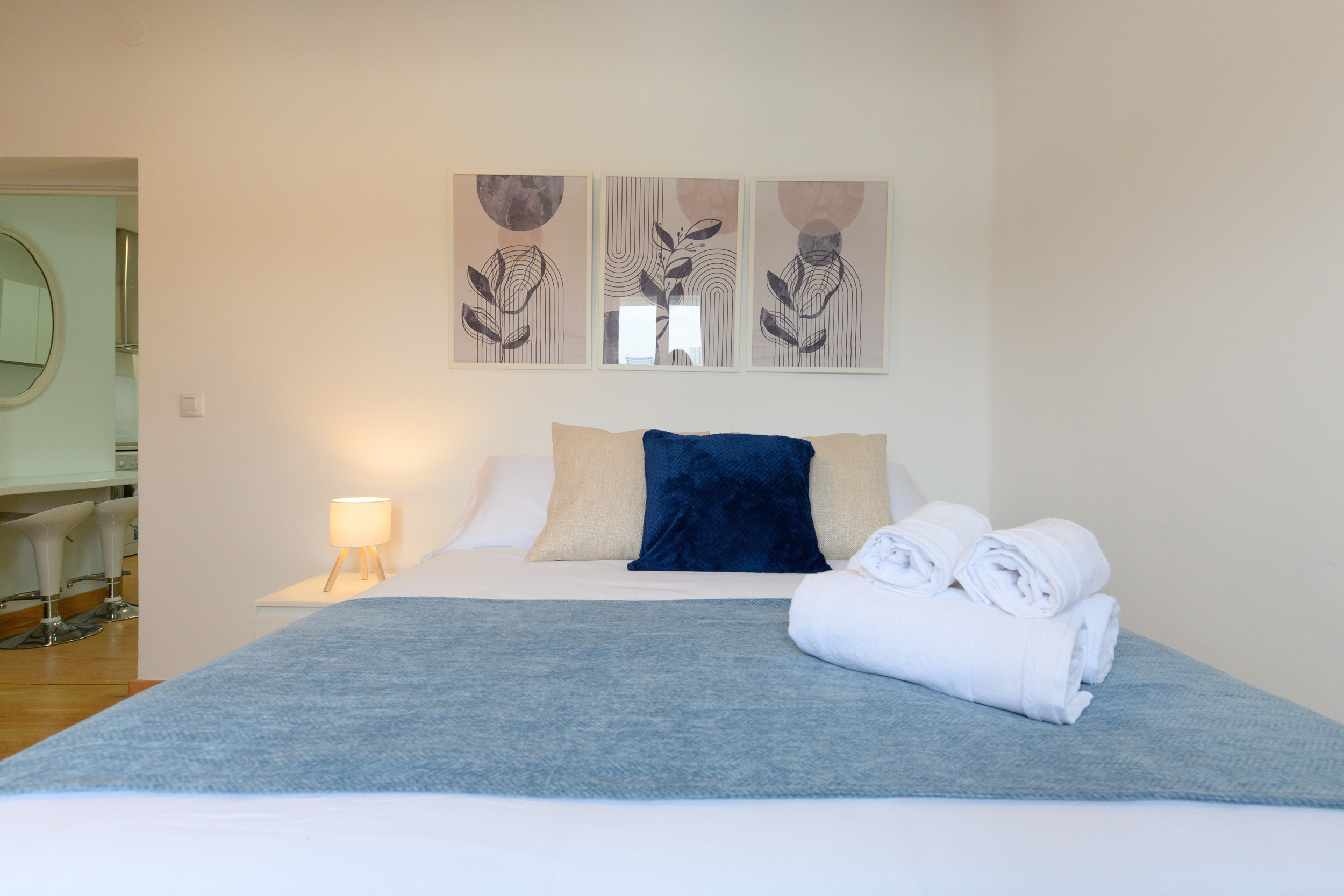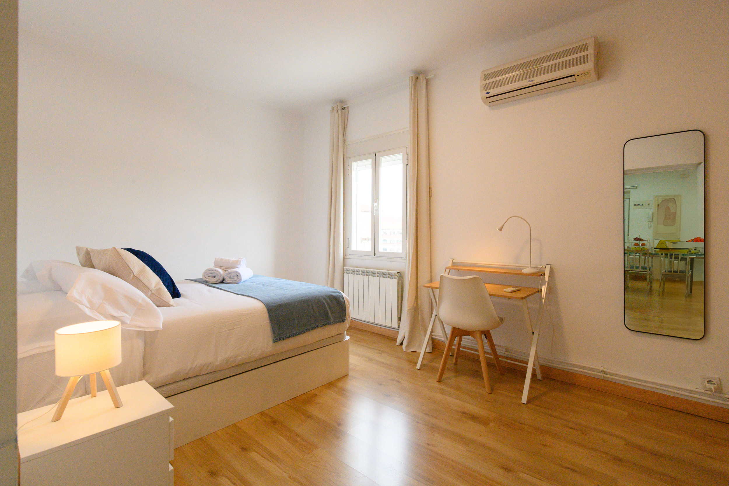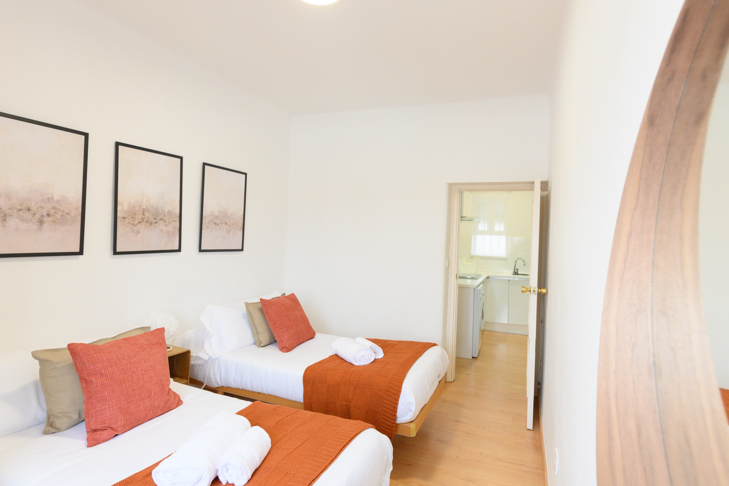 Upon entering, you are greeted by a well-distributed space that invites rest and socialising. The apartment has two bedrooms. The main bedroom features a spacious and comfortable double bed, ideal for restorative rest, as well as a practical desk, perfect for those who need a quiet space to work or study. The second bedroom has two single beds, providing flexibility for different types of guests. Both rooms are equipped with bedding and wardrobes to comfortably store belongings during the stay.
