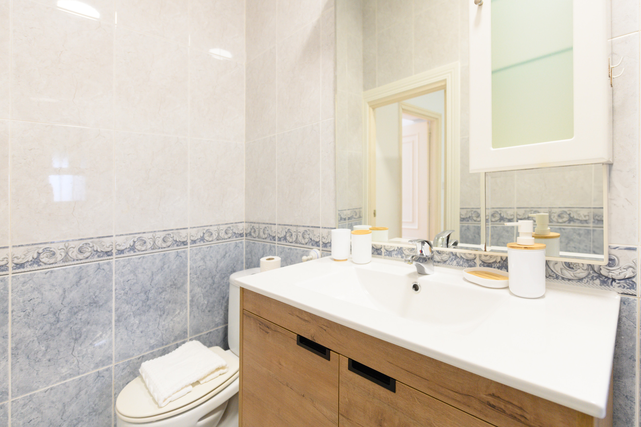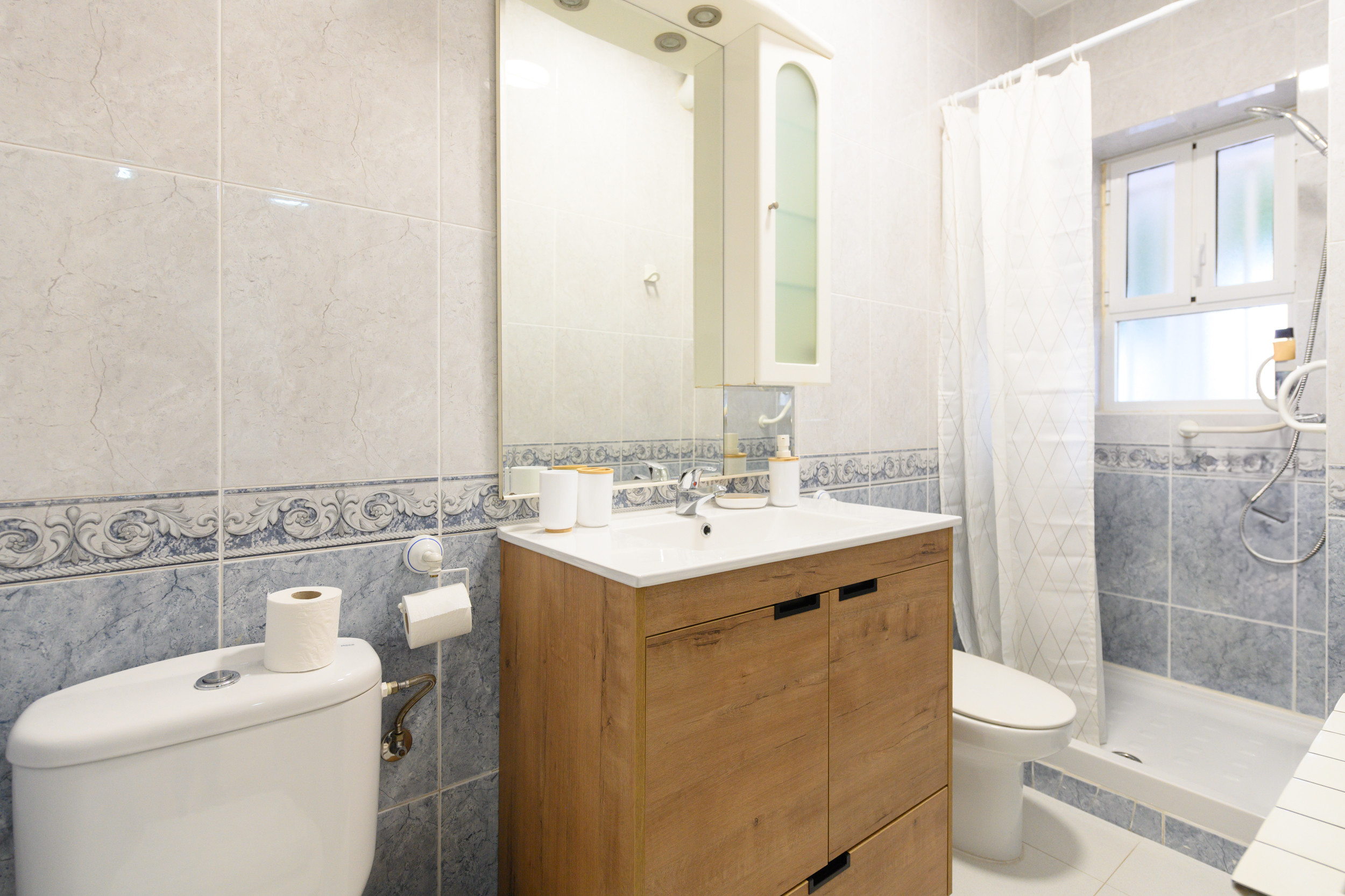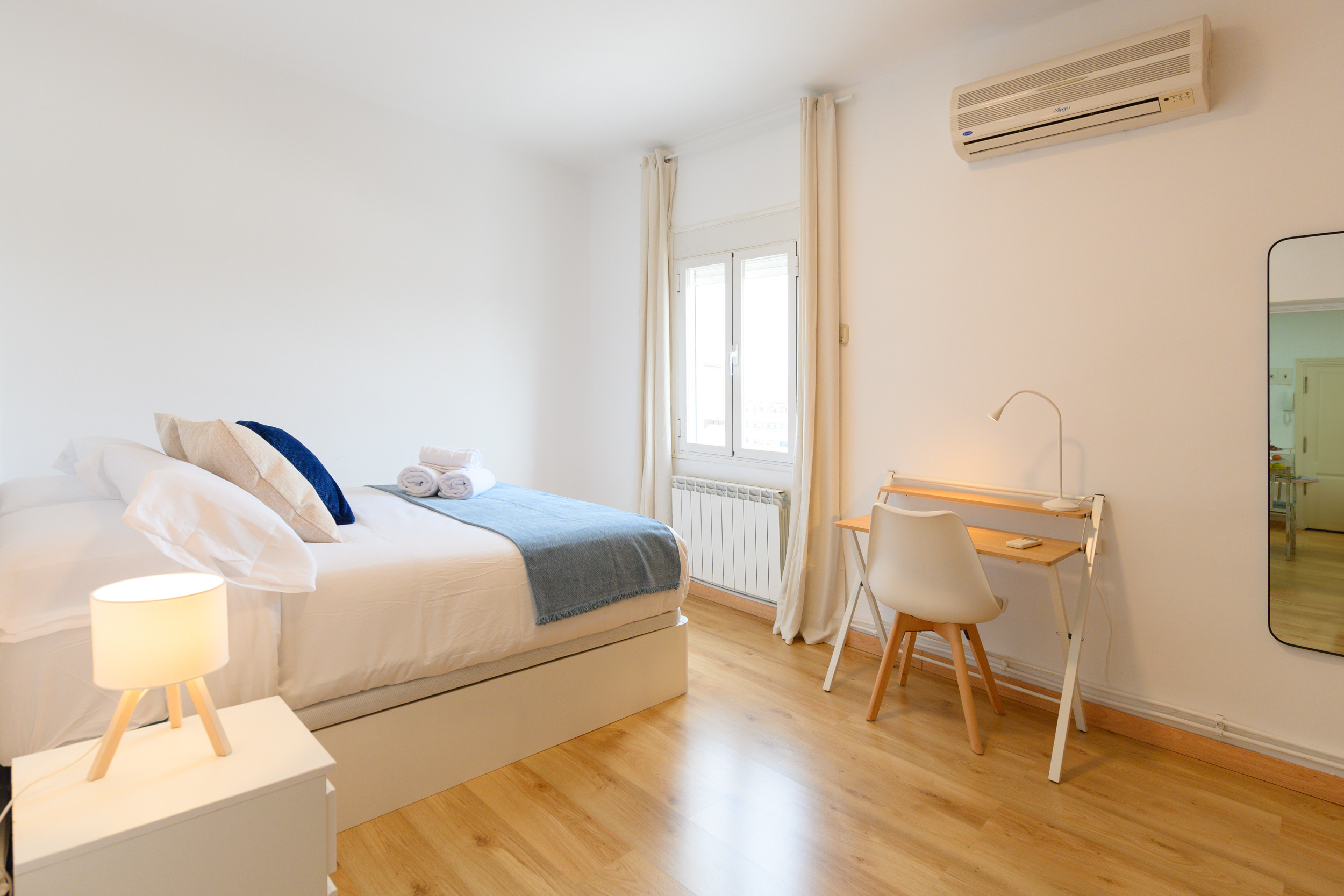 Upon entering, you are greeted by a well-distributed space that invites rest and socialising. The apartment has two bedrooms. The main bedroom features a spacious and comfortable double bed, ideal for restorative rest, as well as a practical desk, perfect for those who need a quiet space to work or study. The second bedroom has two single beds, providing flexibility for different types of guests. Both rooms are equipped with bedding and wardrobes to comfortably store belongings during the stay.