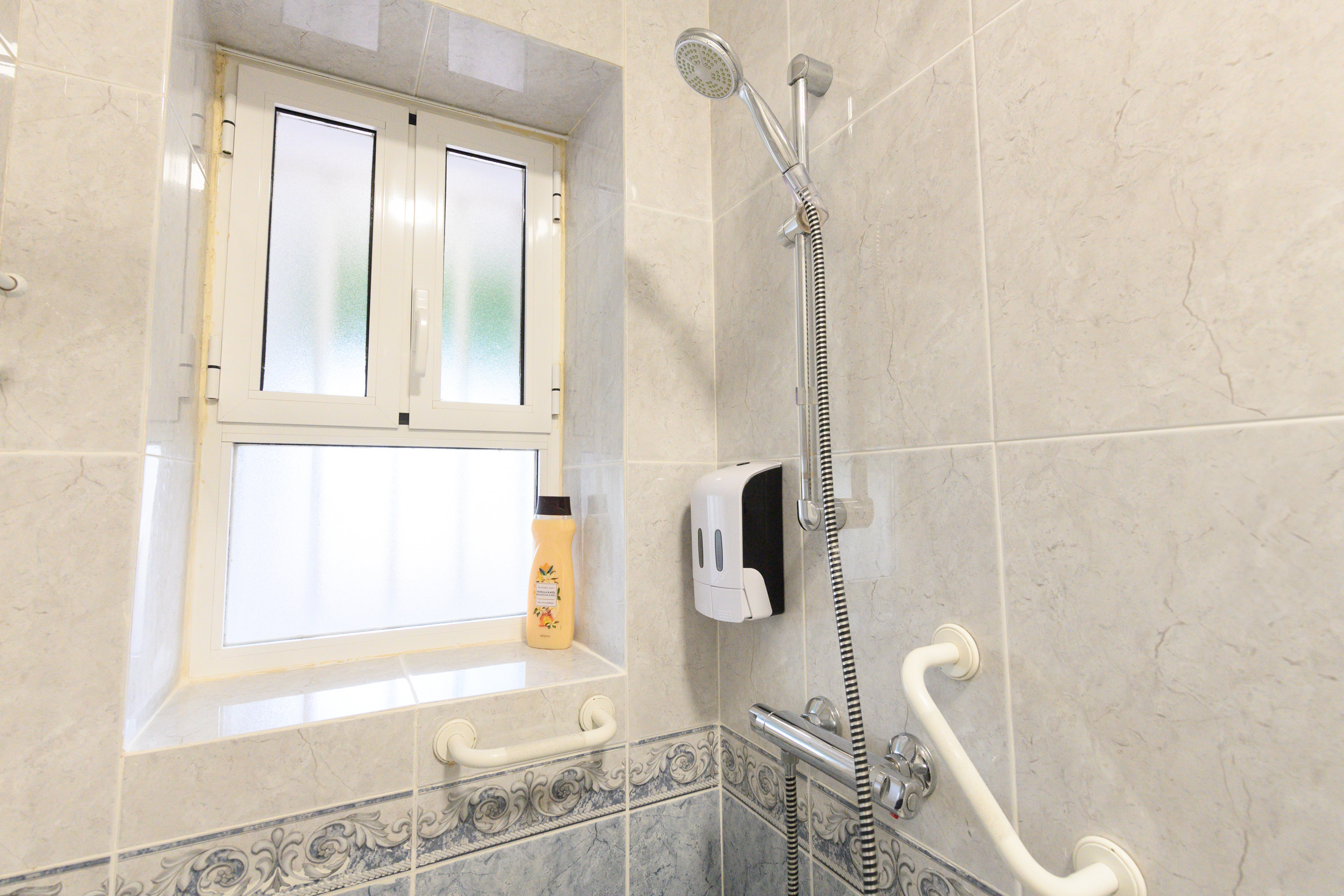 The bathroom, with a contemporary design, is fully equipped with a modern shower tray, towels and essential toiletries (shower gel), providing everything necessary for a comfortable and well-being experience.