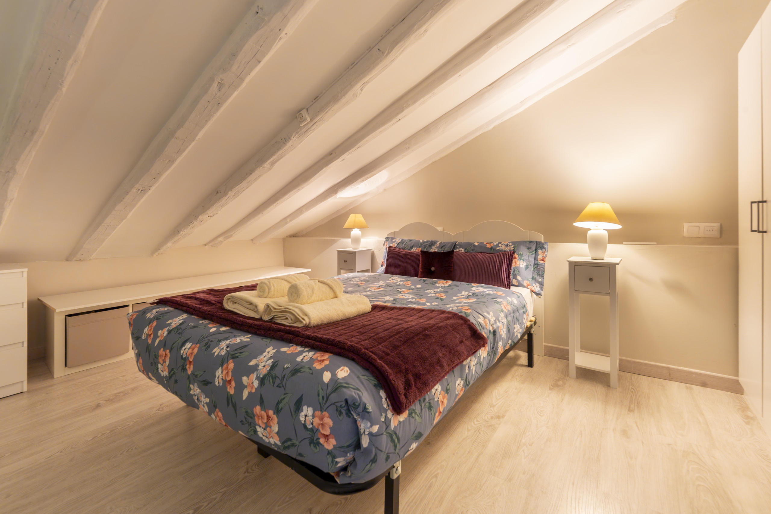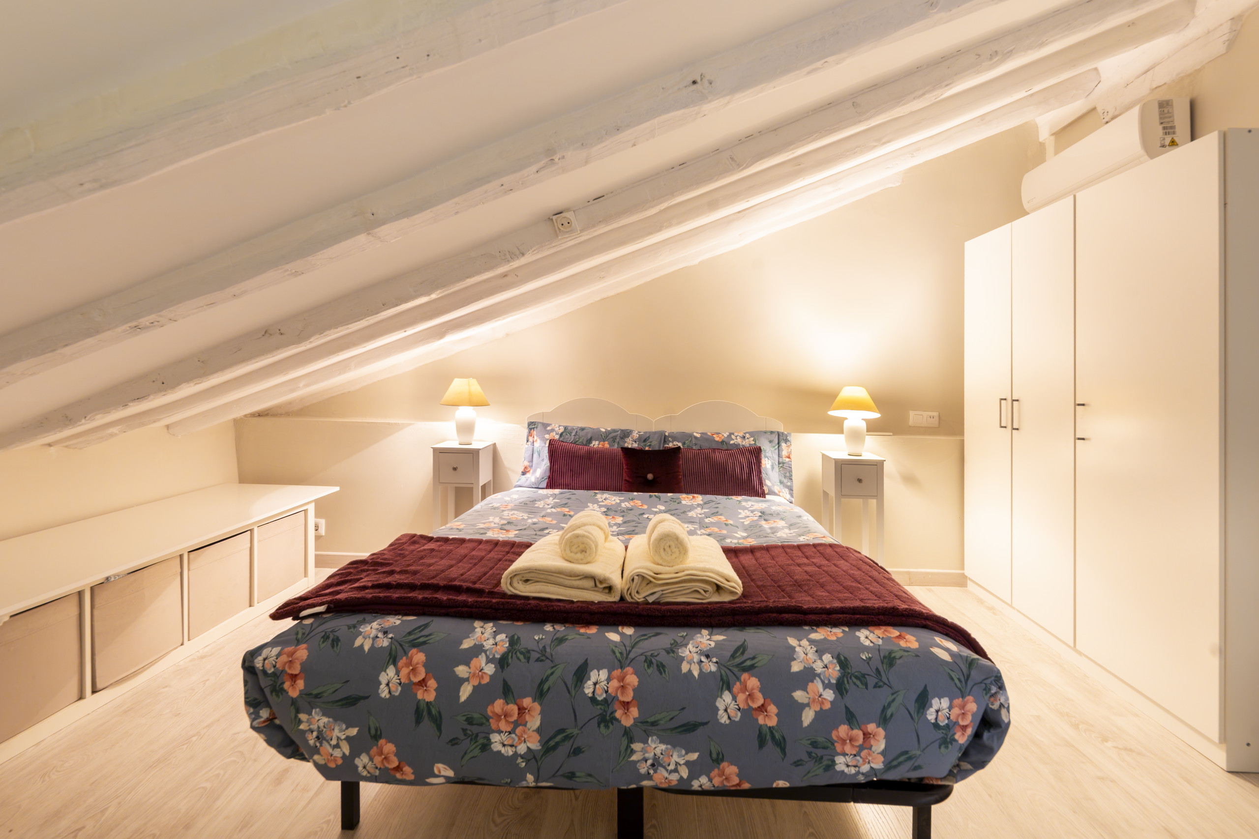 On the upper level of the duplex is the main bedroom, an intimate and cosy space, ideal for rest. The room features a comfortable double bed, perfect for ensuring restorative sleep. Additionally, it has a spacious wardrobe and numerous storage spaces, allowing the room to always remain organised without compromising the sense of spaciousness.