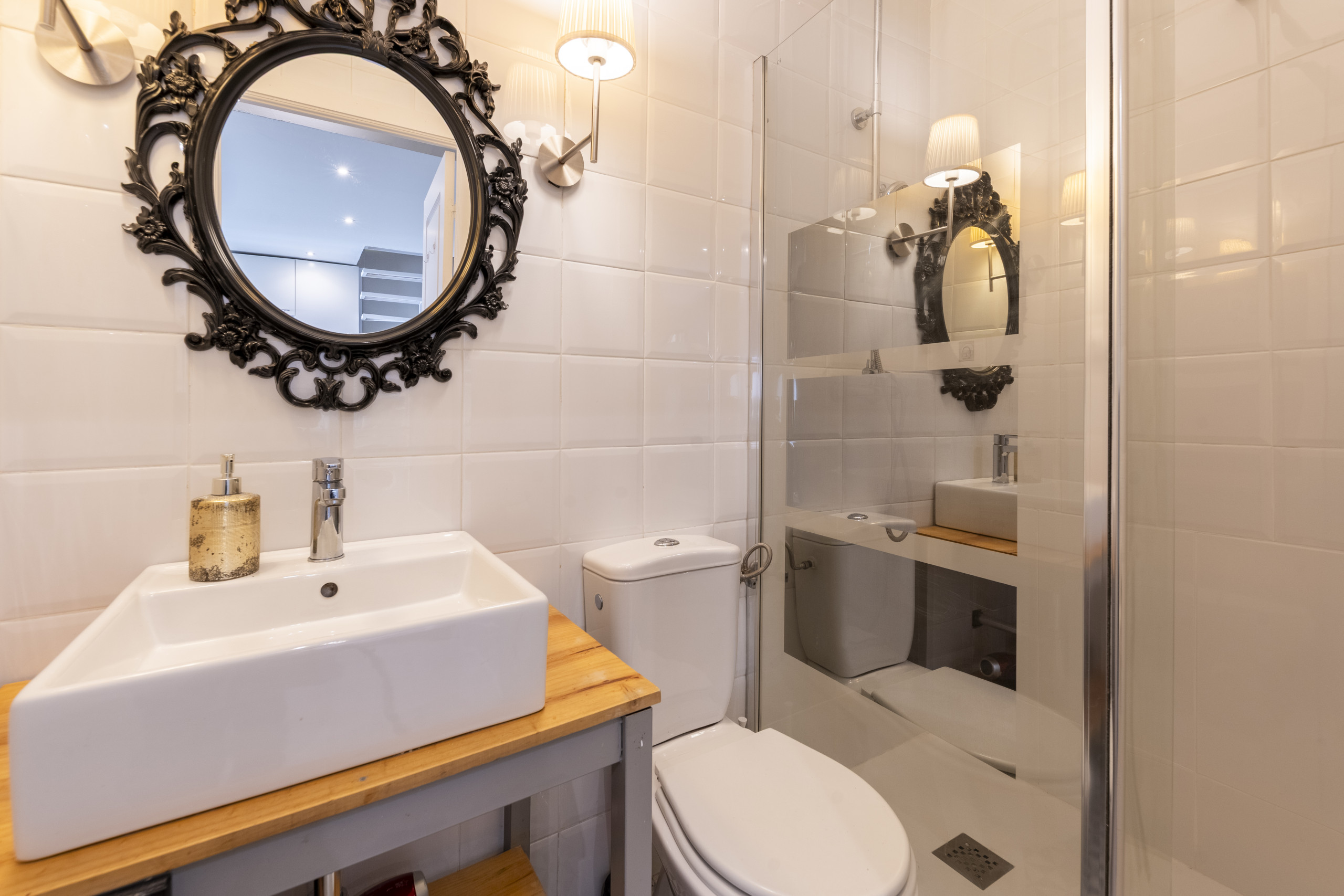 The complete bathroom features a shower tray, offering comfort and a modern design. Its layout allows for efficient use of space, combining functionality and aesthetics in every detail.