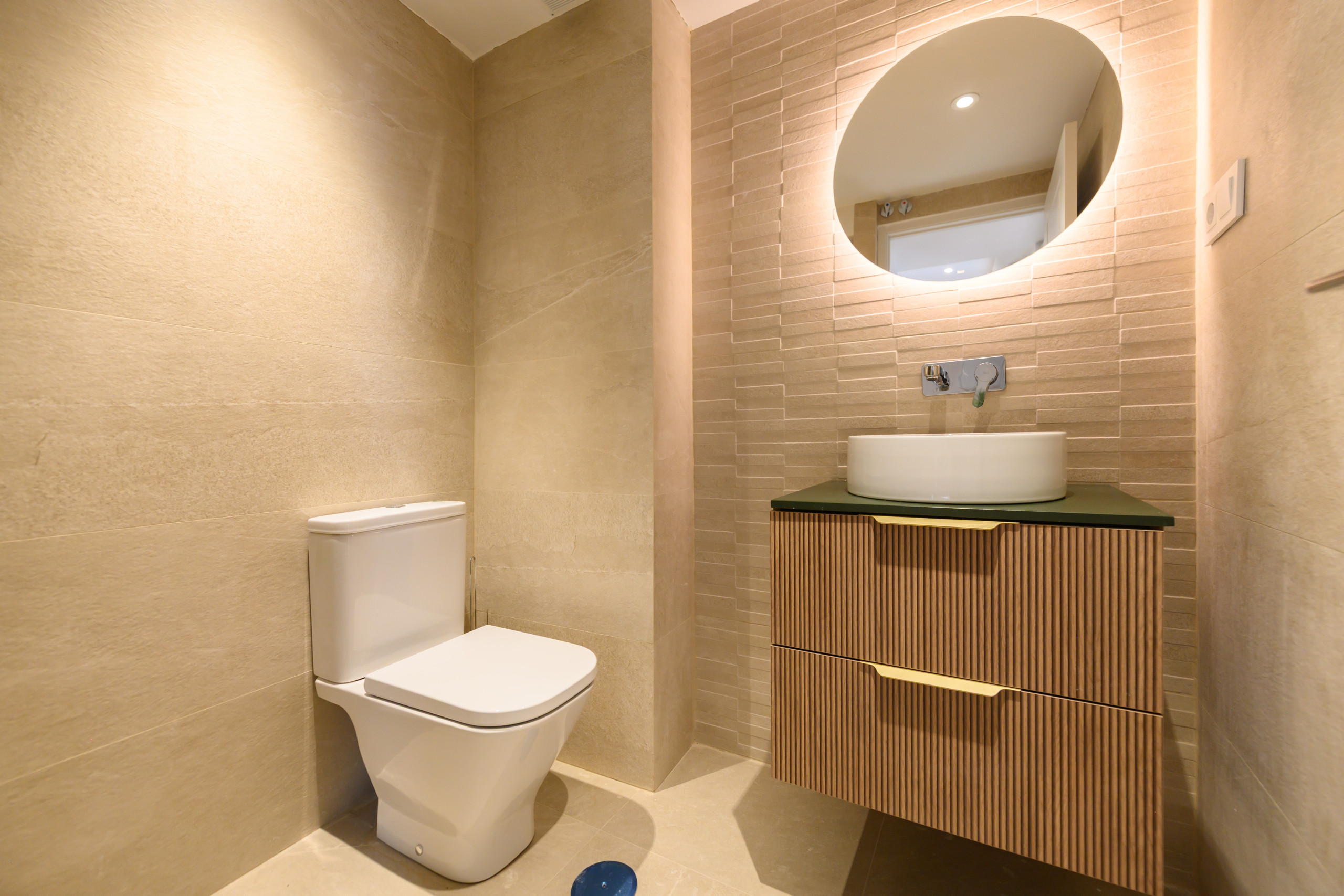 The complete bathroom is renovated and equipped with a modern shower tray, mirror and a practical washbasin unit that provides storage capacity and daily comfort. Its design combines functionality with a current and careful style.