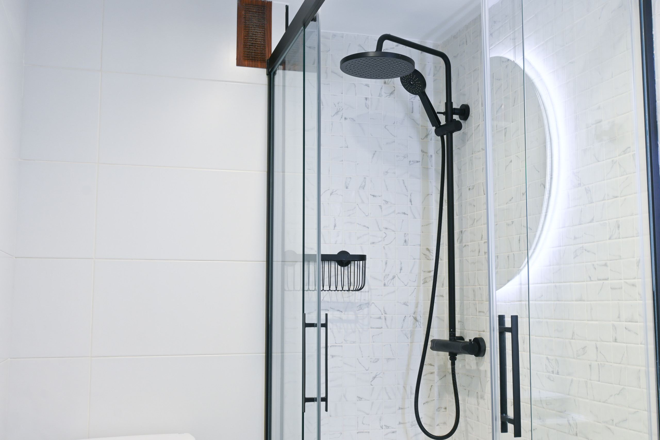 The bathroom is modern and functional, equipped with a spacious shower tray and contemporary finishes in neutral colours, offering a clean and elegant atmosphere. The design tiles and chrome details ensure a modern aesthetic, perfect for starting or ending the day with comfort.