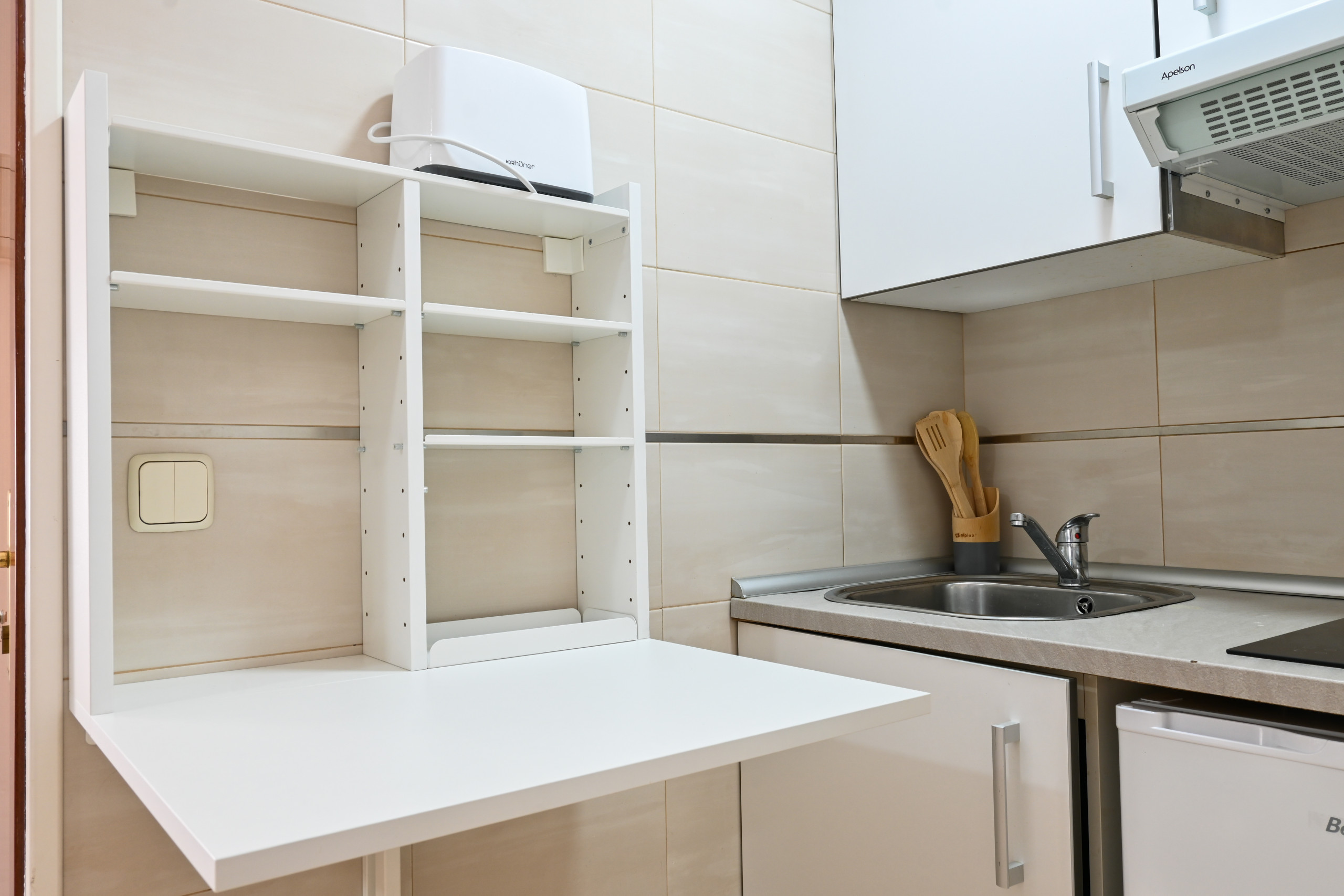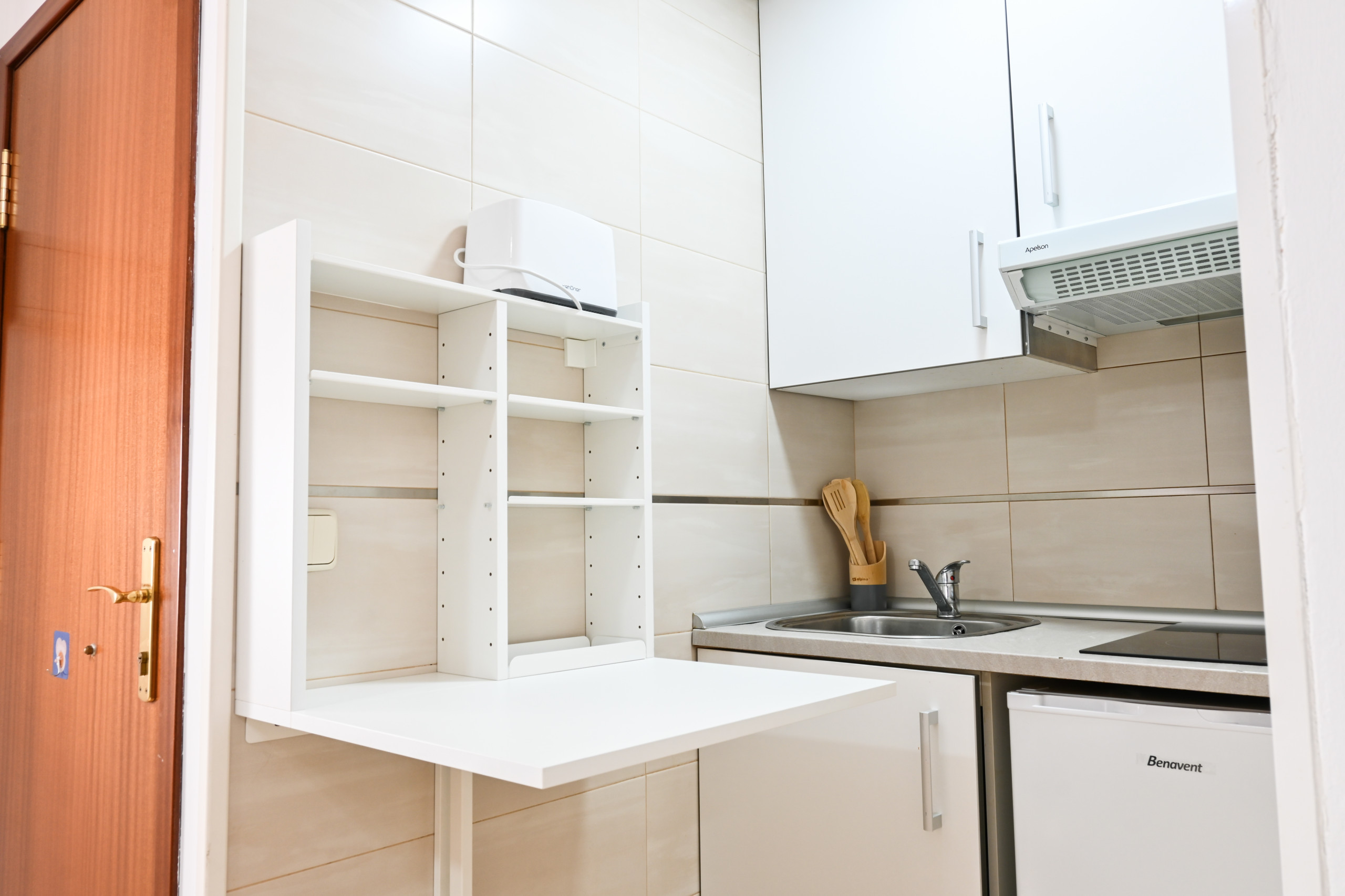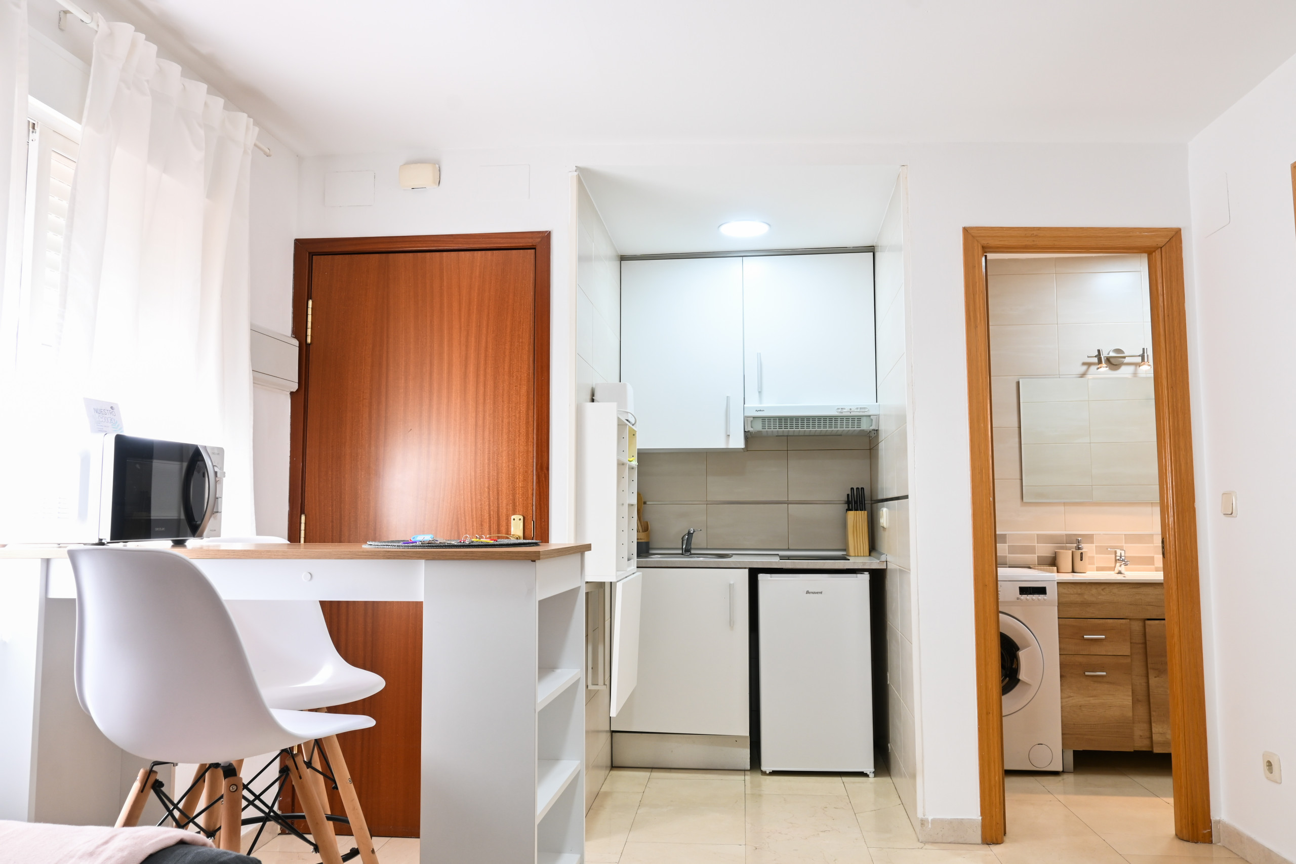 - The kitchen, fully integrated into the living room, is equipped with everything necessary to prepare your daily meals. It includes a ceramic hob, microwave, sink, and sufficient storage space. Its open design allows you to interact with the rest of the space while cooking, maintaining a sense of spaciousness and connectivity.