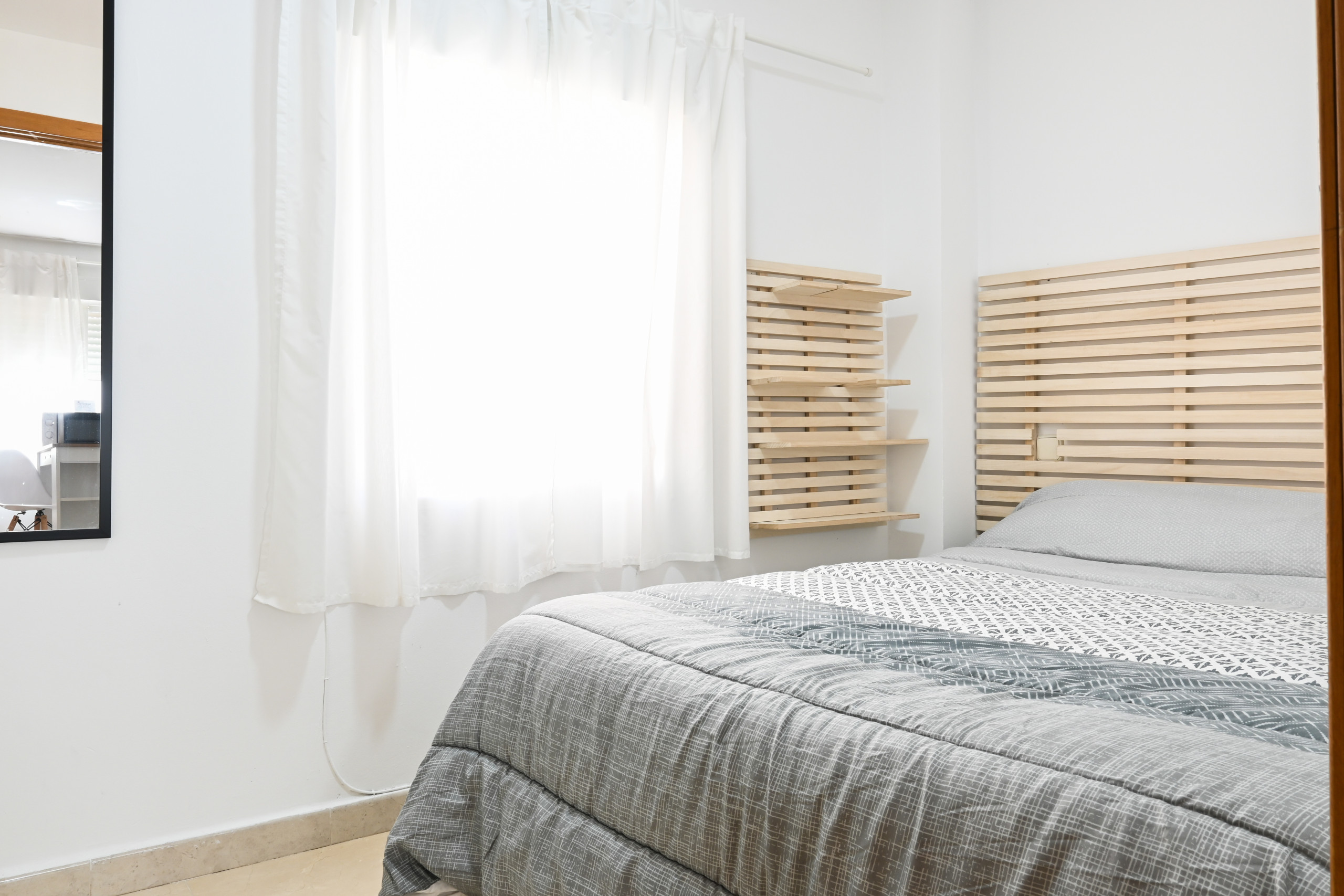 - The apartment features an independent bedroom, providing a private and cosy space to rest. It is furnished with a comfortable bed, a spacious wardrobe, and modern decor that creates a relaxing atmosphere.