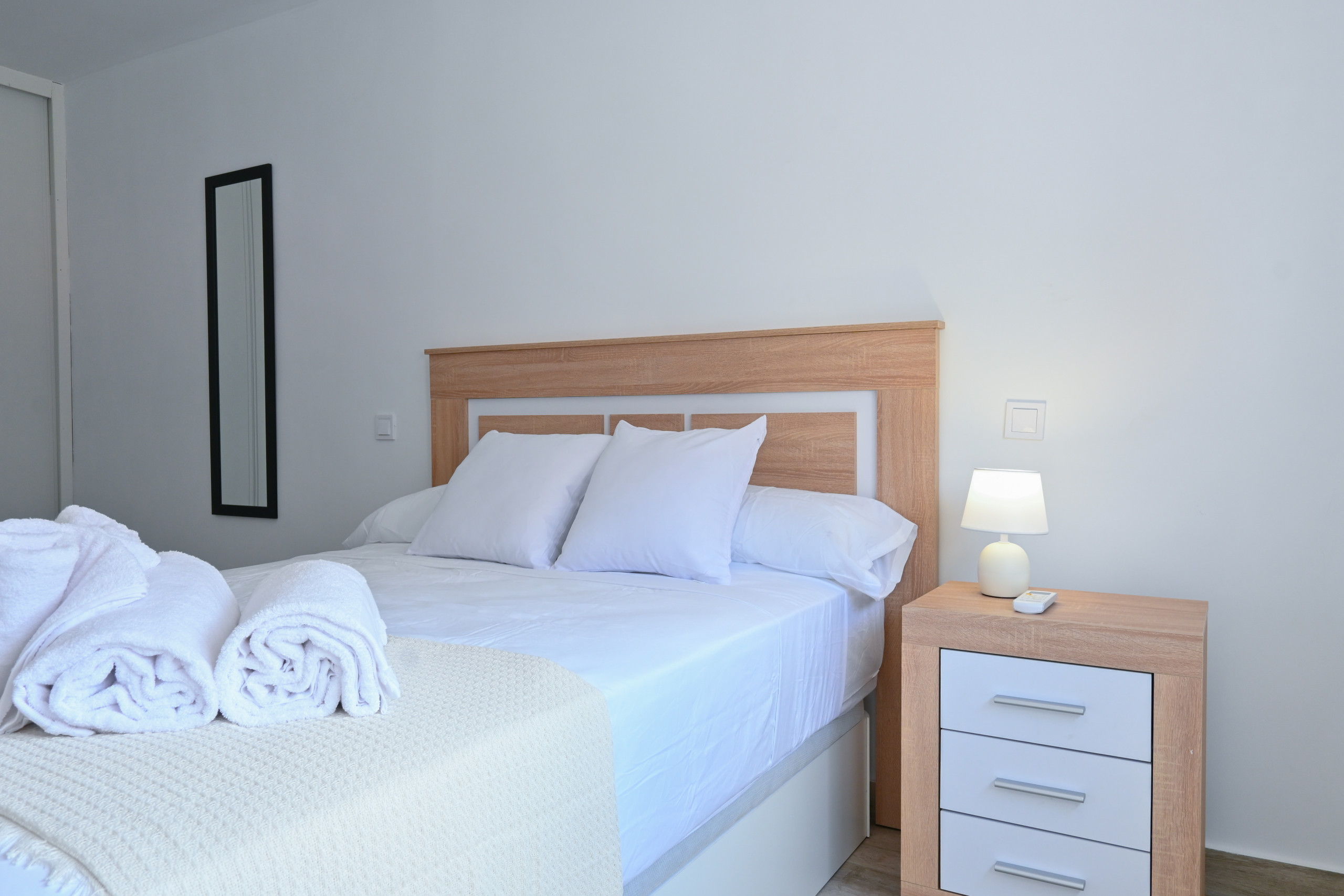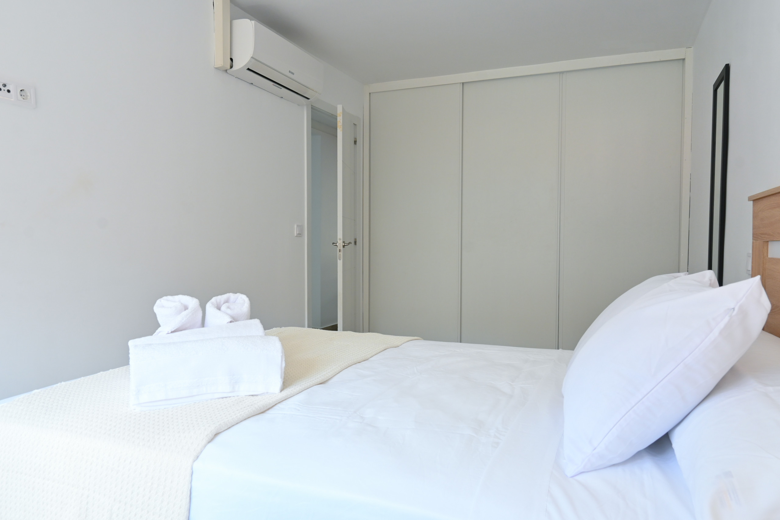 The bedroom is a peaceful retreat, designed to offer an atmosphere of rest and relaxation. Equipped with a comfortable double bed and built-in wardrobes, this space allows for efficient storage of your clothes and belongings. Air conditioning in the bedroom ensures that you can enjoy a cool and pleasant environment during the warmer months, guaranteeing a restful sleep. Natural lighting coming through the windows creates a bright and welcoming environment, perfect for waking up each morning with energy.