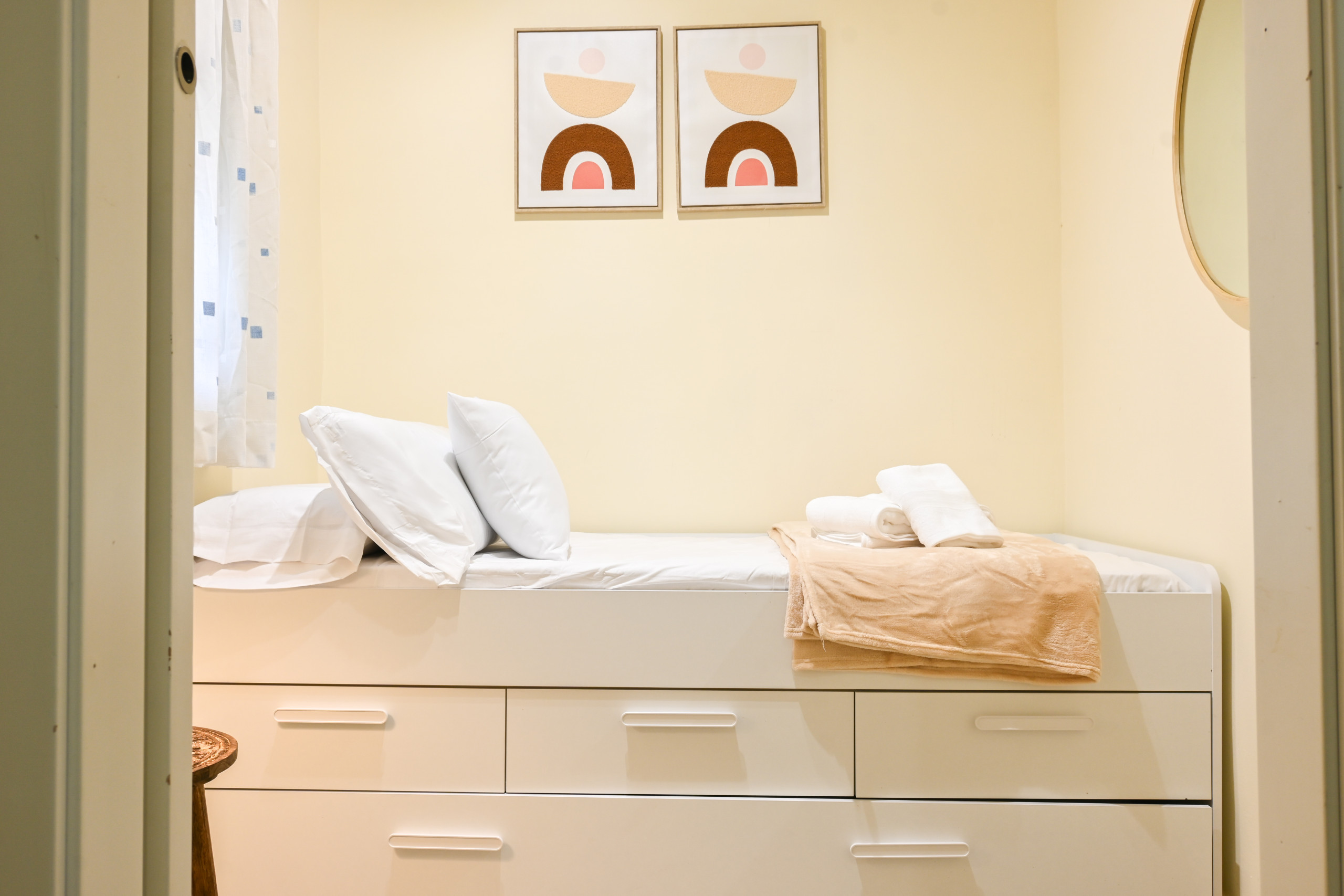 The flat has two bedrooms, one with a double bed and another with a trundle bed, perfect for children or guests. Both bedrooms are designed to offer restful sleep, with high-quality mattresses and soft, comfortable bedding.