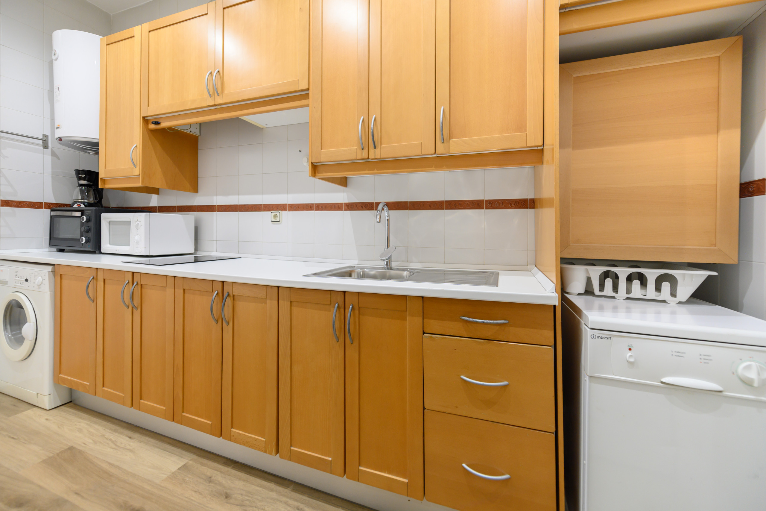 • Fully equipped kitchen: Refrigerator, microwave, washing machine, dishwasher, kitchen utensils, and ample storage space.