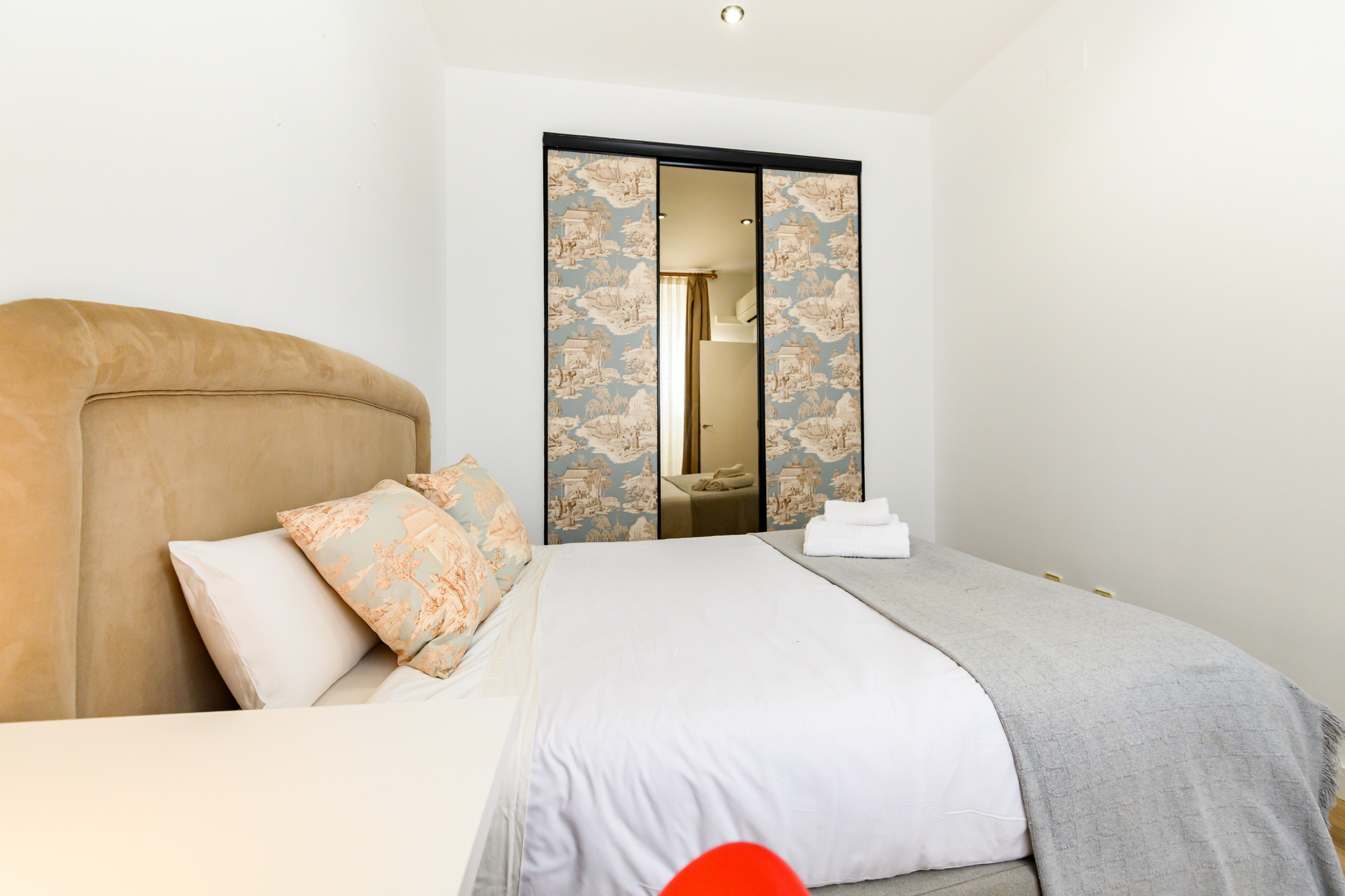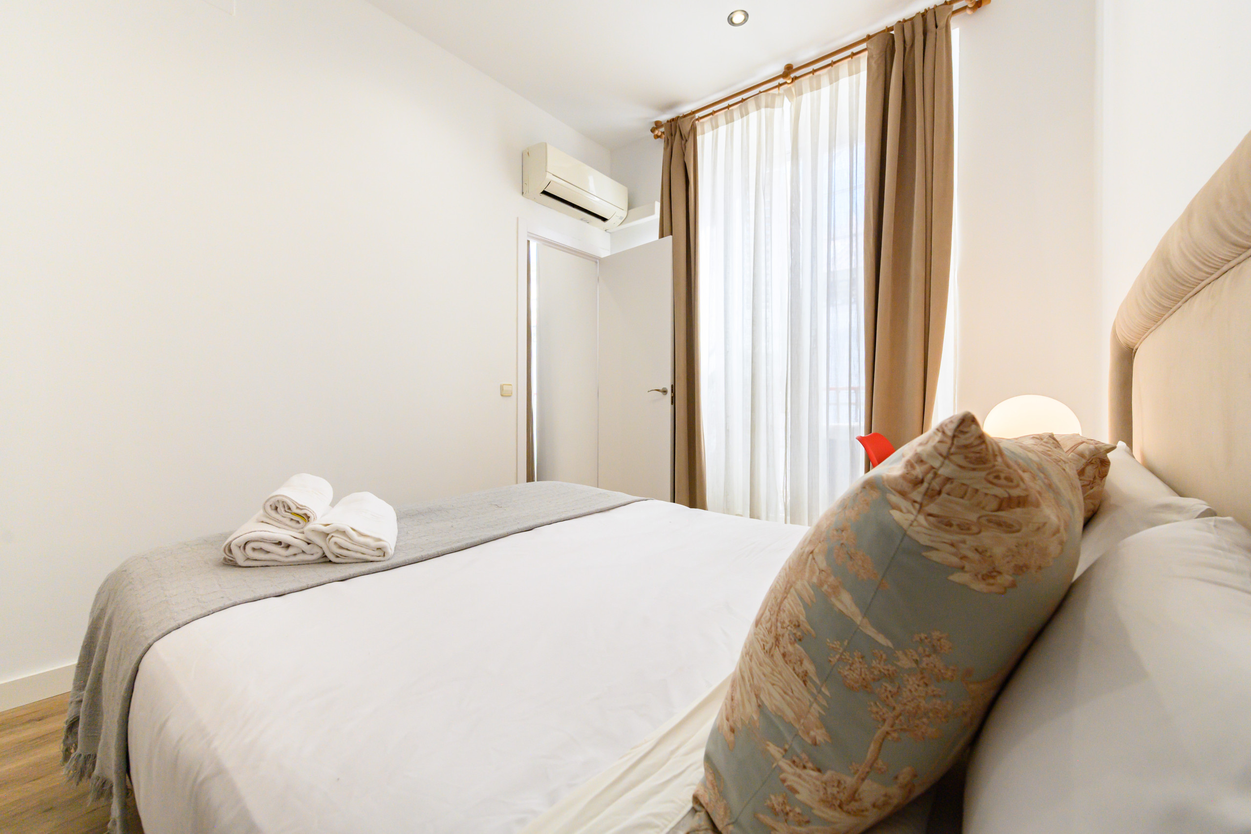 • Bedroom 2: Double bed, built-in wardrobe, mirror, air conditioning, desk, and a large window with excellent natural light.