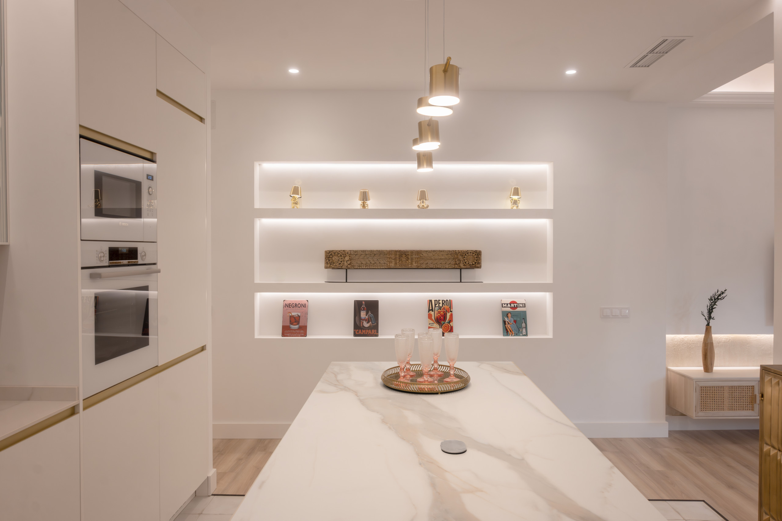 The kitchen has a semi-open design with a central island, ideal for those who enjoy personalization and functionality. This space combines modern aesthetics with practicality.