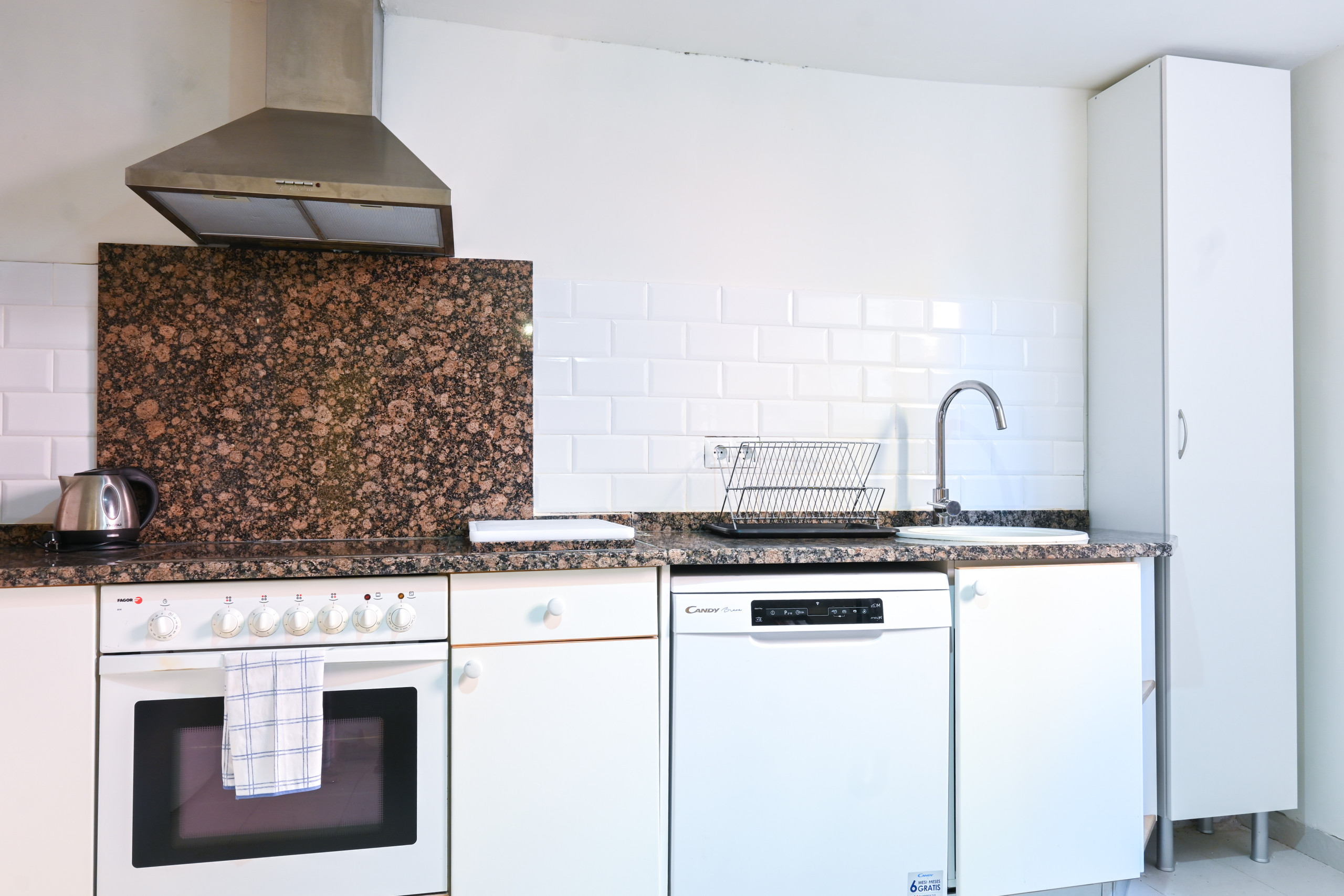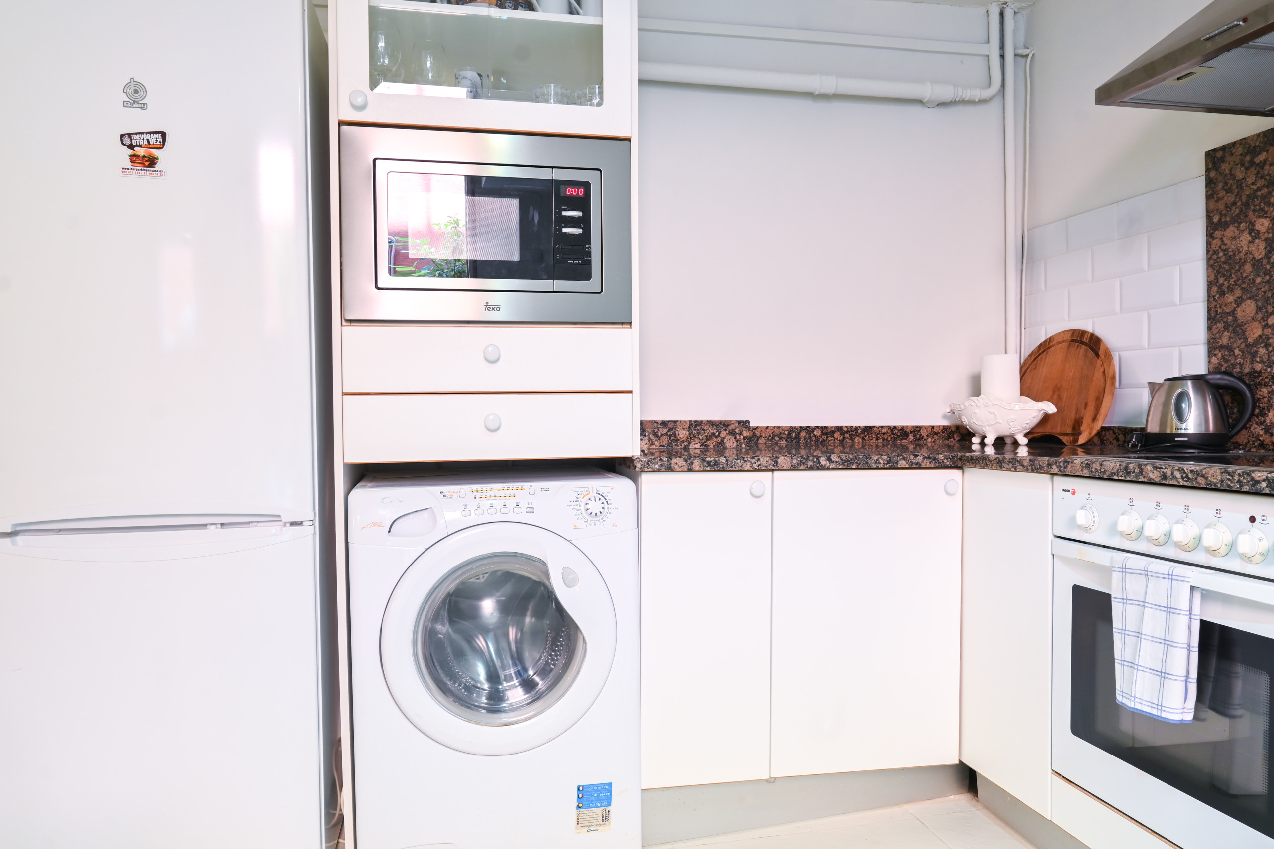 In the induction open plan kitchen, refrigerator, microwave, oven, freezer, dishwasher, dishes/cutlery, kitchen utensils, coffee machine, frying pan, toaster, kettle, juicer and kitchenware are provided.