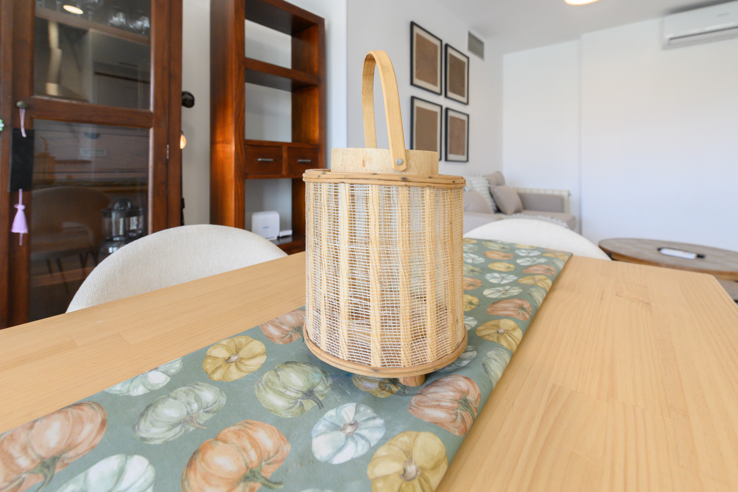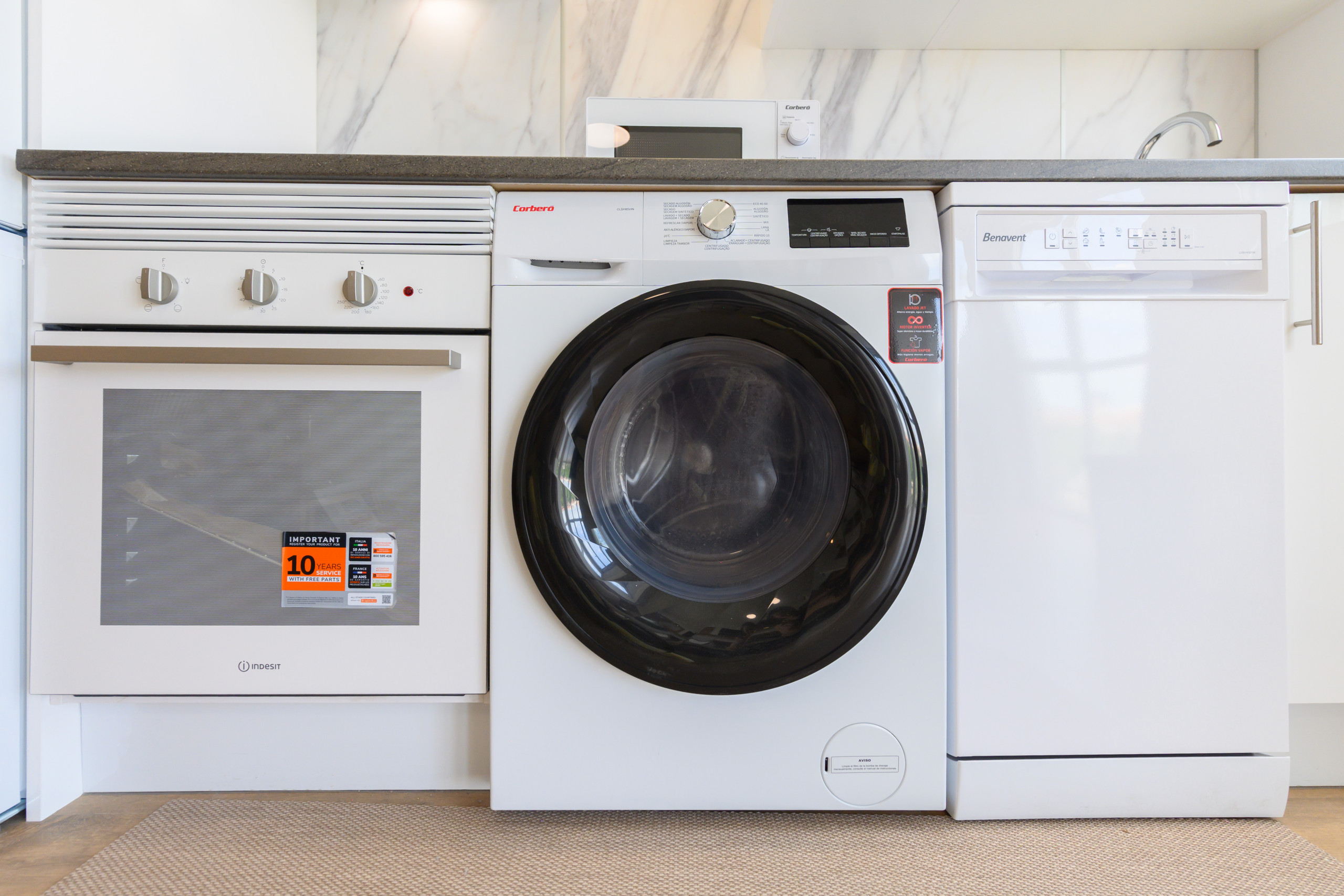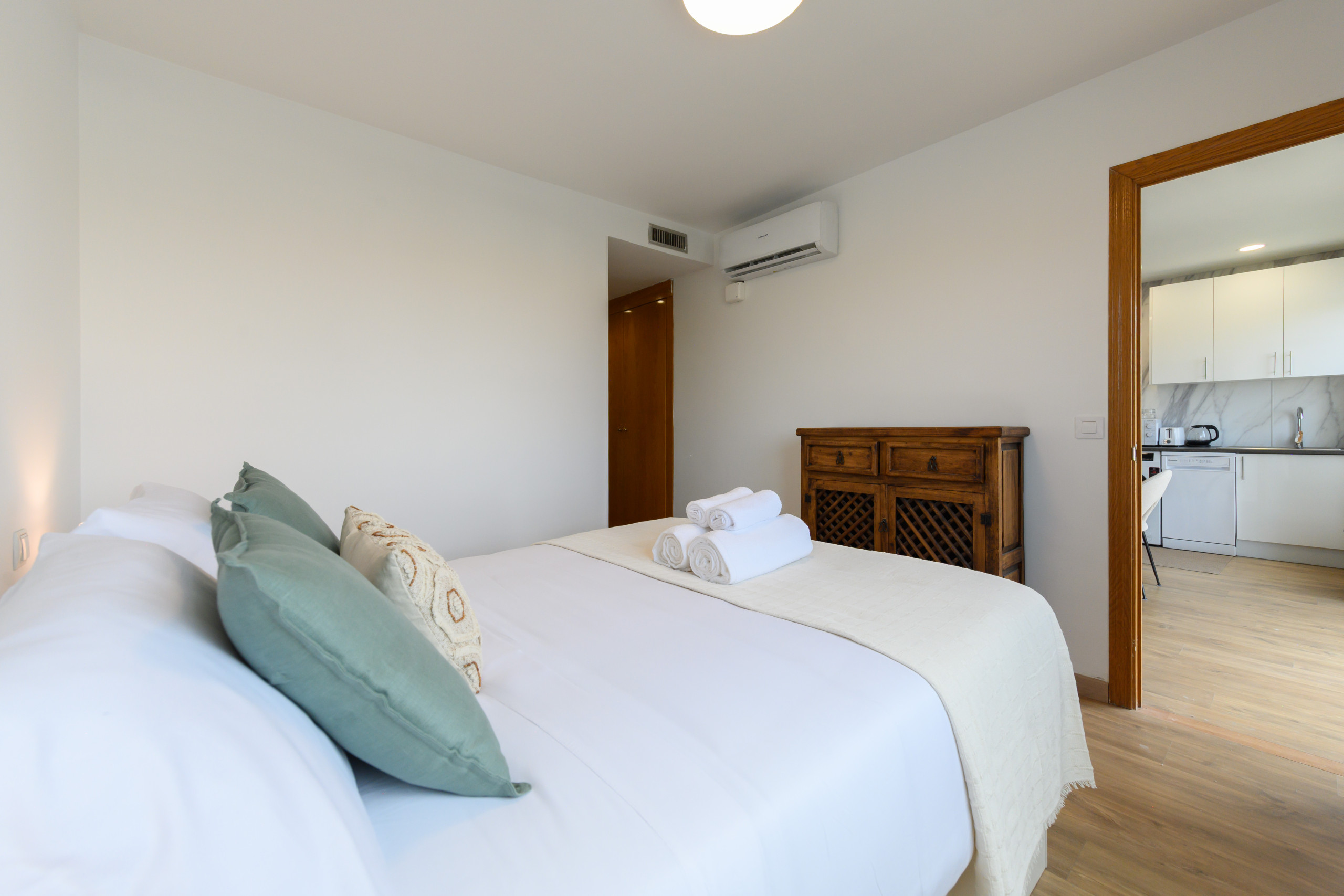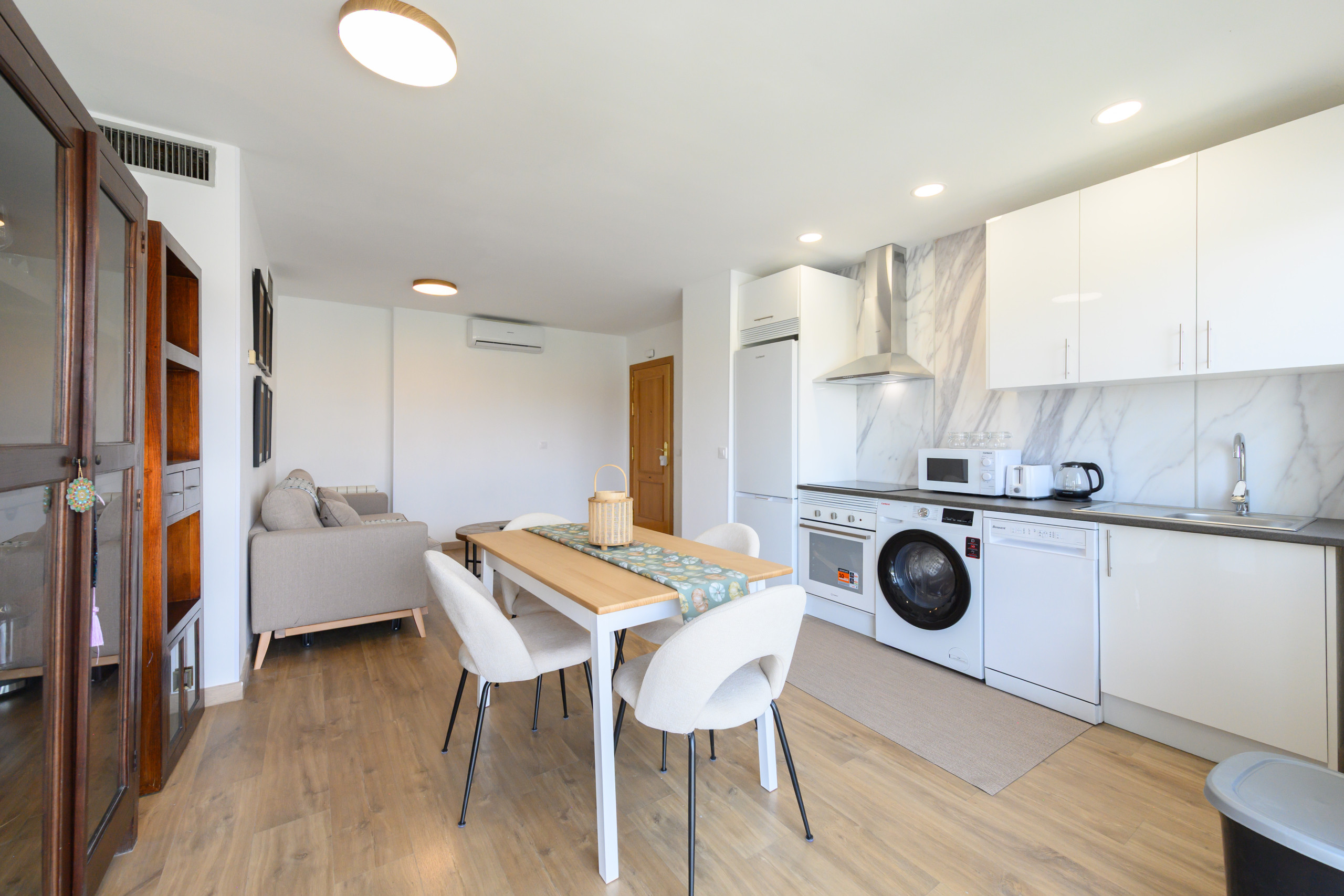 The kitchen, integrated into the main space, is fully equipped with all necessary appliances —fridge, oven, microwave, ceramic hob, extractor hood, dishwasher and washing machine— as well as having complete kitchenware and storage cupboards, which allows for enjoying a practical and pleasant culinary experience.