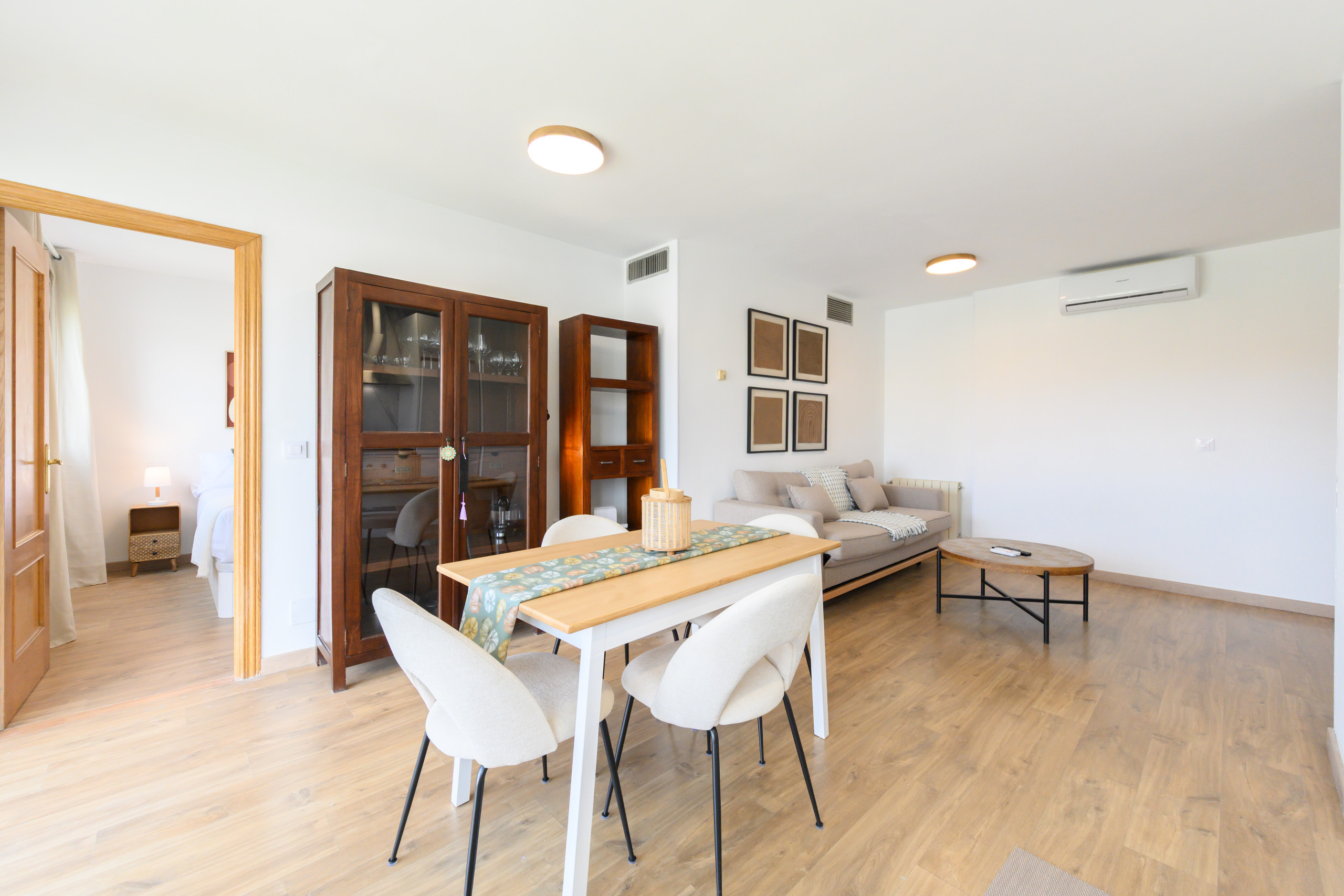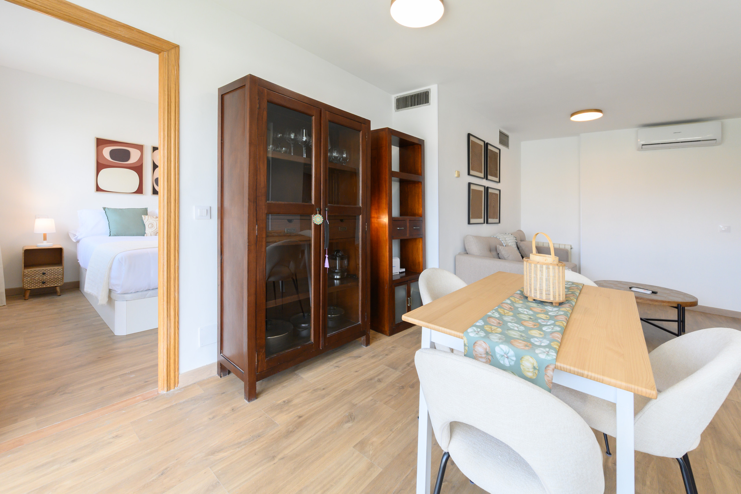 Upon entering, a living-dining room with large windows stands out, flooding the space with natural light, creating a warm and comfortable atmosphere. The living room is furnished with a comfortable sofa bed, ideal for accommodating occasional guests without compromising on style.