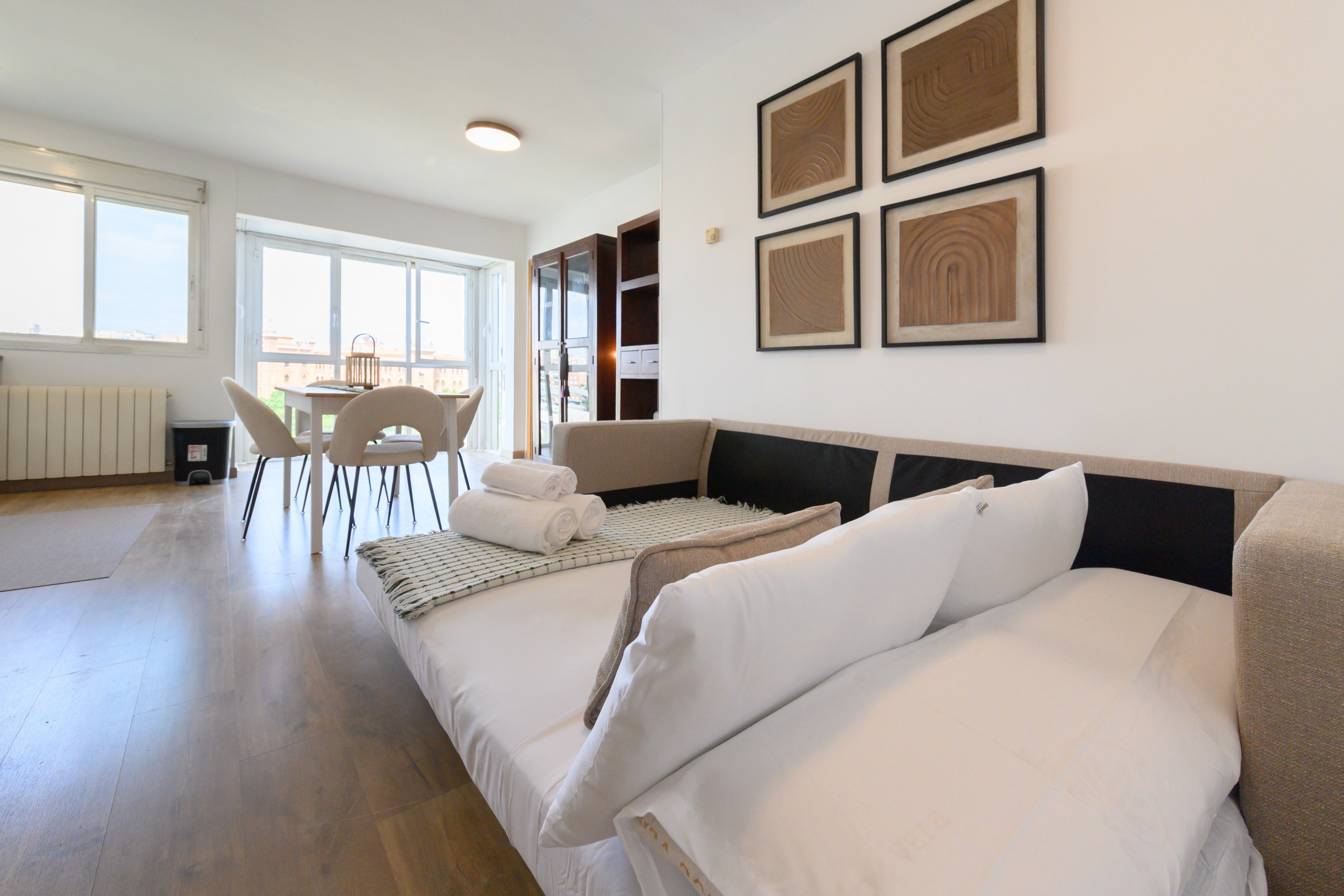 › Holiday apartments Spain › Holiday apartments Madrid › Holiday apartments Ciudad Lineal › Modern 1-bedroom flat with large windows and sofa bed for guests in Madrid