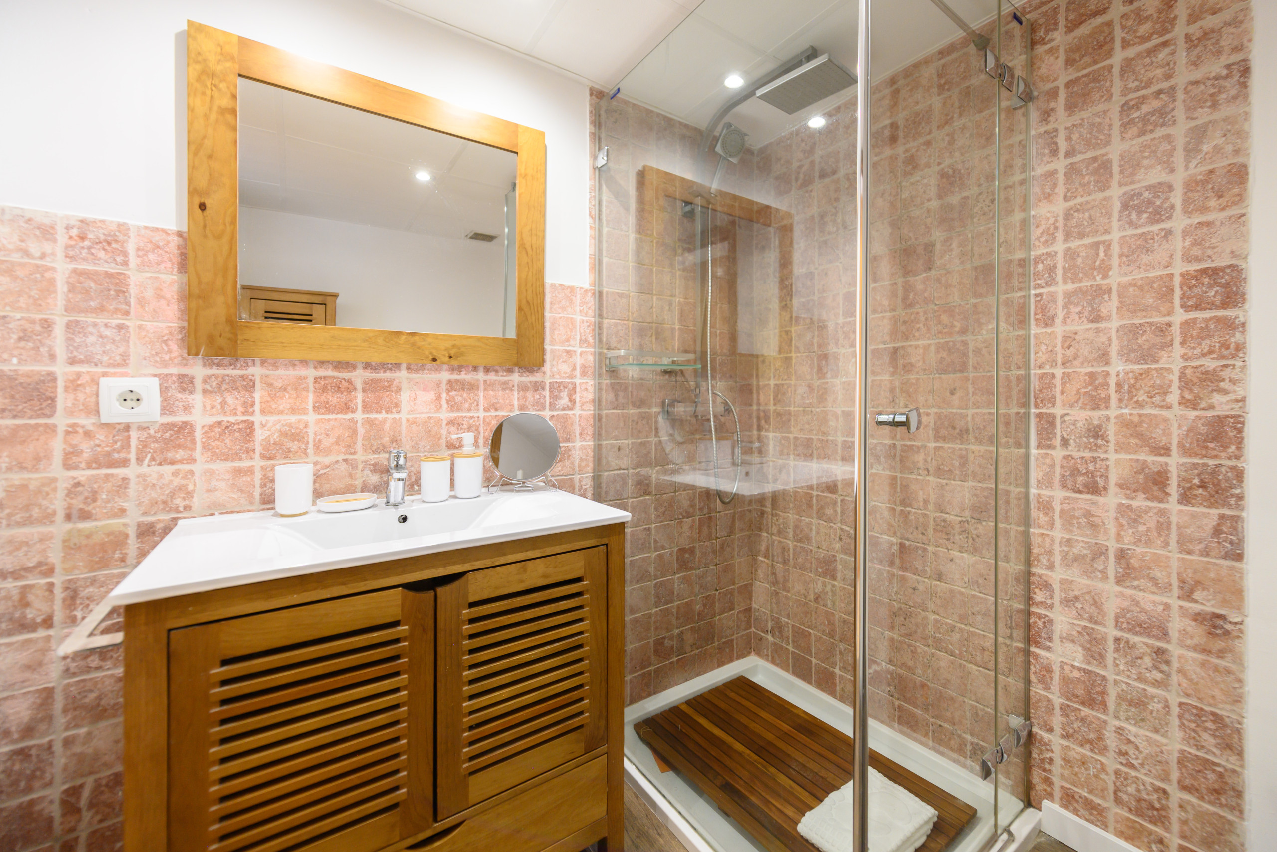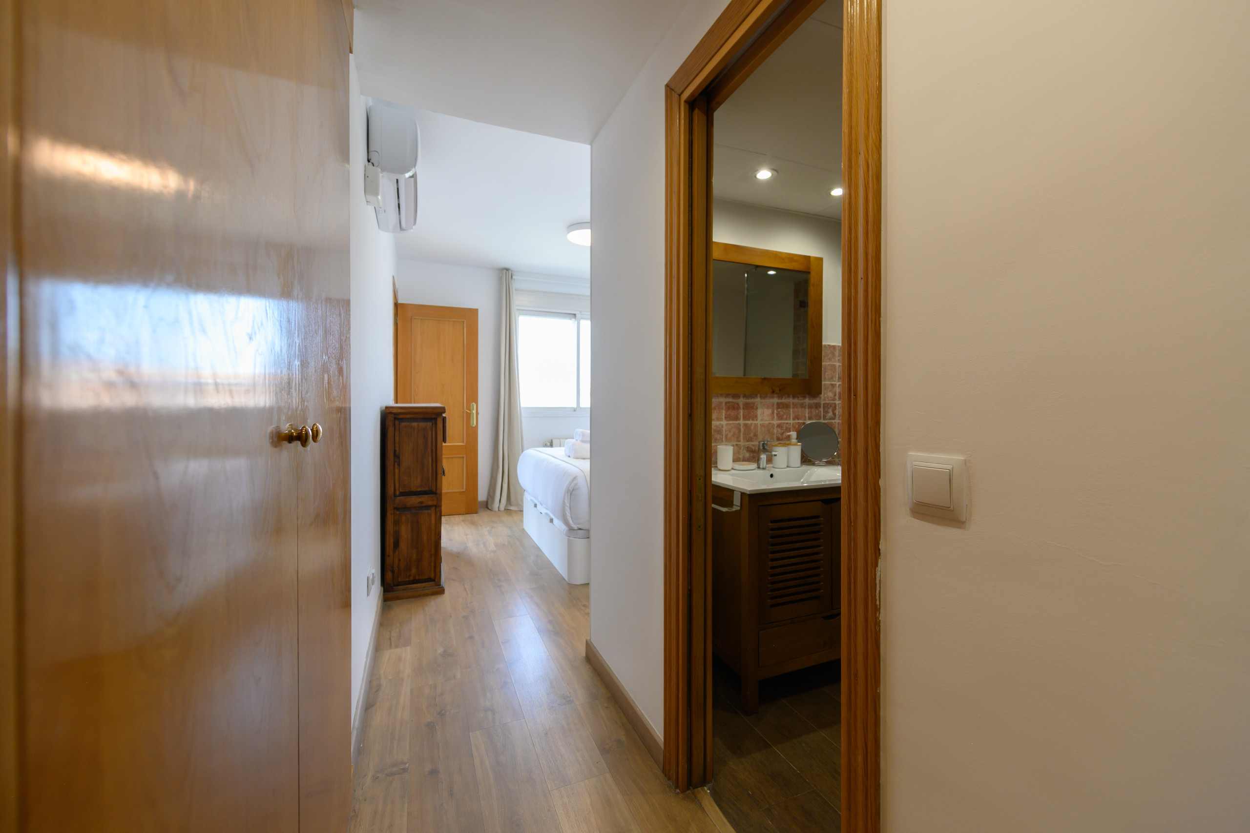 The main bedroom has a double bed and wardrobe, offering a quiet and comfortable environment for rest. From the bedroom, access is provided to an en-suite bathroom, complete and modern, with shower tray, washbasin with furniture, toilet and mirror.