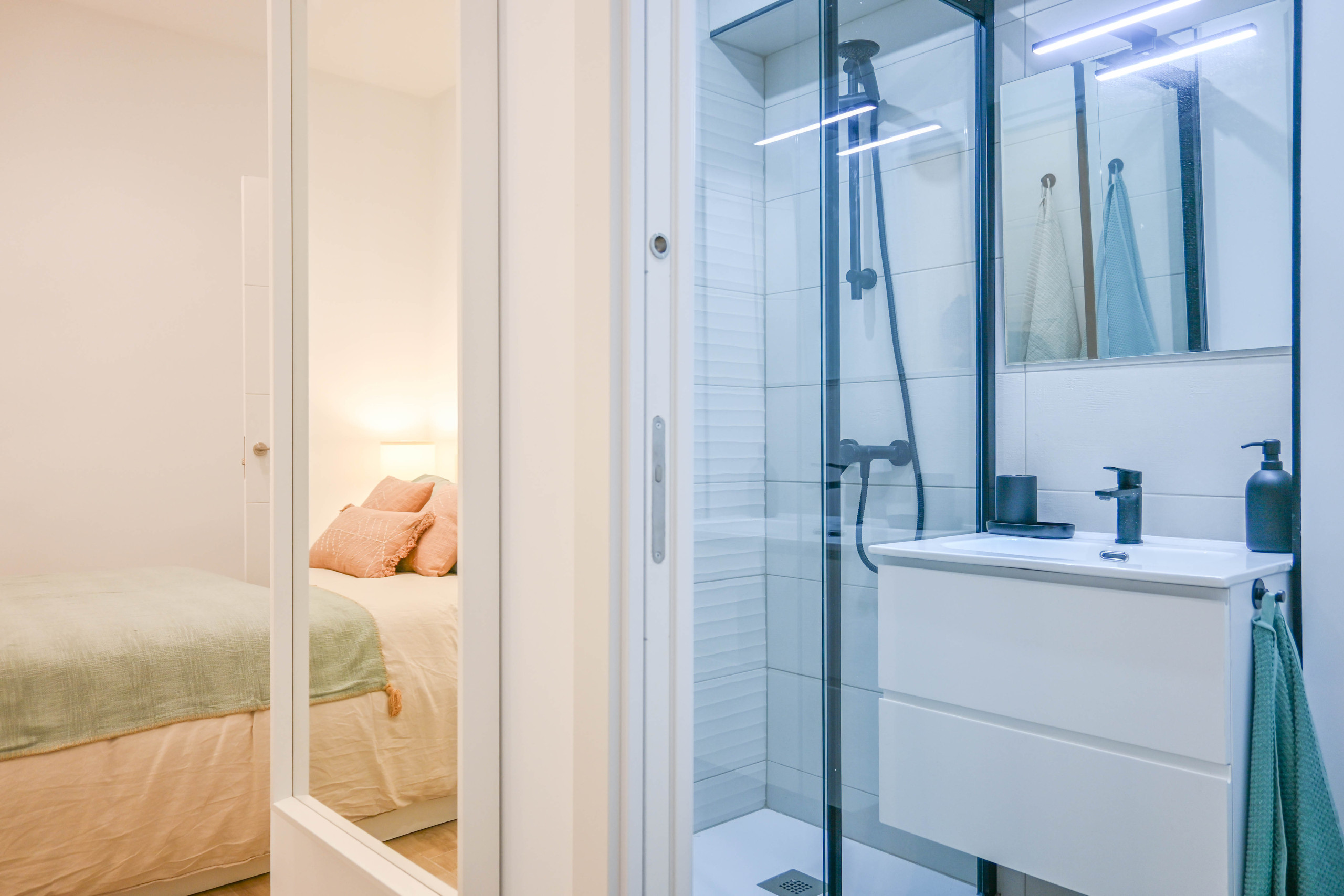 The double room is spacious and features an integrated wardrobe, which facilitates the storage and organisation of your belongings during your stay. The en-suite bathroom, with a modern design, includes a shower tray and quality finishes, offering a comfortable and functional space.