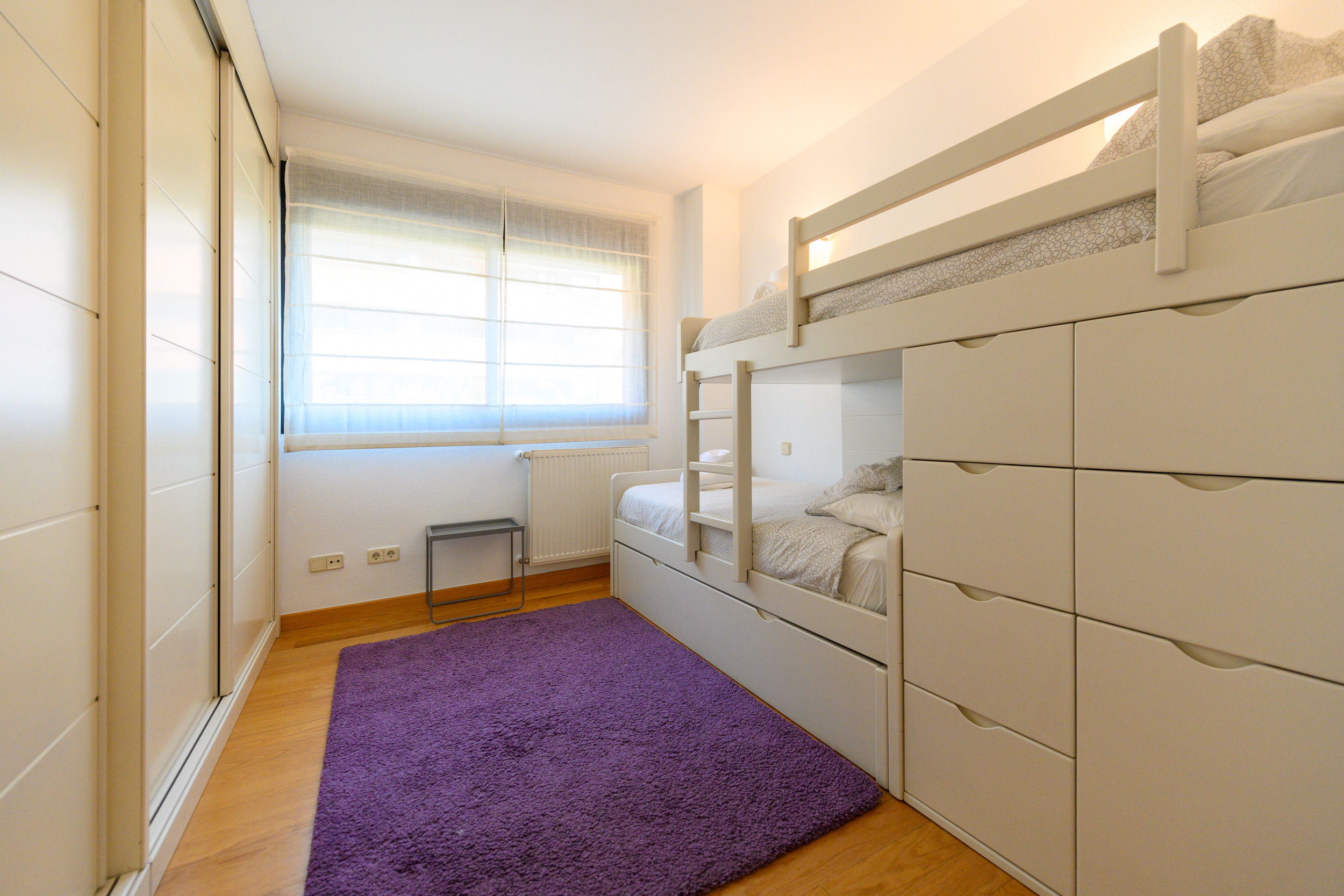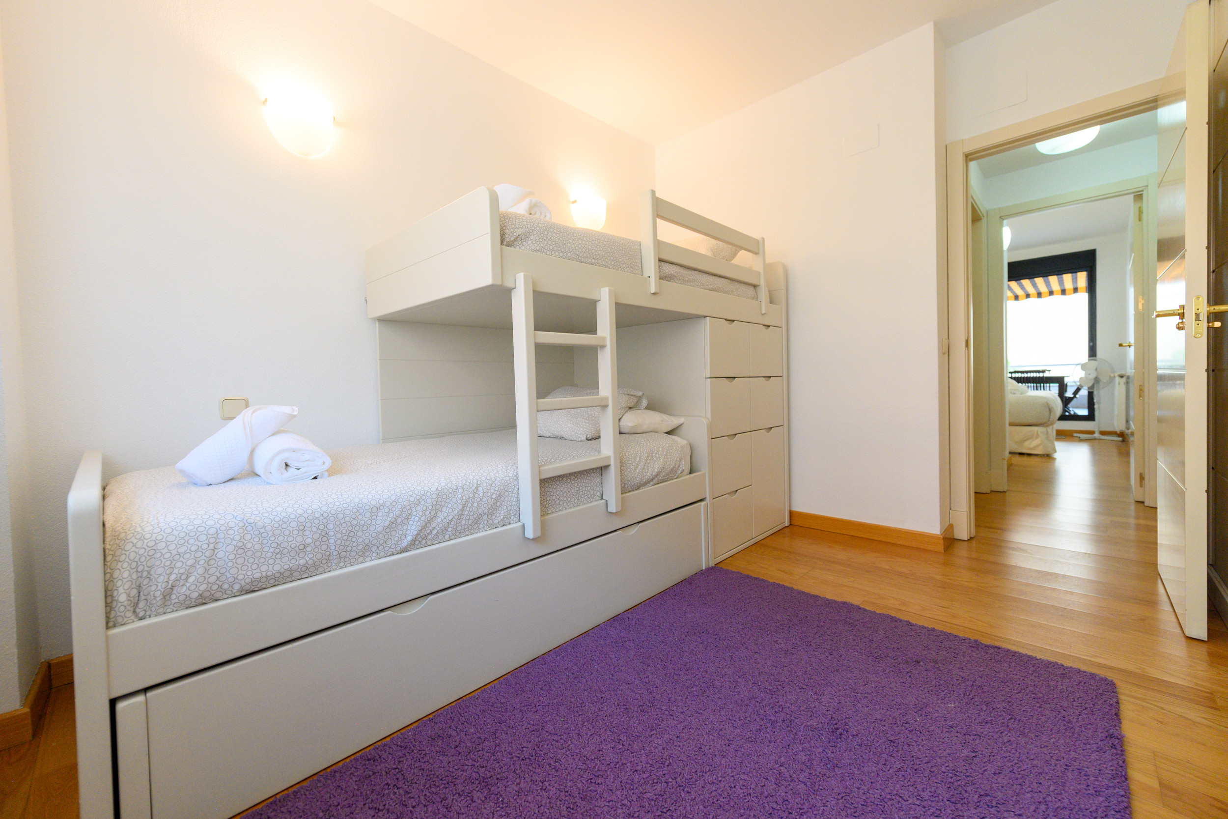 The apartment has two bedrooms. The first bedroom is equipped with a double bed, providing a cosy and relaxing space to rest. The second bedroom has a bunk bed with three single beds, perfect for children or to accommodate several guests comfortably and functionally.