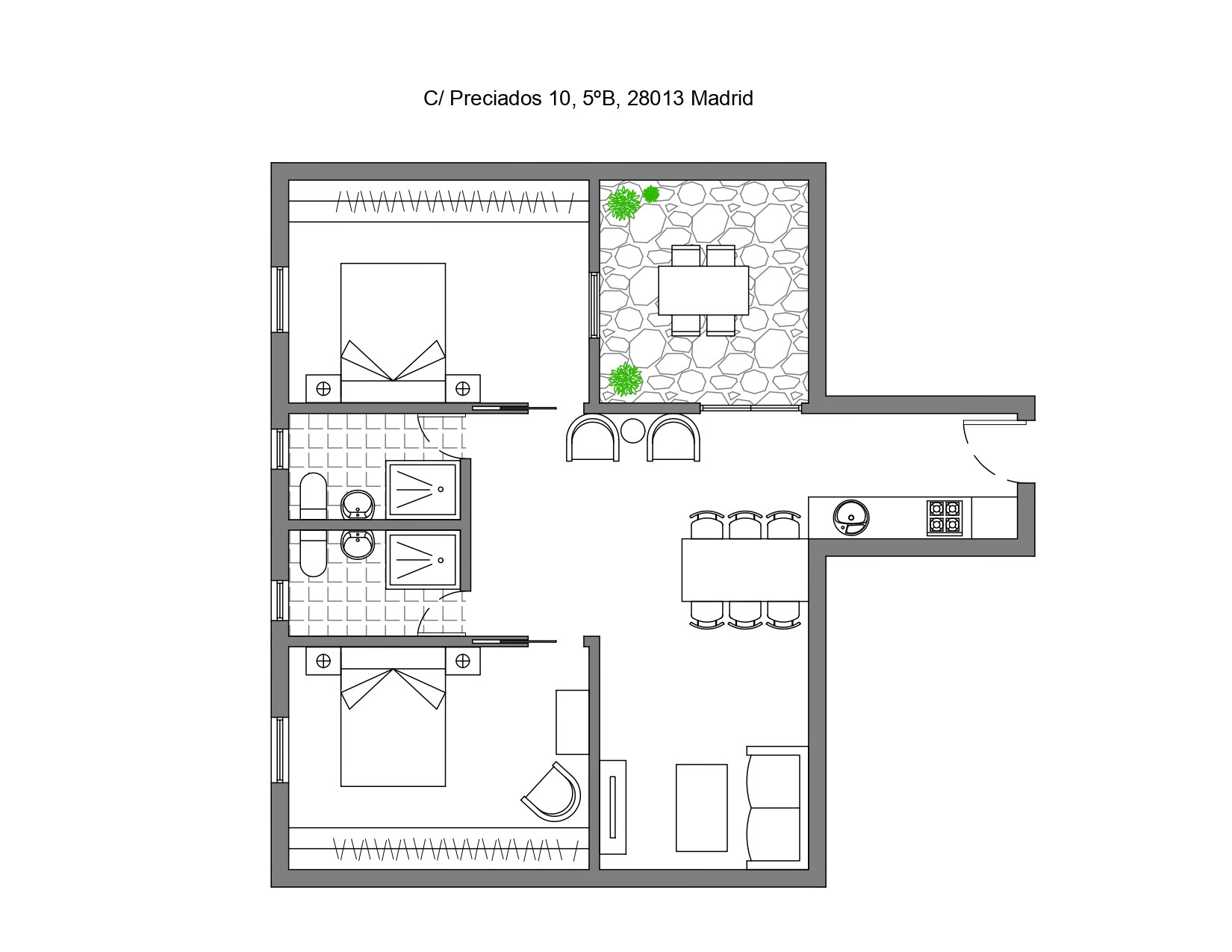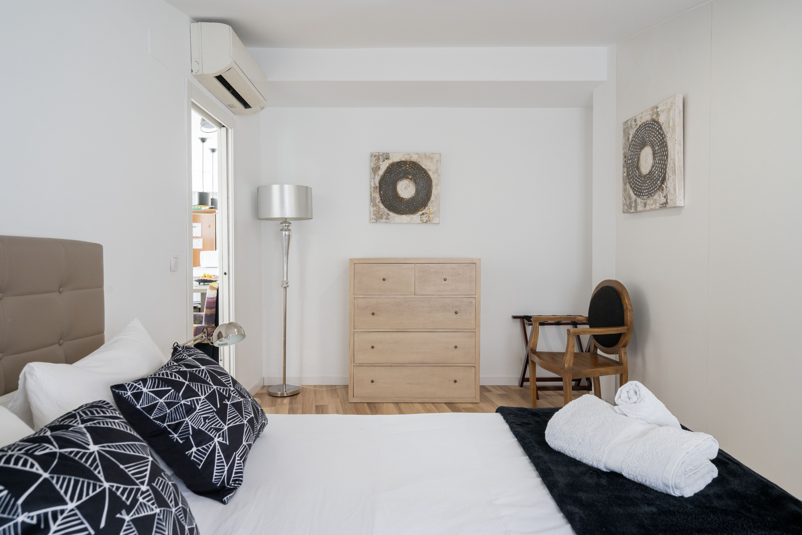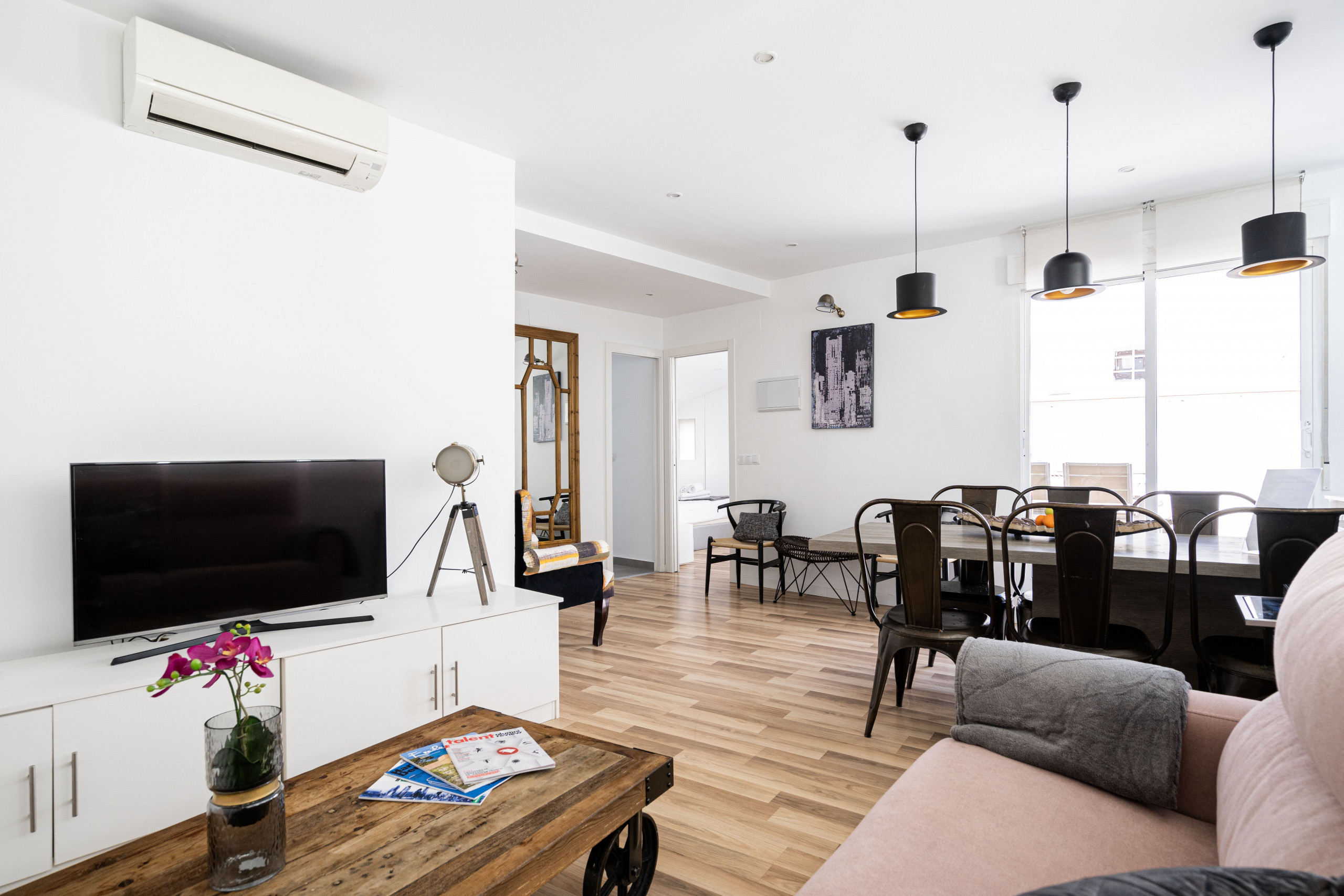 The apartment has kitchen, a living room, two bathrooms with shower, living room and two spacious bedrooms. It is newly renovated and furnished with a modern and minimalist style. The appliances are the latest generation and are perfectly integrated into the design. The rooms are light and airy, with double windows. Beds are 150cm, Queen Size