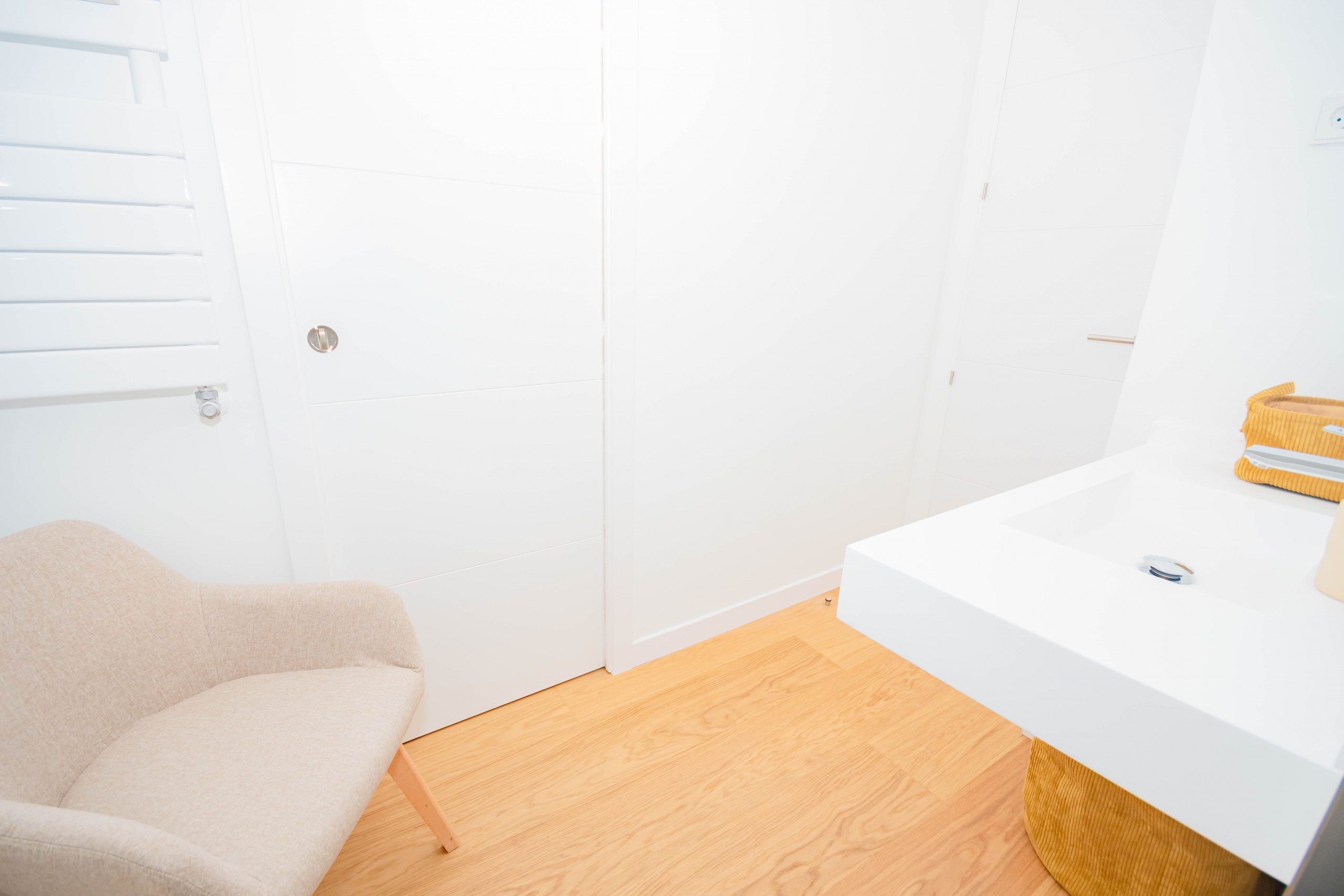 This property has a bedroom with a comfortable double bed, bedding and large windows that allow natural light and ventilation. The decor is modern and cosy, with a minimalist style that creates a relaxing and welcoming atmosphere.