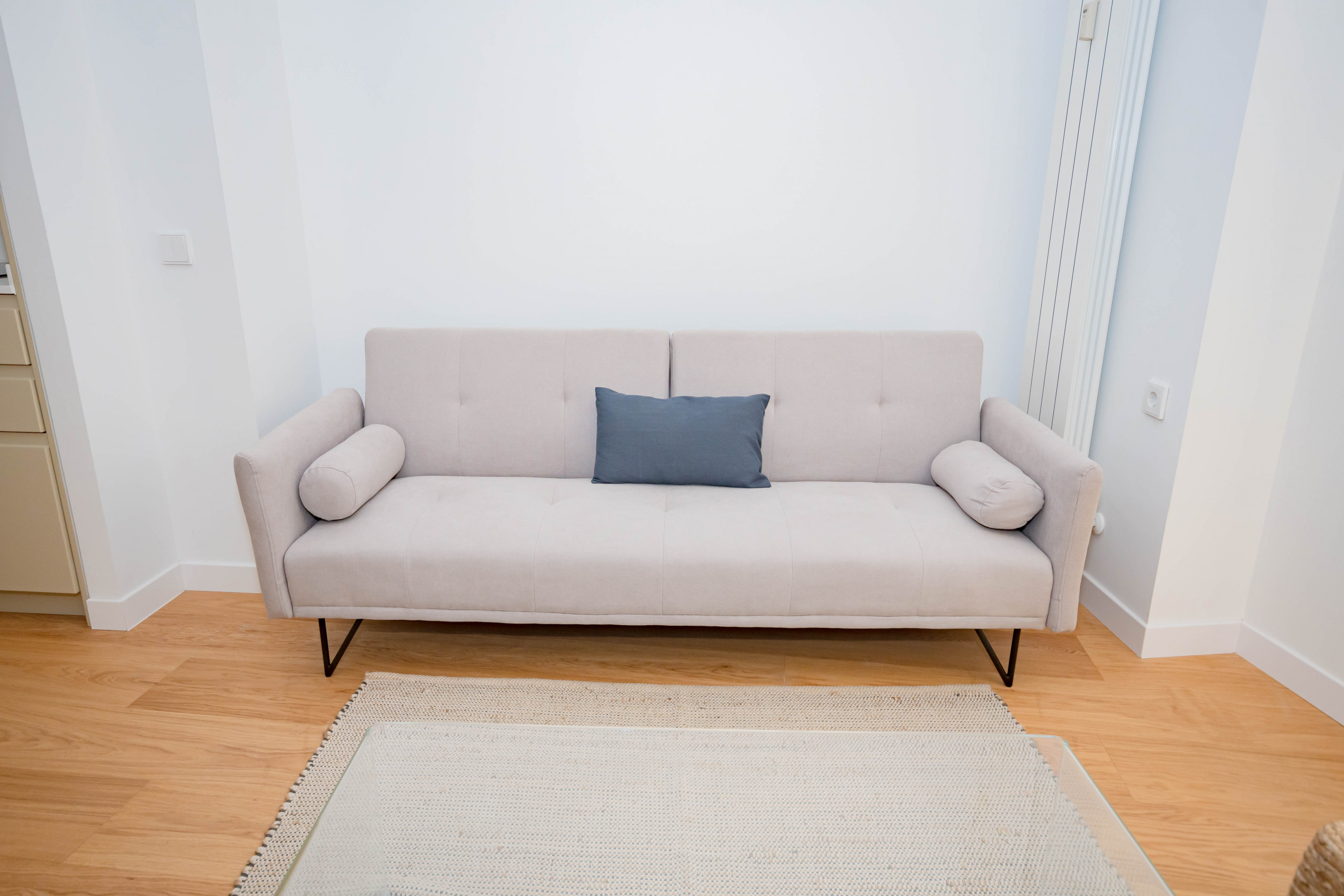 The living room has a single sofa bed, perfect for an additional person. It also has a coffee table, a flat-screen television and a storage unit. The decor is modern, simple and cosy, ideal for relaxing after a day in the city.