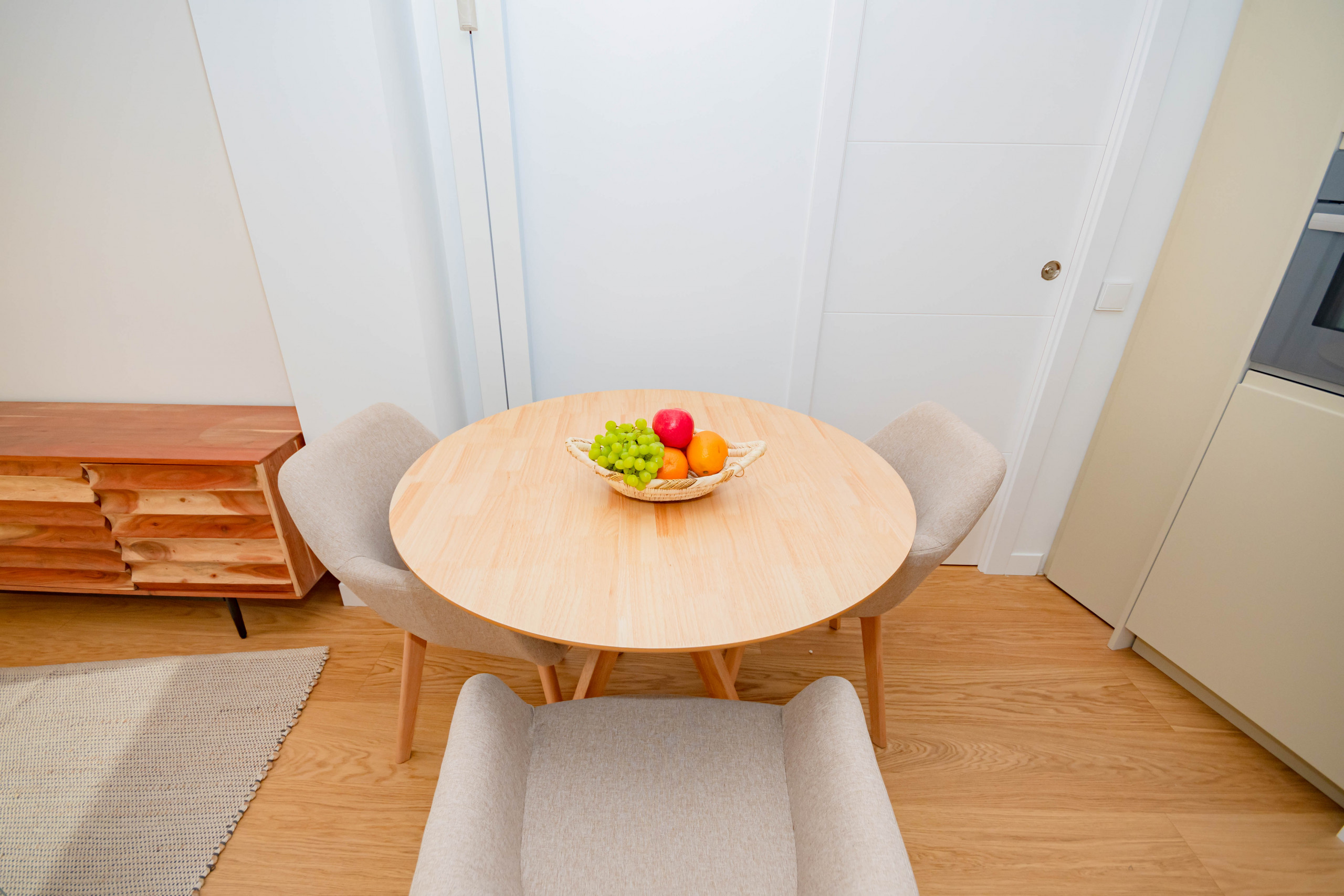 The kitchen is independent and has everything necessary to cook your favourite meals. It is fully equipped with a fridge, dishwasher, hobs, and small appliances such as a coffee maker and toaster. It also has a dining table with seating for four people.