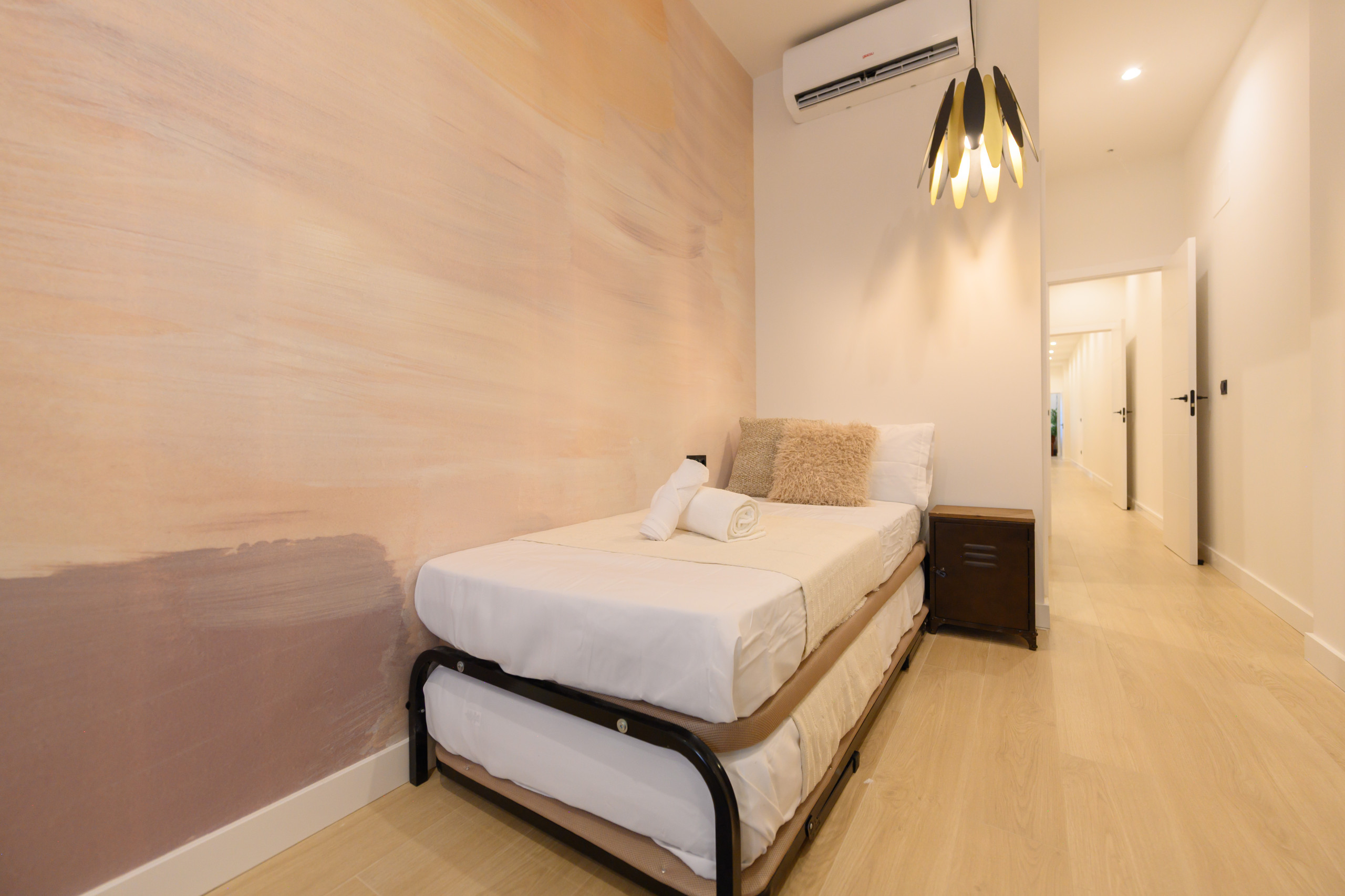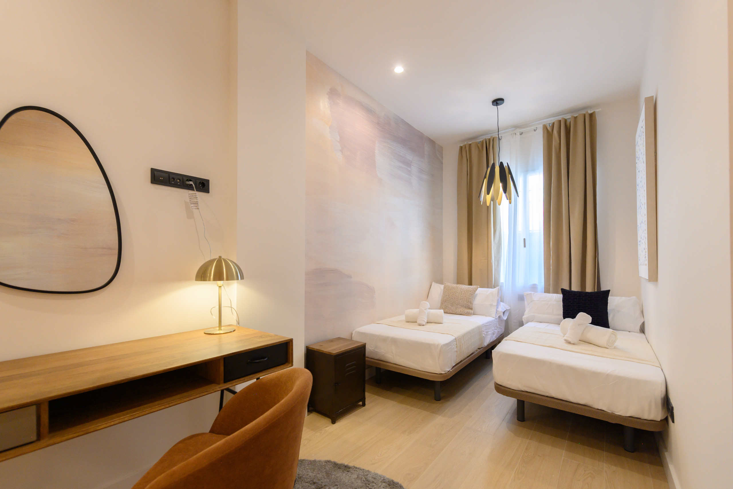 o A third bedroom ideal for families or groups, with three single beds, a desk, and access to a complete bathroom with a shower tray.