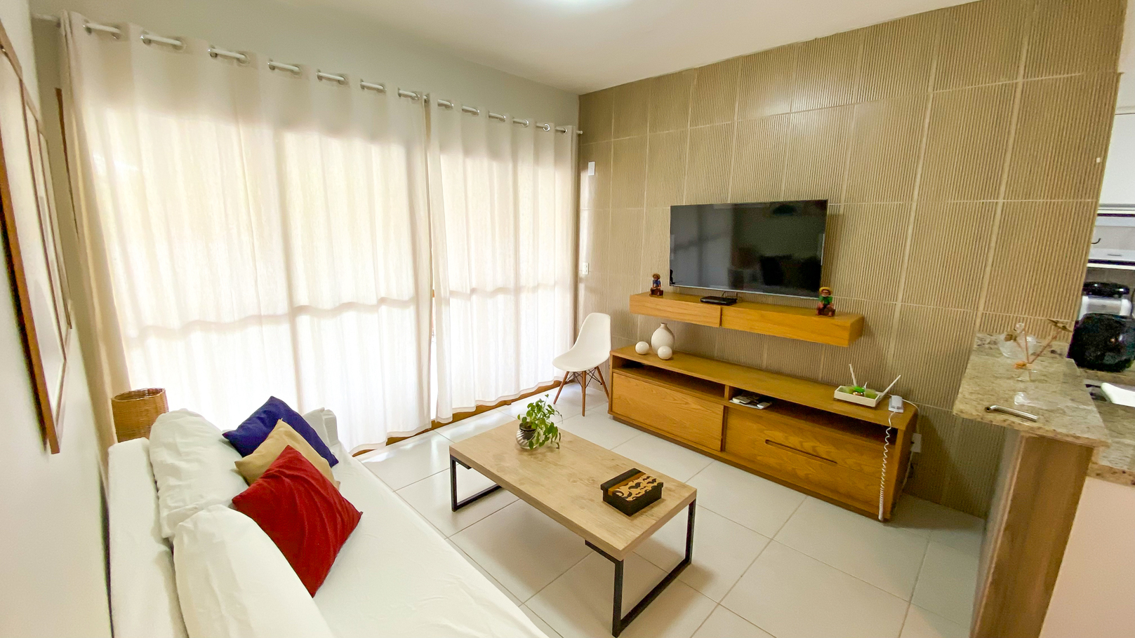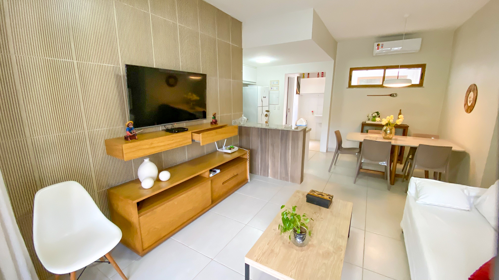 - Complete living room with comfortable sofa, dining table, air conditioning and smart TV