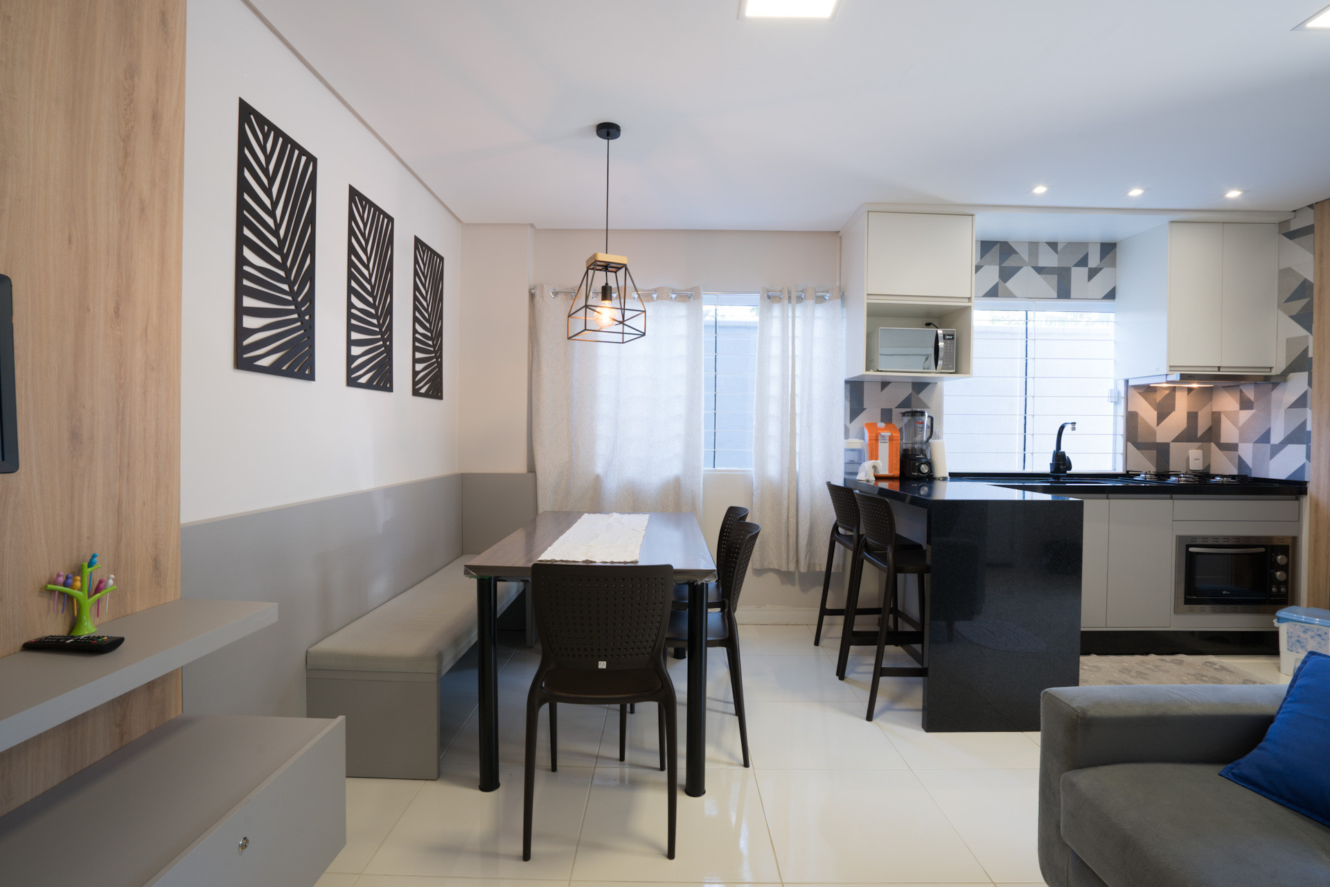 - Cozinha americana com cooktop, exaustor, forno elétrico, geladeira, micro-ondas, lava-louças, liquidificador, panelas, louças e utensílios