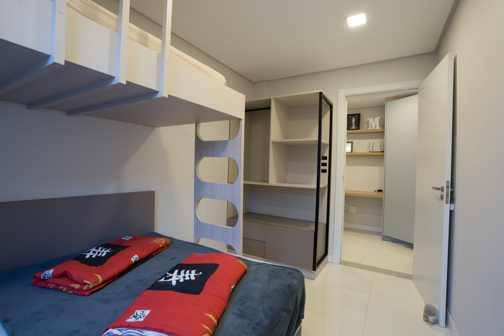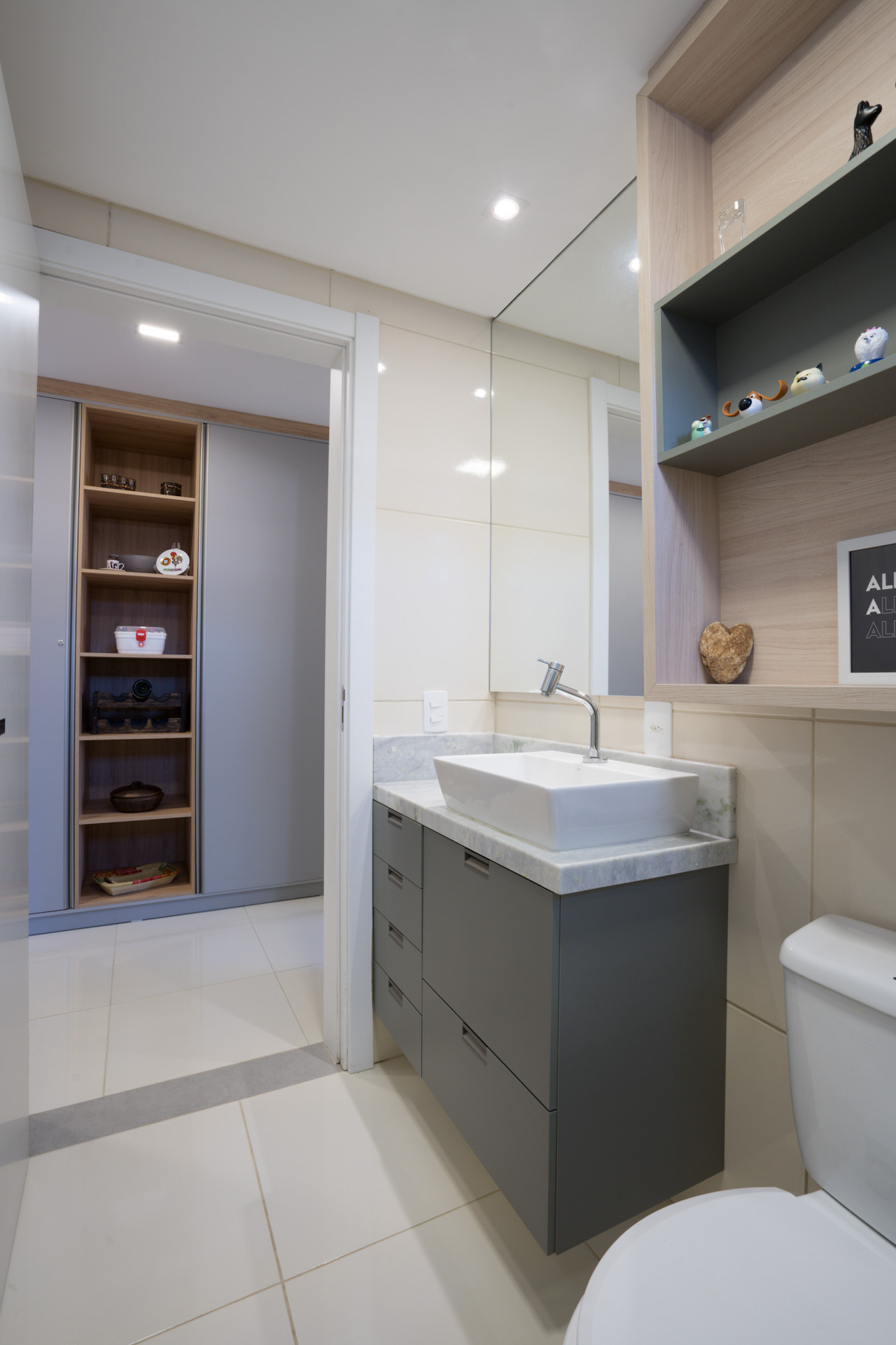 - Banheiros com chuveiro elétrico, box de vidro, armário e espelho