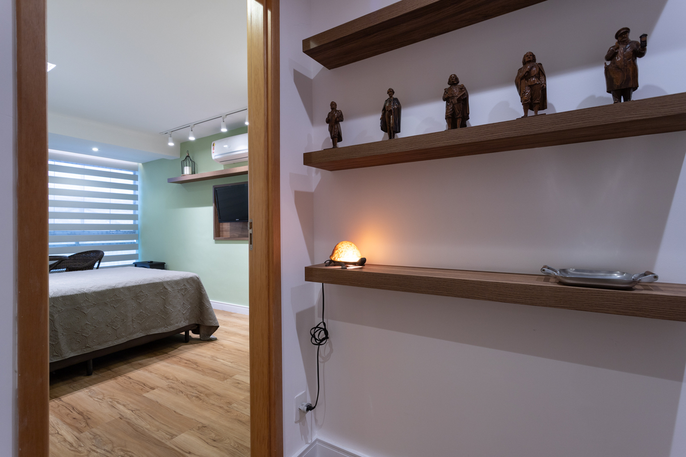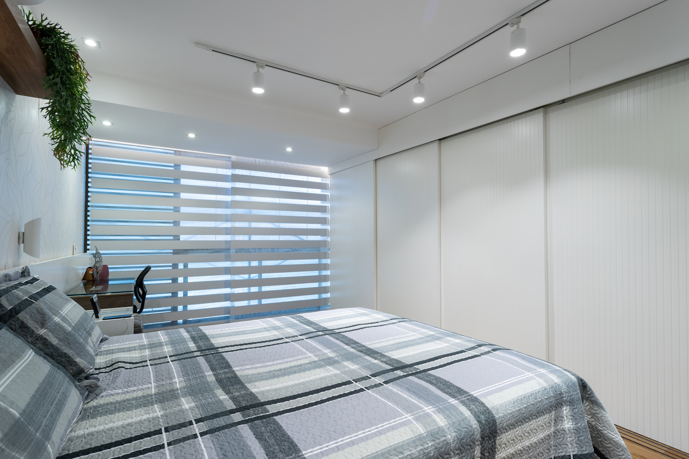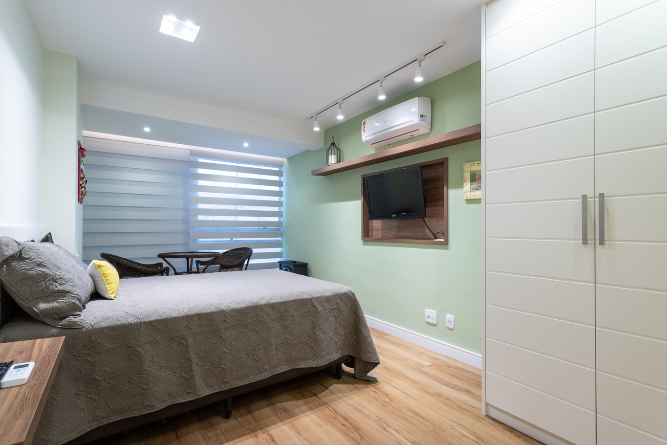 - Bedroom 2 with queen bed, air conditioning, smart TV, work desk, closet, rug, curtains and sliding door for greater privacy