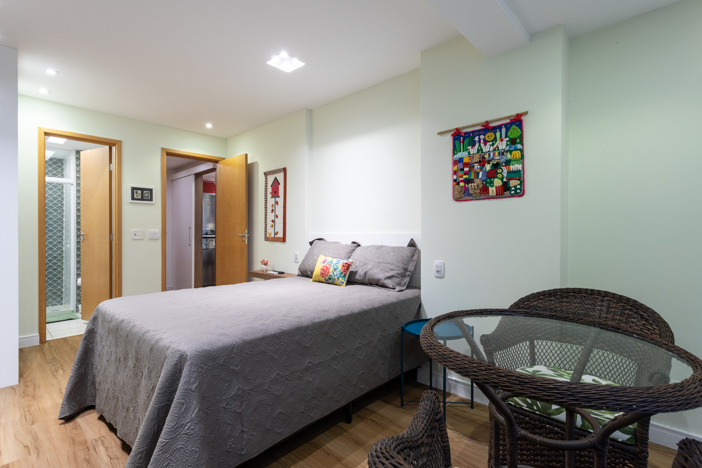 - Bedroom 1 (suite) with double bed, air conditioning, smart TV, portable heater, mattress protector and bathroom with gas shower, glass/acrylic box and essential hygiene items