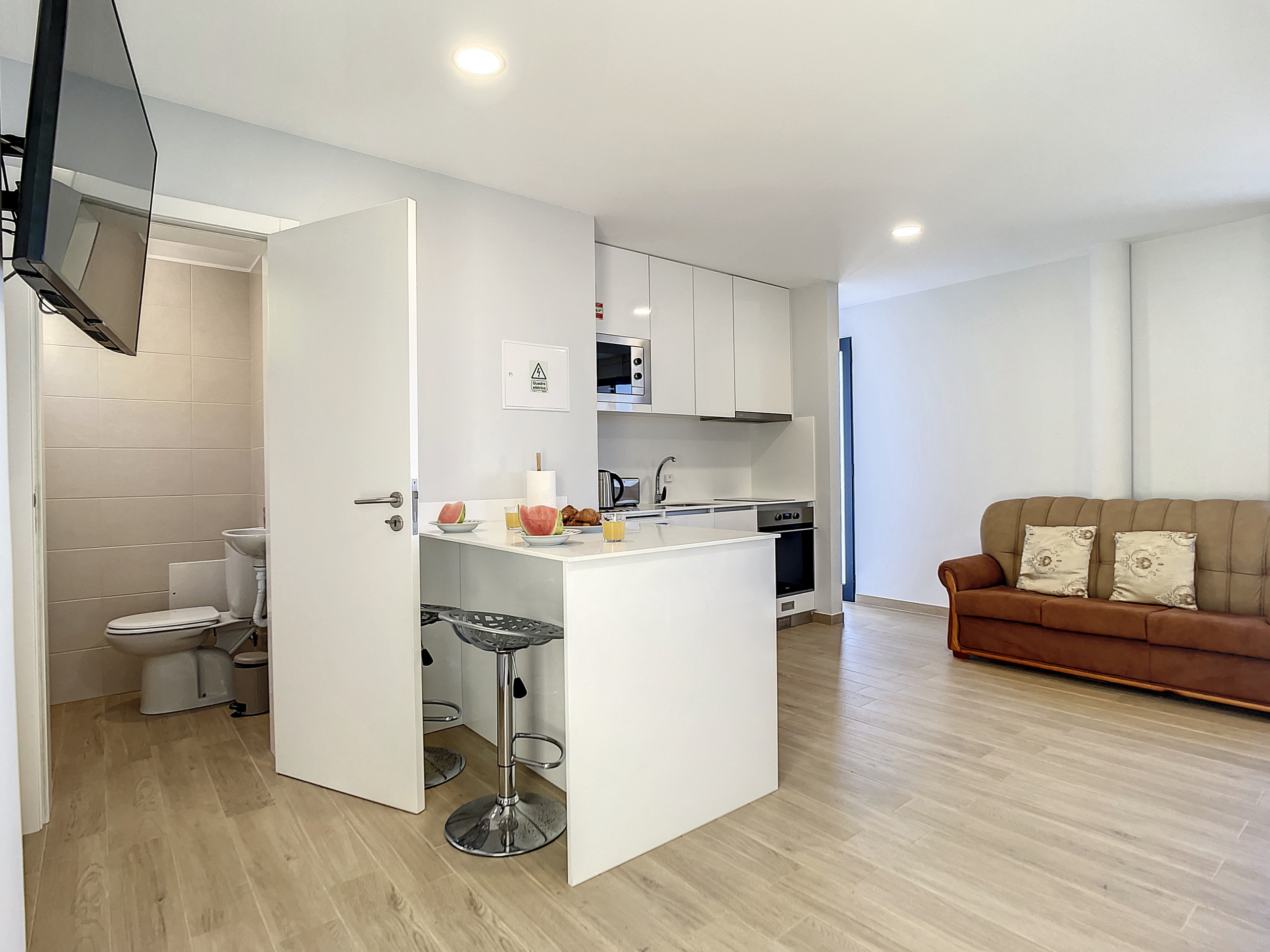 The apartment hosts a tranquil bedroom with a queen-size bed and an open-plan living space offering a serene environment to relax. The balcony, a sun-dappled haven, is perfect for unwinding and absorbing Madeira's pleasant climate.